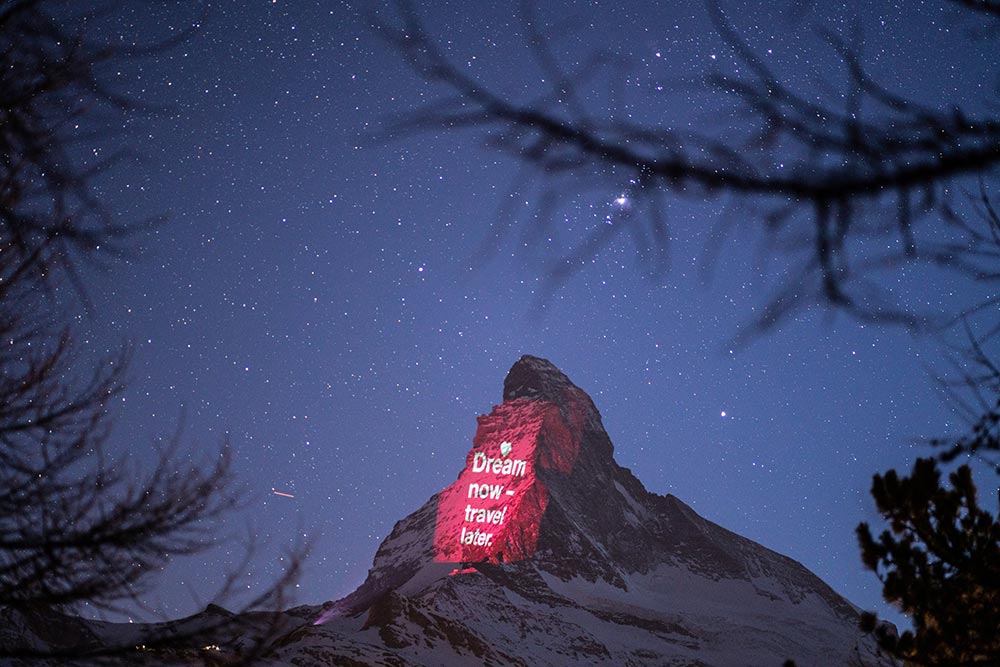 Toda noite o artista Gerry Hofstetter tenta levar uma mensagem de esperança e solidariedade ao projetar no pico do monte Matterhorn (nome em alemão), na fronteira entre Suíça e Itália, mensagens e bandeiras dos países.