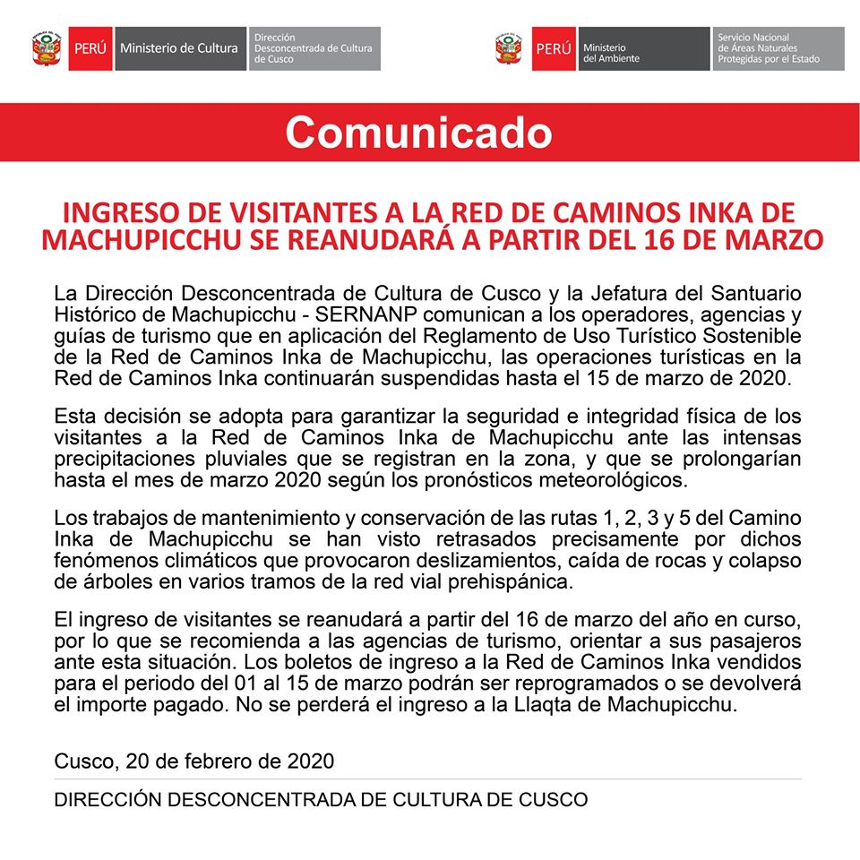 Sobre a reabertura da Trilha Inca, o órgão informa que os boletos vendidos aos turistas para o período de 1 a 15 de março poderão ser reprogramados ou poderá haver reembolso. Os ingressos para a Llaqta (cidadela) de Machu Picchu não serão perdidos, segundo comunicado feito no dia 20 de fevereiro.