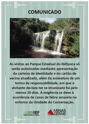 A administração do Parque Estadual do Ibitipoca, área florestal que fica no município de Lima Duarte, em Minas Gerais divulgou nota em sua página oficial no Facebook alertando às pessoas que queiram visitar a unidade da necessidade de apresentação da carteira de identidade e do cartão de vacina atualizado, além da assinatura de um termo de responsabilidade, no qual o visitante declara ter sido imunizado há pelo menos 10 dias contra a Febre Amarela.