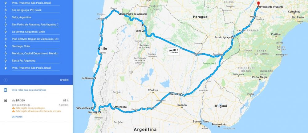 Fala ai galera, beleza? Não sou um membro muito ativo aqui no Mochileiros, mas tirei daqui minhas informações básicas para a melhor viagem que fiz em toda a minha vida. Em dezembro de 2017 e janeiro de 2018 realizei um sonho antigo que era o de viajar de carro pela América do Sul. Após 1 ano de planejamento, era hora de pegar o carro e sair por aí. Compartilho com vocês meu relato da viagem e agradeço de forma geral à todos que contribuíram para que isso realmente acontecesse e de modo direto ou indireto contribuiu para esse momento inesquecível da minha vida. Aproveito e me coloco à disposição para responder qualquer pergunta sobre meu roteiro, fique à vontade. Eu fiz meus relatos baseados naquilo que estava vivendo no momento, então eles não obedecem um critério ou roteiro específico, foi realmente aquilo que aconteceu durante minha viagem, então já me desculpo por erros de português, concordância ou divagações, tudo aqui é do coração mesmo. A viagem foi feita junto com minha esposa, Marcela e minha mãe, Dalva. Em alguns dias, minha irmã Camila se juntou à nós. Quem quiser acessar, deixo o blog que escrevi para deixar registrado tudo aquilo que vivemos. Não vou postar as fotos aqui, pois não quero deixar o post muito carregado (já tem muita informação escrita hehe), quem quiser conferir as imagens, elas estão no blog. https://maladaminhamae.blogspot.com.br/ Bom, vamos lá! ____________________________________________________________________________________________________________________________________________________________________________ Roteiro Definido! Dia 20/12 estaremos partindo para nossa viagem pela América do Sul, ao todo serão 31 dias de viagem onde esperamos encontrar destinos marcantes, pessoas incríveis e lugares inesquecíveis. Essa viagem foi planejada ao longo de 2017 e pensamos em fazê-la no estilo "low cost", porém, sem passar nenhum "perrengue". Nosso destino final será a cidade de San Pedro de Atacama, mas até chegar lá, vamos dar uma volta por parte do cone sul e depois retornar para Limeira-SP, abaixo seguem as datas de onde estaremos. 20/12 - Limeira a Joinville 21/12 - Joinville a Porto Alegre 22/12 - Porto Alegre a Montevidéu 23/12 - Montevidéu (Colônia del Sacramento) 24/12 - Montevidéu 25/12 - Montevidéu (Punta del Leste) 26/12 - Montevidéu a Buenos Aires 27/12 - Buenos Aires 28/12 - Buenos Aires 29/12 - Buenos Aires 30/12 - Buenos Aires a Neuquén 31/12 - Neuquén a Bariloche 01/01 - Bariloche 02/01 - Bariloche a Pucón 03/01 - Pucón 04/01 - Pucón a Santiago 05/01 - Santiago 06/01 - Vina del Mar e Valparaiso 07/01 - Santiago 08/01 - Santiago a Copiapó 09/01 - Copiapó a San Pedro de Atacama 10/01 - San Pedro de Atacama 11/01 - San Pedro de Atacama 12/01 - San Pedro de Atacama 13/01 - San Pedro de Atacama a Salta 14/01 - Salta 15/01 - Salta a Resistência 16/01 - Resistência a Assunção 17/01 - Assunção 18/01 - Assunção a Salto del Guaira 19/01 - Salto del Guaira a Londrina 20/01 - Londrina a Limeira 20/12 - Limeira a Joinville Hoje iniciamos nossa viagem, saímos de Limeira por volta das 05:30 e chegamos em Joinville as 14:00. Pegamos o trecho novo da Serra do Cafezal que está excelente estado, com exceção de um trecho de menos de 5km que ainda não foi recapiado. Pista com movimento intenso, porém sem congestionamentos e trânsito fluindo normalmente. Tempo nublado o caminho todo, porém, sem chuva. Ao todo foram 3 paradas, 1 para abastecimento, 1 para o café da manhã e a terceira para uma ida rápida ao banheiro. Em Joinville estamos hospedados No Hotel Dois H que fica próximo da BR. Hotel recomendado. Almoçamos num restaurante muito simples em frente ao hotel, chamado Cantinho dos Amigos, comida boa e barata, é servido uma carne à escolha do cliente, com acompanhamento de salada, pão e maionese, recomendo também. A janta foi o que sobrou da costela do almoço com pão e queijo, delícia! Agora é descasar a noite para amanhã bem cedinho sairmos em direção à Porto Alegre 21/12 - Joinville à Porto Alegre Saímos de hotel por volta de 7:30, após um bom café da manhã, como o hotel ficava às margens da rodovia, foi muito rápido o trajeto até a BR. A viagem transcorreu muito bem, sem chuva e o dia que amanheceu nublado, logo abriu. Paramos para conhecer um pouco da cidade de Torres já no RS, conhecemos a praia da Guarita e almoçamos num simpático lugar chamado "Restaurante da Cal", comida boa, com preço melhor ainda, R$26,00 por pessoa com direito à massas à vontade, mais galeto, polenta e maionese. Após o almoço, partimos para Porto Alegre e nos hospedamos no Tri Hotel, bem fraco, com quarto de tamanho bom, porém, com instalações muito antigas e sem conservação Neste dia jantamos um "Xis" no restaurante Cavanhas, lanche gostoso, mas nada demais, o valor de R$ 18,00 só o lanche. Depois, fomos até o mercado comprar algumas coisas e voltamos ao hotel para descansar e pegar o próximo dia de estrada. 22/12 - Porto Alegre a Montevidéu Acordamos cedo, logo as 6:30. Café tomado, carro carregado era hora de partir para Montevideo. Até Porto Alegre toda a rodovia era duplicada, porém partindo para o Uruguai ela se torna simples e mesmo com pedágios caros ela é mal conservada. Por questão de tempo, escolhemos entrar pela fronteira de Jaguarão ao invés do Chuí, que é a mais utilizada pois vai margeando todo o litoral do Uruguai até Montevideo. Foi uma boa escolha, a aduana estava muito tranquila e em menos de 15 minutos já estávamos de volta ao carro para prosseguirmos viagem. Foi então que veio a sensação de estar em meio ao "desconhecido" mesmo estando à poucos km do Brasil, é uma sensação diferente. Prosseguimos viagem pelos pampas uruguaios, somente alguns vilarejos e muitas pastagens. Foi uma boa decisão ter abastecido em Jaguarão pois o primeiro posto depois da aduana está a mais de 100 km. Nossa parada para o almoço foi na cidade de Trin