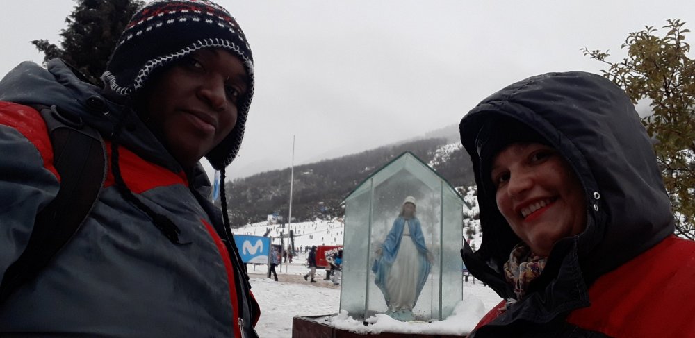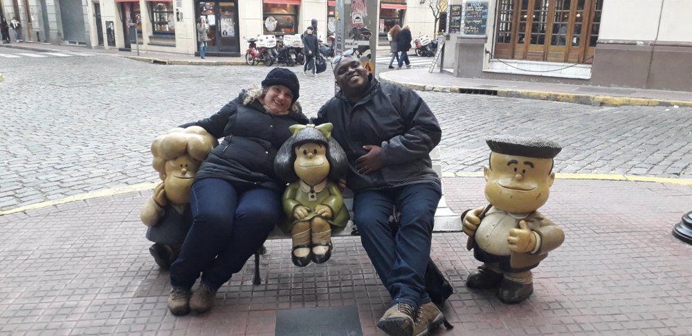 Mochilão Bariloche Aproveitando a quarentena para escrever esse relato... E lá vem textão... Moramos em cidade do interior de São Paulo, sendo assim, fomos até à capital, onde pegamos o voo em Guarulhos (GRU). O nosso voo foi pela Aerolineas, no período da manhã. Fizemos uma escala de um dia em Buenos Aires (R$1.338,15 cada passagem + bagagem). Buenos Aires- 19/08/2019 Chegamos em Buenos Aires por volta das 11:00 horas, desembarcamos no Ezeiza (EZE), ele estava em reforma, mas mesmo assim é muito bonito; ficamos mais de 2 horas e meia na Aduana. Saindo da Aduana, trocamos R$2.200,00 deu mais de 29.000 pesos (13,20) no Banco Nacion, dentro do próprio aeroporto. Pegamos um transfer gratuito, por voamos pela Aerolineas, o Tienda Leon. Descemos no Terminal Madero. Ficamos em um hostel muito aconchegante e bem simpático, o 06 Central Hostel (US$25,70/ R$3,74 cada dólar), fica perto do Terminal Madero. Deixamos os mochilões e saímos para explorar. Caminhamos até o Obelisco e o letreiro BA. Seguimos nossa caminhada até San Telmo para visitar a Mafalda e seus amigos Susanita e Manolito. Paramos para comer em uma loja que vendia empanadas muito saborosas, Empanadas Express, tem várias promoções bem baratinhas (nos tirou a má impressão que ficou quando comemos empanadas na Cataratas Del Iguazú). Com a barriguinha cheia voltamos a explorar, caminhamos até a praça da Casa Rosada e em torno. Já estava bem frio. Queríamos ir até o Porto Madero, mas resolvemos olhá-lo do alto mesmo; o frio já começava a castigar os brasileiros acostumados com o calor. Resolvemos voltar para hostel. Antes de entrar no hostel resolvemos parar para jantar na Pizzéria Podestá, que fica na esquina do hostel, fomos muito bem atendidos, o garçom conversou, brincou e até tirou dúvidas. Terminando o jantar, voltamos para o hostel para descansar, pois, nosso voo para Bariloche era pela manhã. Buenos Aires/Bariloche- 20/08/2019 Saímos do hostel por volta das 06:30 h, pegamos um Uber até o Aeroparque (AEP), tivemos que ir até a Pizzéria Podestá, pois ele não podia entrar naquela rua par nos pegar na porta. No aeroporto, tomamos café no McDonald’s, cappuccino com medialunas (a atendente perguntou ao meu marido se podia ser com grasa, mesmo sem saber o que era ele falou que sim (grasa é uma calda de açúcar). Fizemos check-in, e fomos para a área de embarque, até aí tudo calmo...aí chegaram os egresados (formandos da Argentina); um monte de adolescentes barulhentos e bagunceiros. Na hora do embarque eles passam na frente para entrar no avião, ocuparam quase todo o bagageiro, muitos passageiros tiveram que despachar suas bagagens de mão (é claro que isso não foi cobrado, mas é bem chato e inconveniente). Durante o voo eles fizeram muita algazarra, algumas bem nojentas por sinal; o voo de Buenos Aires até Bariloche, que é de aproximadamente 2 horas, parece que demorou mais que o voo de Guarulhos par Buenos Aires, que é +ou- 3 horas tamanha era a gritaria dos adolescentes. Quase chegando ao Aeroporto de Bariloche (BRC), alguns flocos de neve já se formavam nas janelas. Pousamos, pegamos nossa bagagem e entramos na fila para pegar um taxi até o hostel (430 pesos). Em Bariloche ficamos no Italia Inn Hostel (US$235,37/ 7 diárias), pagamos uma taxa de 120 pesos de preservação. Ele fica bem localizado na Avenida 12 de outubro, próximo a rodoviária, uns 30 minutos de caminhada até a Rua Mitre, tem um ponto de ônibus em frente, na mesma calçada tem outro ponto em frente a mercearia onde compramos o SUBE (140 pesos/ 1ª recarga 500 pesos), na rua de traz tem o Supermercado TODO. O pessoal do hostel é bem bacana. Deixamos os mochilões e saímos para explorar. Caminhamos até a Mitre, procurando algum lugar para almoçar, pois já eram quase 3:00 h, e muitos restaurantes servem almoço até as 2:00 h. Encontramos um restaurante pequeno e muito bonitinho, o Restaurante Cazuela, que ainda estavam servindo almoço; meu marido pediu um talharim ao molho de camarão, eu pedi uma milanesa de frango com fritas, bebemos um vinho indicado pela casa muito bom “1326” - Premium Malbec- 2018, a comida e atendimento eram bons (1.100 pesos). Depois do almoço, fomos conhecer um pouco mais da Rua Mitre. Alguns estabelecimentos estavam fechados para a sesta (podendo fechar de 2 a 4 horas após o meio dia). Estávamos procurando uma loja de telefonia par comprar um chip. Achamos uma loja da Movistar (que não fechava para a sesta), pedimos para comprar um chip, mas a atendente nos deu e, então compramos somente o pacote de dados para 7 dias por 130 pesos/ 2GB (o 4G pega até no meio da neve, no alto dos cerros). Para ativar nosso chip ainda usamos o Wifi da loja; esse pacote de dados deu até o final da nossa viagem; meu marido roteava o meu celular e falávamos com nossas famílias no hostel, usando o Wifi de lá, assim economizávamos o nosso pacote de dados. Enquanto meu marido terminava de cadastrar o chip, saí da loja e fui esperar do lado de fora, de repente começou a chover bem fininho e nevar, eu fiquei toda feliz vendo água-neve. Depois fomos cotar preço de roupas de neve; vimos em várias lojas, ficamos com a última (no princípio não gostei muito dela, até fiquei brava, mas passou). Essa loja fica em uma das muitas galerias da Mitre. Alugamos dois conjuntos completos: calça, jaqueta, luvas, botas e óculos, ficou 1400 pesos por 2 dias. Andamos mais um pouco e paramos no McDonald’s para experimentar o cono relleno, é um sorvete de casquinha com dulce de leche quentinho, uma delícia (45 pesos cada). Descemos até a Catedral de Nuestra Señora del Nahuel Huapi, para participar da Santa Missa. Após a Missa, voltamos para o hostel, estava muito frio, chovendo e ventando bastante; no caminho passamos em uma padaria e compramos um lanchinho para a noite (125 pesos). Bariloche- 21/08/2019 Acordamos e descemos para tomar café da manhã, achei o café bom e variado, termina
