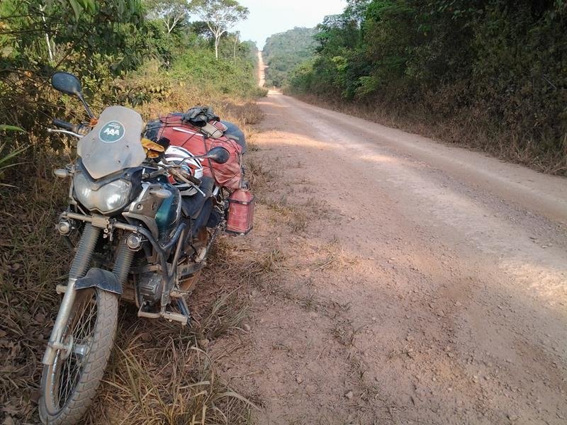 Expedição Amazônia A Amazônia é uma região do país que sempre me despertou muita curiosidade. Sempre tive muita vontade de conhecer esta região de floresta. Depois que comecei a realizar viagens de moto comecei a pensar em uma pela região. Depois de ler vários relatos de viagens pela Amazônia, comecei a planejar uma pelas estradas de terra das rodovias Transamazônica e BR 319, que liga Porto velho a Manaus. Lancei esta ideia em um grupo de WhatsApp e de imediato 5 amigos confirmaram a participação. Como nós não tínhamos experiência de pilotagem em estradas de terra e areia, resolvemos marcar uma viagem de treino pela região do Jalapão, no estado do Tocantins (Pode conferir esta viagem aqui). Depois desta viagem 4 dos integrantes iniciais aventura desistiram devido as dificuldades enfrentadas nas areias do Jalapão. No fim restaram apenas meu amigo Adriano Tamietti e eu para encarar este desafio. Comecei os preparativos escolhendo uma moto para encarar o terreno off road. Todas as viagens que tinha feito até o momento (Patagônia 2015 e Atacama 2016) foram feitas em uma Honda Shadow 750. E estava claro que não dava para ser na Morena (nome da moto). A princípio comprei uma XRE 300, uma moto de baixa cilindrada mas leve e ágil. Estava satisfeito com ela até o momento que ela trincou o cabeçote (problema crônico das XRE 300). Retifiquei o cabeçote, fiz uma manutenção geral, mas minha confiança na máquina acabou. Comprei então uma Teneré 250 2017 muito nova. A mesma moto usada pelo Adriano. Esta moto já veio com protetor de motor. Instalei um baú traseiro e um suporte de baús laterais. Neste suporte instalei uma grade para transportar um galão de combustível de 5 litros e do outro lado adaptei um alforje de couro que eu usava em minha Shadow. Instalei um par de faróis de milha em led e uma tomada 12 volts. Fabriquei e instalei também um porta ferramentas usando um tubo de PVC de 100 milímetros. A máquina estava pronta para o desafio. Quanto a itens de segurança pessoais, iria usar uma armadura para motocross, joelheiras articuladas, luvas de couro cano longo, calça e jaqueta de cordura. Um capacete tipo motocross e óculos de proteção, apesar do capacete ter viseira. A poucos dias do início da aventura meu cunhado Amerizon disse que queria ir. Mas não tinha moto, nenhum equipamento de proteção e nenhuma experiência em viagens de moto. Eu disse que a moto não era problema pois eu tinha a XRE 300, aquela que havia trincado o cabeçote, e que venderia para ele. Só não podia garantir que ela iria aguentar o desafio. Equipamento de proteção era barato e que se podia comprar em qualquer loja. E a experiência ele iria adquirir durante a viagem. O maluco topou. Depois de oito meses de muita ansiedade preparação finalmente o dia de partir havia chegado. Eu e o Amerizon moramos em Goiânia, o Adriano em Brasília. Combinamos de nos encontrar em Uruaçu, Goiás a 300 km de Goiânia, na quinta feira 7 de setembro de 2017. Combinei com o Amerizon de me encontrar com ele na casa dele na quarta feira as cinco e meia da tarde para sairmos as seis. Saí do trabalho as cinco e já fui para lá. Chegando lá o cara não estava. Tinha saído para comprar os equipamentos de proteção e só chegou as seis e meia. Até que ele se aprontou, arrumou a moto, se despediu da família e finalmente conseguimos sair, já eram nove horas da noite. Tínhamos combinado com o Adriano que iríamos sair de Uruaçu quinta as seis da manhã. Ou seja, nós tínhamos que viajar 300 km para encontrar com ele. A viagem apesar de ser a noite foi muito tranquila. O tempo estava fresco, a rodovia estava vazia e conseguimos manter uma velocidade média de 100 km/h. Meia noite e meia estávamos tomando uma Heineken gelada em um posto na cidade de Uruaçu. Fomos para casa de minha irmã, onde passamos o resto da noite. Levantamos as cinco e às seis horas já estávamos no local combinado, onde encontramos o Adriano. Calibramos os pneus das motos e pegamos a BR 153 com destino a Colinas do Tocantins, onde iríamos pernoitar. A rodovia, famosa por seu intenso tráfego de caminhões estava relativamente vazia, o que fez a viagem render bastante. O calor neste dia estava muito intenso. A impressão era que um secador de cabelo gigante estava soprando na gente o tempo inteiro. Com todo aquele equipamento de proteção a coisa ficava pior ainda. Depois de rodar 600 km chegamos a Miranorte, no estado do Tocantins, onde paramos para descansar em uma tenda de frutas. Que vendia sucos, abacaxi e melão gelados. Realmente estávamos precisando. Logo chegamos a Colinas e como estava muito cedo ainda resolvemos tocar até Araguaína, onde nos hospedamos no Mais Hotel. Estava acontecendo um encontro de motociclistas na cidade, mas como estávamos muito cansados decidimos dormir para sair bem cedo no outro dia. Combinamos de tomar o café da manhã que era servido a partir das seis e voltar a estrada. Só que eu perdi a hora. Coisa rara de acontecer. Isso atrasou um pouco nossa saída, mas como frisou o Amerizon, estamos em férias. Tomamos um café reforçado e voltamos a 153 com destino a... onde mesmo? Era para ser Marabá, já no estado do Pará. Estávamos 100 km adiantados em nosso roteiro, então deixamos de lado a programação original e resolvemos que iríamos tocar até onde desse. Um pouco antes de Xambioá, parei para tirar umas fotos e os caras sumiram na minha frente. Por mais que eu acelerasse não conseguia alcança-los. Chegando a Xambioá fui até a Balsa para atravessar o rio Araguaia. Nada de encontrar os dois. Perguntei na balsa se tinham passado por lá e me informaram que não. Esperei um pouco ali e nada deles chegarem. Resolvi dar uma volta pela cidade. Parei em um hotel onde me deram a senha do wifi e tentei me comunicar com eles pelo WhatsApp. Não responderam. Liguei várias vezes e nada. Sentei em uma cadeira e esperei um bom tempo até que enfim apareceram. Nessa