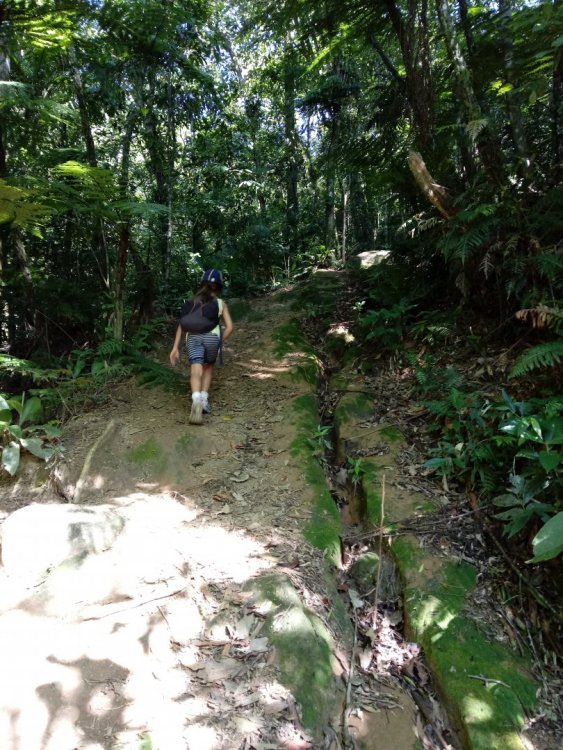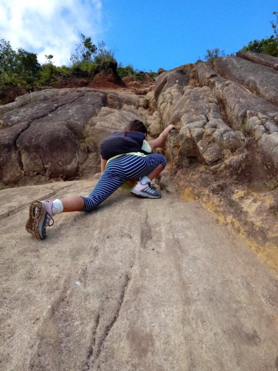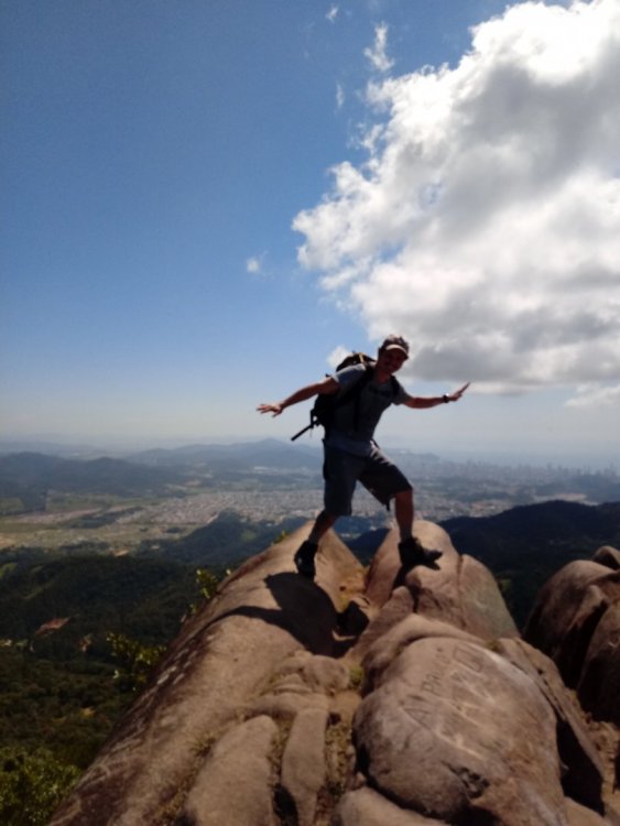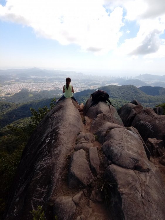Pico da Pedra - SC - março/2019 Este pico tem 680m e esta na região de Balneário Camboriú-SC. Do topo é possível avistar desde a praia de Gravata ao lado de Penha até a ponta norte da ilha de Florianópolis. Mas a vista privilegiada é da Balneário Camboriú e itapema que estão logo abaixo com todo aquele mar ao redor. Desta vez fiz a trilha com minha filha de 8 anos que foi super de boa levamos 1h45min, sozinho faço em 1h. De carro passe pela Av. Rio Amazonas em Camboriú-SC em direção a Itapema via estrada velha, mantenha-se sempre a direita nas bifurcações acompanhando o rio a direita também. Já fiz de bike algumas vezes, é um bom rolê. A estrada sobe uma serra e termina no sítio Brilho Verde. Uma casa rural com excelente estrutura, tendo banheiros, estacionamento, serve pastel e caldo de cana. Muito organizado e limpo. A trilha começa aí, no começo uma leve subida ainda em estrada, passa por uma pedreira de mármore e logo adiante se fecha em trilha dentro da mata. A primeira parte a subida é leve. Depois de uns 20min aparece uma bifurcação siga a esquerda pois a direita leva a uma area rural do outro lado do pico. Mais adiante vem uma parte plana passando num belo jardim de mata Atlântica. Agora começa a subida são 4 lances pelas raizes e erosões. Utiliza um pouco as mãos mas bem de boa. O último lance já é no topo uma rampa de pedra exposta resultado da erosão de tantas pessoas q ali passaram. No topo a vista é magnífica. Podendo avistar todo o litoral.