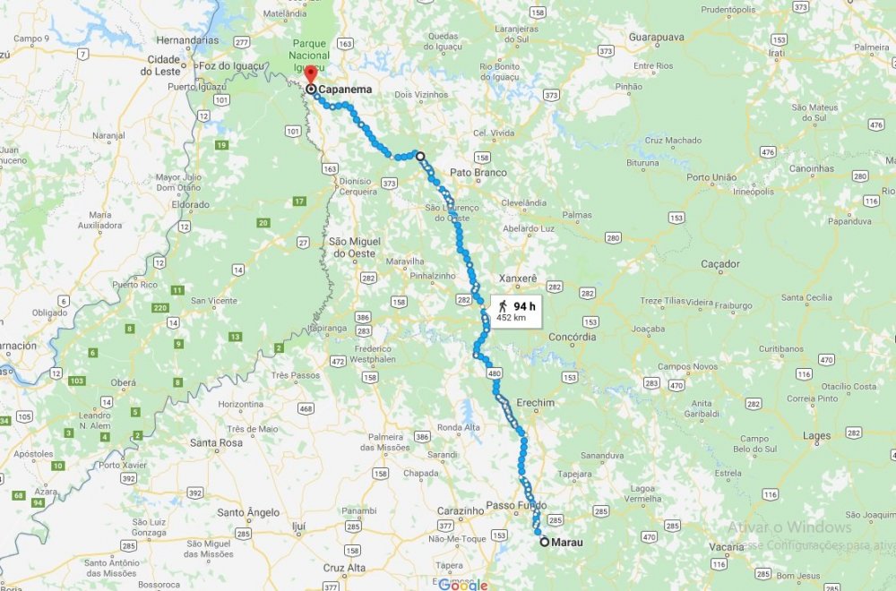 Mochilão 452 km, Marau - RS a Capanema - PR, Carona + Trekking ''Esta vida é uma viajem, pena eu estar só de passagem'' (Paulo Leminski). A ideia já estava gravada na minha cabeça a dias, mas o empurrão surgiu após uma viajem para Marau no Rio Grande do Sul. Pois bem, começou assim... Quarta-feira, 30 de janeiro de 2019. Estava a 15 dias viajando na casa de um amigo no município de Marau no estado do Rio Grande do Sul, um município que foi colonizado pelos italianos, e que apresenta algumas belezas próximas como a Cascata do Maringá (FIGURA 1) no município vizinho Vila Maria e o Perau de janeiro em Arvorezinha, ambos próximos a Marau. Figura 1. Parque da Cascata do Maringá - Vila Maria - Rio Grande do Sul Uma viajem para esquecer certos problemas e conflitos surgidos, mas também para adquirir novos conhecimentos. Após dias de reflexão decidi voltar para meu município de destino, Capanema no sudoeste do estado do Paraná. Em pesquisas e conversas decidi arriscar o meu primeiro mochilão até chegar em casa. Seriam 452 km de Marau - RS até Capanema - PR (FIGURA 2). Quinta-feira, 31 de janeiro de 2019. A noite foi pensativa, acordei 08h00 da manhã e o sono se foi, talvez o pensamento já estava acelerado naquele momento. Sai de Marau as 09h00 da manhã, meu amigo me levou até um posto de caminhoneiro e de lá consegui a minha carona. Essa carona por vez foi já pré-estabelecida no dia anterior. De Marau a Francisco Beltrão no Paraná era o destino do caminhoneiro! Saindo de Marau e chegando por volta das 10h00 em Passo Fundo - RS o caminhoneiro teria que carregar para seguir viajem, como todo bom mochileiro a espera determina uma boa estratégia. Aguardei até as 14h00, até finalizar o carregamento da carga. Pois bem, tudo finalizado! Seguimos viajem. Conhecendo um pouco das paisagens e do famoso Rio Uruguai, que divide o Rio Grande do Sul e Santa Catarina, foi algo maravilhoso, mas não foi apenas paisagens que me enchi os olhos! Uma das cidades mais limpas por onde passei, com ruas sem nem um resíduo! Formosa do Sul - SC, a cidade sem sujeira (apelidado por mim naquele instante) e um dos lugares onde a arborização urbana com certeza é uma das melhores. Na saída da cidade se deparamos com um grupo de ciclistas, que decidiram nos acompanhar! Parecíamos caminhão de escolta, e olha que os ciclistas pedalaram para valer. Nossa viajem seguiu após despedidas aos ciclistas, nesse meio tempo surgiram diversas conversas entre eu e o motorista do caminhão, e o assunto principal foi o desastre acontecido em Brumadinho, uma tragédia que ocorreu por falta de fiscalização e principalmente por negligencia, mas não vem ao caso no relato de agora. Pedi ao motorista sobre quais postos de combustíveis eram próximos ao seu destino final, ele me informou que havia um próximo ao destino, e que ali seria um bom lugar para pedir mais uma carona, paramos então no posto e eu com um sorriso, mas um medo interno fui a procura de encontrar uma carona! Alguns evitaram, outros não podiam me levar, mas não me frustrei pois como primeiro mochilão estava ciente dos obstáculos que iria enfrentar pelo caminho, então seguimos até o destino final do motorista, Francisco Beltrão no estado do Paraná. Chegamos por volta das 21h30 e pedi ao motorista para me deixar em frente ao posto da Policia Militar Rodoviária, que por sinal me ajudou muito. Chegando ao local me despedi do motorista que horas antes até me ofereceu água comida e fez questão de comprar um salgado de strogonoff que segundo ele a vendedora lhe enganou, afirmando que era strogonoff, mas não, pois não continha batata palha segundo o motorista. Cheguei no meu primeiro destino, o Posto da Policia Militar Rodoviária de Francisco Beltrão - PR. E agora o que fazer? Me aproximei da guarita e por sorte lá está um policial de plantão, perguntei a ele com base no que já tinha pesquisado antes da viajem se o mesmo teria um papelão e um canetão, ele me olhou meio '' o que será que ele vai fazer'', mas expliquei tudo e por sorte ele me forneceu o material. Na mesa do posto da polícia comecei a escrever meu próximo destino no papelão, REALEZA, com uma caligrafia não muito legível perguntei ao policial se o mesmo entendia o que estava escrito e que se estava grande o suficiente para os motoristas verem, ele disse que si! E logo me perguntou o que eu estava fazendo. Disse para ele que se tratava de um mochilão! Logo em seguida ele me disse que não faria isso nem que lhe pagassem pois na sua profissão só lhes chamavam quando ocorria algo de ruim. Pensei que talvez seja por isso que esse policial não faria algo assim! Mas achou corajosa a minha atitude. Durante a escrita no papelão conversamos, mas uns 5 minutos, disse de onde sou e o que faço da vida, no final agradeci o policial que me desejou boa sorte. Na frente da Policia com receio e um pouco de vergonha, mas pensando e deixando tudo de lado ergui o papelão escrito o nome do meu destino e comecei a pedir carona. Passou um caminhão, cinco carros e eis que surgi um salvador. Ele leu o que testava escrito no papelão, pois próximo ao posto da polícia os condutores são obrigados a diminuir a velocidade e isso facilitou a visualização da minha péssima caligrafia. O motorista parou cerca de 100 metros à frente e lá fui eu, com um sorriso no rosto por ter conseguido, mas ao mesmo tempo ciente que as vezes pode demorar mais ou menos essa busca. O meu demorou 5 minutos! Cumprimentei o motorista e o mesmo disse que iria para Lindoeste um município do estado do Paraná que sua família residia. - Eu conheço a cidade pois já tinha passado várias e várias vezes por lá, disse ao motorista. E sabia que a mesma era após o meu destino escrito no papelão, mas como ele iria para um lado e eu para o outro fiquei pelo trevo de Realeza mesmo. Com esse motorista conversamos apenas sobre a vida, vida essa minha que iria mudar na próxima carona. Após chegar