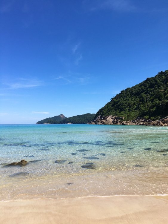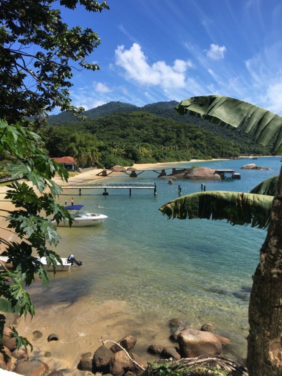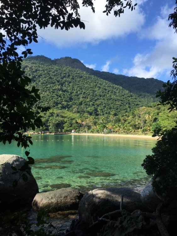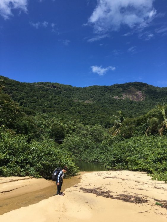 Esse é um relato de uma volta quase completa por Ilha Grande. Primeiramente, queria agradecer o @Augusto por fazer o guia definitivo das trilhas de Ilha Grande (https://www.mochileiros.com/topic/1171-volta-completa-de-ilha-granderj-uma-caminhada-inesquec%C3%ADvel/). Salvei o relato e não tivemos problemas em realizar as trilhas. Então, esse relato não tem nenhuma pretensão em ser mais preciso ou descrever minuciosamente as trilhas, isso já foi muito bem feito pelo @Augusto . A ideia aqui é tentar transmitir as sensações que tive ao realizar a minha volta por Ilha Grande e tentar acrescentar algumas informações. Na minha visão, é possível realizar a volta (isso falando apenas da orientação no percurso) pela Ilha Grande tendo em mente apenas três coisas. A primeira é levar o relato do @Augusto , ele descreve muito bem as passadas das trilhas, os lugares e tudo mais. No meu caso, salvei o relato no celular e foi muito útil, principalmente nos dois primeiros dias, quando ainda não estávamos familiarizados com as trilhas. A segunda dica: no caso de dúvida siga à rede elétrica. A terceira, a mais importante, é interaja com as pessoas locais, em todas as comunidades da ilha haverá pessoas e todas elas conhecem as trilhas de acesso a comunidade em questão. Todas as pessoas que tivemos contato ajudaram-nos com informações e detalhes valiosos sobre as trilhas. Agora vamos ao relato! Desde a minha última viagem vinha pensando em qual seria o meu próximo destino, pois a data da viagem iria ser pelo final de ano. Queria algo não muito longe. Pensei na Serra da Canastra, Serra da Bocaina, Parque do Itatiaia e Paraty. Confesso que estava pendendo pelo Itatiaia, mas algumas lembranças vieram a tona e fizeram-me mudar de decisão. Agora estava decidido, seria Ilha Grande o destino e iria dar a volta na ilha. Das lembranças que alteraram o rumo da viagem, foram apenas vozes de uma amiga que sempre dizia-me para fazer a volta na ilha e naquele momento essas vozes me soavam como um chamado. Fazia alguns anos que eu viajava sozinho e mal planejava minhas viagens, apenas me deixava ir. Porém, final de ano é complicado, todos os destinos são invadidos por centenas/ milhares de pessoas, tudo fica mais escasso e os preços são todos mais altos. Ano passado já tinha me frustrado por não me organizar nessa data do ano e tive que mudar de última hora o meu destino. Dessa vez não cometeria o mesmo erro e teria que voltar a fazer algum planejamento antes de sair de casa. Como teria que me planejar porque não ter companhia? Fiz-me essa pergunta. A primeira pessoa que conversei sobre a viagem foi com o Vinicius, amigo que conheci no mestrado, e logo percebi que ele estava afim de fazer esse rolê por Ilha Grande. Depois entrei em contato com duas amigas que no primeiro momento tiveram interesse, mas com o tempo e outros planos não iriam conseguir embarcar nessa. Matheus é um velho amigo e está fazendo um mochilão de longa data pelo Brasil, falei com ele sobre a viagem e ele também animou de fazer parte da trupe. Assim, estava fechado o grupo: Eu, Vinicius e o Matheus. Dias antes de embarcar, pesquisei (no mochileiros.com) se haveria mais alguém fazendo a volta na mesma data e meio sem querer encontrei a Jordana. Ela estaria na ilha nas mesmas datas e estava procurando companhia para dar a volta na ilha. Entrei em contato com ela e consequentemente o grupo tinha mais uma nova integrante. Agora, éramos quatro. Confesso que não houve um super planejamento. O plano resumiu-se a levar comida para os primeiros dias, comprar as passagens para Angra com antecedência e ler alguns relatos. No entanto, é importante comentar que a decisão de fazer a volta na semana do Natal foi a mais acertada de todas, pois na semana entre o Natal e Ano Novo a maioria dos campings estavam trabalhando com pacotes e os preços aumentavam substancialmente devido a grande procura. Em questão de economia acho que o maior acerto da volta foi ser realizada entre os dias 20-27 de dezembro e não dos dias 27-02 como pensado inicialmente. Era uma terça-feira. Acordei cedo. Organizei minhas coisas, aprontei minha mochila e o relógio ainda marcava 09:00. A passagem para São Paulo era só para as 16:00. A ansiedade para mais um trekking era grande. Ouvi música, vi televisão e o tempo passava devagar. Às 13:30 decidi que era hora de partir, caminhei até a rodoviária. Lá fiquei esperando o tempo que restava. Sentei no ônibus que estava praticamente vazio. Li um pedaço do livro que eu levava comigo. Cochilei. Quando a marginal Tietê se tornou a paisagem na janela do ônibus percebi que, enfim, a viagem tinha começado. Na rodoviária de Sampa, logo encontrei o Vinicius. Vinícius é um amigo que conheci no meu mestrado. Ele faz parte do mesmo laboratório no qual eu trabalho e já está no final do seu mestrado. Essa viagem seria a primeira dele nesse estilo. Ficamos esperando e conversando até o Matheus chegar. O Vinícius e o Matheus não se conheciam até então. Foi feita as formalidades e saímos para achar algum lugar para jantar. Matheus é um amigo de longa data. Fizemos graduação, estágio e nossos primeiros mochilões juntos. Hoje em dia ele está em um período sabático viajando pelo Brasil e relata suas aventuras em seu blog (http://fazeraquelasuaviagem.com.br/). Às 22:00 embarcamos no ônibus. Eu, como sempre, levei um livro que eu sabia que não iria ler durante o percurso na ilha. Comecei a lê-lo e dez minutos depois desisti. Estava ansioso. Tentei dormir e não consegui. Depois me senti em viagem escolar, por causa que quase todos os outros passageiros do ônibus se conheciam e a viagem foi seguindo com música e violão. Isso até despertar a ira dos passageiros restantes. Enfim, mal dormi naquela noite. Quando consegui cochilar o ônibus tinha adentrado Angra dos Reis. Ficamos um tempo na rodoviária. Depois seguimos para TurisAngra e assim conseguimos a autorização para