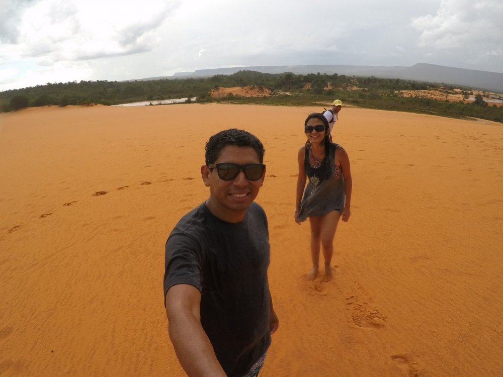 FEVEREIRO/2016 Quando cogitamos ir para o Jalapão, as referências que tínhamos eram poucas. Nenhum amigo tinha ido, e alguns nem sequer sabiam onde ficava, muito embora o destino esteja ficando cada vez mais conhecido. No primeiro relato que li na internet um casal contava que alugou um carro em Palmas, e passou perrengue logo no primeiro dia, quando o carro atolou. Eles disseram que deram muita sorte com um caminhão que passava e os ajudou, e depois foram pro bar e comemoraram o resgate. Rs. Chamou atenção o que motorista do caminhão disse pra ela durante a cena do socorro: O Jalapão é bruto! Vi ainda esta frase estampada na camisa de uma empresa de turismo, é um slogan chamariz do turismo de aventura. Concordo em parte com a frase. De fato o Jalapão não é para qualquer um. Eu diria que o Jalapão é um diamante bruto. Cada atrativo é um espetáculo incrível de delicadeza, são surpreendentes as cores, os formatos, as obras da natureza. E as pessoas, o povo jalapueiro, tem uma doçura rara. São acolhedores, tranquilos, tem sabedoria e conhecimento. No meio de um mato rasteiro chamado de cerrado alto estão leves depressões que não sao vistas claramente da estrada, e muitas escondem rios com cachoeiras e veredas de buritis, que só se revelam quando chegamos bem perto. No horizonte estão as chamadas serras, que são grandes chapadões onde é possível subir para assistir aos espetáculos do sol. No Jalapão você pode andar muitos quilômetros sem ver ninguém, e assim é o melhor jeito de conhecer. No entanto, isso só acontece fora de feriado. Um parêntesis para ressaltar que o Tocantins é o estado caçula da federação. Foi criado em 1989, pós-Constituição Federal. O lema atual do Governo do Estado (2016) é "livre iniciativa e justiça social". De fato, o que se observa é um estado com planejamento e orçamento para fazer acontecer. Um estado criado no reflexo da constituição cidadã, onde a presença estatal é robusta inclusive no interior, em lugares de difícil acesso, com presença da escola e posto de saúde municipais em todas as cidades por onde passamos. Um morador contou que a presença de uma médica boliviana do Mais Médicos foi fundamental na cidade (isso não é uma propaganda pró-governo, apenas um relato). Muito embora a máquina estatal pareça ser extremamente inchada, há muito espaço para a livre iniciativa, principalmente no turismo. Outra característica do estado recentemente criado é a ausência de influência robusta da Igreja Católica. Não se vê nas pequenas cidades a praça com uma igrejinha. O ponto central da cidade tem uma com o prédio da Prefeitura, e a religião que domina é a cristã evangélica. Escrevi nosso roteiro para facilitar os aventureiros de plantão. Dia 04/02 - chegamos tarde no aeroporto e fomos direto pro hotel. Dia 5/02 - sexta-feira Demos uma volta pra conhecer Palmas. Depois seguimos na direção do Jalapão. No caminho, logo no início da estrada, paramos na Cachoeira dos Macacos/Cachoeira do Roncador. Simplesmente muito bonita a cachoeira, principalmente a segunda. Um paredão enorme. Dizem que lota no final de semana, e que a tapioca é uma delicia na entrada da trilha. Seguimos viagem até Ponte Alta do Tocantins, onde paramos e almoçamos no Sabor de Minas, comida caseira. Depois do almoço fomos ao Cânion do Sussuapara, um lugar no meio da estrada, diferente de tudo que já vi. Parece que o chão abriu e as raízes das árvores fazem chover no buraco aberto. É lindo, cena de filme, água limpa. O Chico (nosso guia) explicou que tinha um poço que dava pra tomar banho, mas que teve um desmatamento próximo que assoreou o tal poço, que atualmente é só um pequeno caminho de água. Depois, fizemos check in na Pousada Águas do Jalapao, e aproveitamos a tarde na piscina, tomando cerveja (que compramos em Palmas antes de sair). No fim da tarde saímos pra ver o por do sol na Pedra Furada, que de fato é linda demais. Repelente é fundamental. Na volta, estávamos cansados demais, tomamos banho e dormimos cedo. Dia 06/02 - sábado Café da manhã delicia da pousada, e saímos pra tirar foto na entrada da cidade. Pegamos a estrada. Depois de 30km, sob um juramento de que não íamos demorar, o Chico fez uma surpresa no roteiro e saiu da estrada pra gente conhecer a cachoeira do Lajeado. As cachoeiras e rios aqui passam pela parte baixa do terreno, então não dá pra ver da estrada. Ela era diferente, o solo vermelho, a água geladinha, e as pedras lisas e planas. Foi bom pra refrescar deitados na pedra e tirar fotos. Mais 70 km e chegamos na Cachoeira da Velha, que fica dentro de uma propriedade que foi do Pablo Escobar e o governo atualmente administra a estrutura. A queda d'Água é grande e o visual bem bonito com a Serra do Jalapinha ao fundo. Descemos a trilha da queda d'Água até uma praia de rio, onde o Chico esperava a gente com um saboroso picnic. Experimentamos a paçoca de carne seca. Descansamos um pouco batendo papo, tranquilos no rio, e pegamos estrada novamente. Mais 60km até chegar às Dunas, e os arbustos do cerrado alto impedem de ver os atrativos de longe, mesmo sendo planalto com o horizonte lindo. Já na reta final é possível ver ao fundo a Serra do Espírito Santo com o Sacatrapo à sua direita. Tiramos muitas fotos, e ficamos encantados com a beleza da formação da serra. Subimos nas Dunas de areia bem dourada e de lá assistimos um lindo pôr-do-sol. Voltando pro carro, criamos inimizade com o Amauri, que no atrativo anterior tinha entrado no meio das nossas fotos (tanto espaço vazio pra ele tirar foto...), e depois acabou ouvindo a gente sacaneando ele no meio da trilha. Foi difícil não rir daquela situação constrangedora. Quem não riu foi o Amauri. Mais alguns quilômetros e chegamos em Mateiros, jantamos no restaurante da Tia Rosa, que serviu frango com pequi (fruta famosa do cerrado), e macarrão com feijão!! Hum... Ausência de limite resultou numa pass