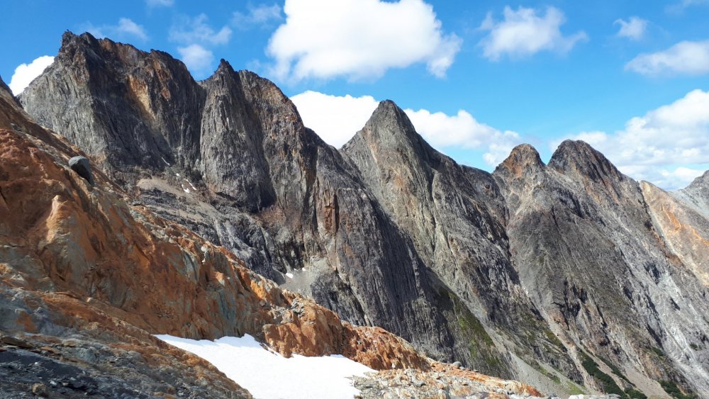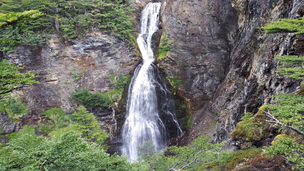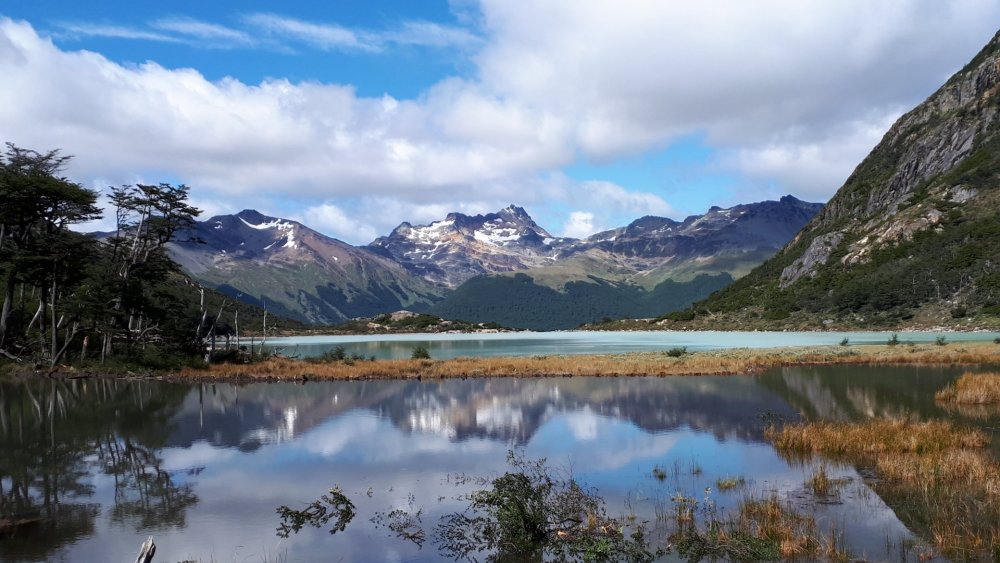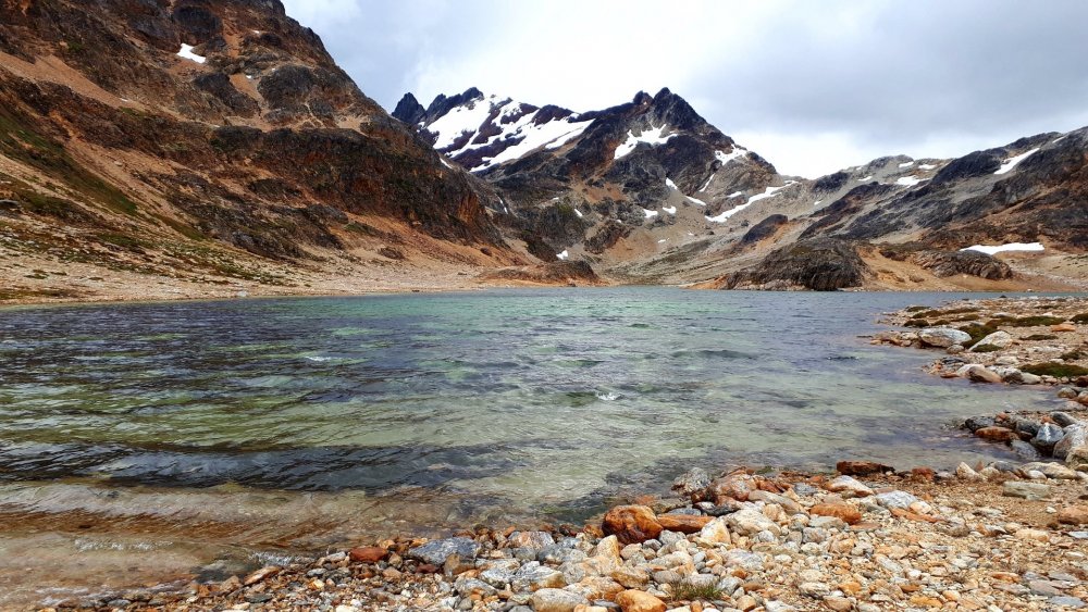 Laguna Esmeralda Início: estacionamento da Laguna Submarino na RN3 Final: estacionamento da Laguna Esmeralda na RN3 Distância: 28,5km Duração: 3 dias Maior altitude: 823m na neve do Glaciar Ojos del Albino Menor altitude: 220m no Rio Lasifashaj Dificuldade: média para quem está acostumado a longas travessias com mochila cargueira. Os desníveis não são grandes, a maior subida tem desnível de 433m. Nessa caminhada emendei duas trilhas: a da desconhecida Laguna Submarino com a da popularíssima Laguna Esmeralda. A princípio pensei que teria que caminhar pela RN3 entre a trilha de uma e de outra já que estão um pouco distantes e cada uma de um lado da rodovia, mas para minha felicidade descobri um caminho bem mais agradável por trilha e bosques. Por que o nome Submarino? Dê uma espiada na imagem de satélite do Google. 1º DIA - 31/01/20 - do estacionamento na RN3 à Laguna Submarino Distância: 6km Maior altitude: 642m na Laguna Submarino Menor altitude: 220m no Rio Lasifashaj Resumo: nesse primeiro dia de caminhada subi da rodovia RN3 à Laguna Submarino num desnível de 422m. Acampei um pouco abaixo dela. Saí do hostel um pouco tarde, às 9h35. Os dias longos do verão no extremo sul do continente deixam a gente bem relaxado com relação ao horário das caminhadas. Há luz do dia até depois das 21h30 nessa época (fim de janeiro/início de fevereiro). Na Rua Gobernador Deloqui, no centro de Ushuaia, peguei o ônibus da linha B (poderia ser o da linha A também, porém na Avenida Maipu) e desci no ponto final junto ao portal da cidade (saída para Rio Grande). Em frente ao ponto final fica o posto policial e ao passar por ele somos sempre "convidados" a entrar e registrar nome, documento e destino. Logo depois do portal as pessoas ficam pedindo carona. Já havia gente ali e me posicionei depois delas para respeitar a ordem de chegada. Logo parou um caminhão para mim, o motorista ia para Rio Grande. Saltei no estacionamento da trilha para a Laguna Submarino às 11h, bem em frente ao Centro Invernal Tierra Mayor. Havia dois carros apenas no estacionamento, provando que a laguna era pouco conhecida mesmo. Ali há um grande painel do "Sendero del Fin del Mundo" mostrando as trilhas da etapa 6 desse projeto e ainda uma continuação até o Rio Olívia. A etapa 6 vai da Cascada Rio Beban até Tierra Mayor, onde eu estava. Dessa maneira, descobri que conseguiria emendar as trilhas Submarino e Esmeralda por uma terceira trilha pelo Vale de Tierra Mayor. Restava saber se essa trilha estava transitável. Curioso que esse painel não mostrava a trilha da Laguna Submarino (etapa 7 do projeto), aliás não havia nenhuma placa informando que ali era o início da trilha para ela. Apenas uma placa indicando área de acampe a 1,2km. Segundo o painel, a sinalização de trilha a seguir seriam duas faixas horizontais nas cores azul e branca, tal como a da Huella Andina do norte da Patagônia, mas nesse trecho até a Laguna Submarino ela não apareceu . Mais informações em lahuellaandina.com.ar, link "Guía original de Senderos de Patagonia". Cachoeira no caminho à Laguna Submarino Comecei a caminhar às 11h10. Altitude de 259m. Segui a estradinha de terra que cortava na direção leste o denso bosque de lengas e com 900m cheguei a uma grande clareira com cruzamento de trilhas. Ali percebi que essa estrada era de manutenção do gasoduto. A única sinalização era uma discreta seta amarela para a direita sem nada escrito. Mas o gps me apontava a direita mesmo (sudoeste). Na descida que se seguiu havia outros caminhos para a direita e esquerda que ignorei. Antes de chegar ao Rio Lasifashaj encontrei a tal área de acampe à direita com mesas de piquenique e churrasqueiras, mas com o terreno um pouco inclinado. Não havia nenhuma barraca nesse momento. Cruzei o Rio Lasifashaj por tubos de ferro e um tronco improvisado (menor altitude do dia, 220m). A estradinha continuou no sentido sudoeste e bastante enlameada. Caminhei por ela 250m e a abandonei às 11h40 para entrar numa trilha à esquerda com placa. Finalmente informações sobre a trilha da Laguna Submarino! Segundo a placa ela está a 646m de altitude e a trilha tem 12km ida e volta. A altitude ali é de 234m. A placa só não diz que a trilha é um verdadeiro festival de lamaçais. O avanço é lento por conta deles. Ultrapassei um grupo que havia visto lá no estacionamento da RN3: um homem, duas mulheres e cinco crianças, uma delas bem pequena! Agora o sentido é sul. Às 12h38 subi um trecho um pouco mais inclinado por uma corda e me aproximei do rio que desce da laguna. Logo começaram a aparecer as castoreiras, represas construídas por castores e que matam todo o bosque ao redor. Um cenário desolador de árvores mortas, umas roídas por eles e outras afogadas na represa. Numa grande clareira às 13h42 havia terreno plano para acampar e restos de fogueira bem ao lado de uma grande castoreira. Ao reentrar no bosque cheguei a uma bela cachoeira às 13h55. Parei para comer um lanche apesar do vento frio que vinha dela. Retomei a caminhada às 14h18 e imediatamente surge uma subida bastante inclinada com duas cordas fixas como apoio. Fiquei pensando nas quatro crianças que vinham atrás... Ao final da parte mais íngreme uma bonita visão do vale percorrido. Os lamaçais continuavam ali no alto. No meio de um deles havia uma bifurcação e fui para a esquerda, mas a trilha terminou numa cachoeira inacessível e muito bonita. Voltei à bifurcação para continuar pela trilha principal (não quis cortar caminho subindo uma encosta íngreme à direita da cachoeira). Mais subida e às 14h55 saí do bosque, passando a caminhar por uma trilha estreita numa encosta de pedras um pouco instável. A visão se abre para o vale à esquerda e fiquei de olho num gramadinho plano que poderia ser meu local de acampamento. Subi um pouco mais mas logo desci na direção desse pequeno vale e atravessei dois riachos em sequência. Ali cruzei com u