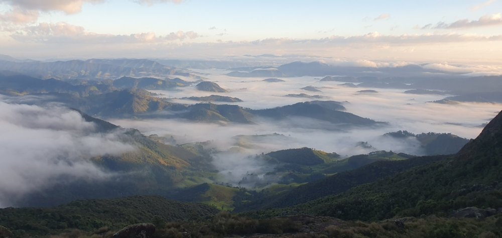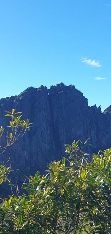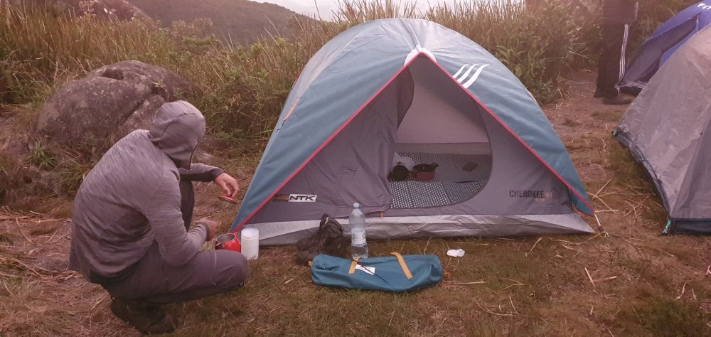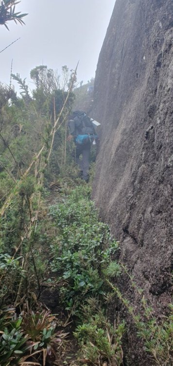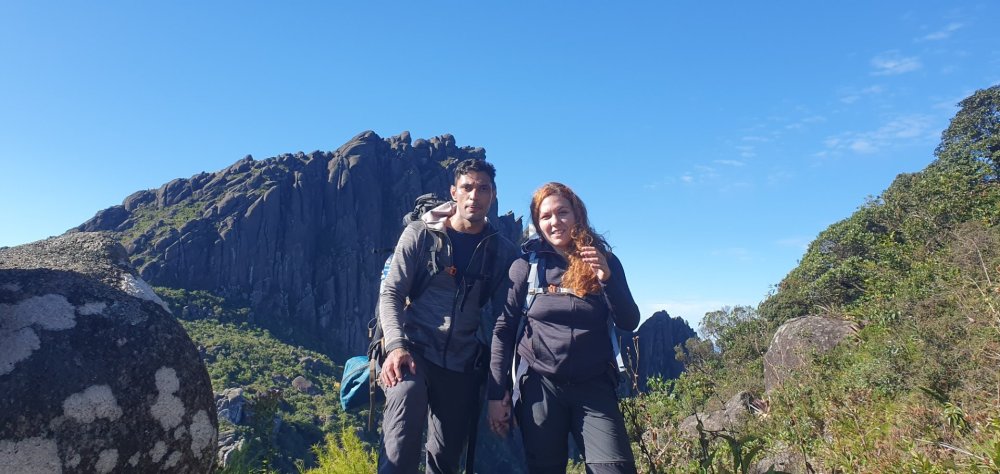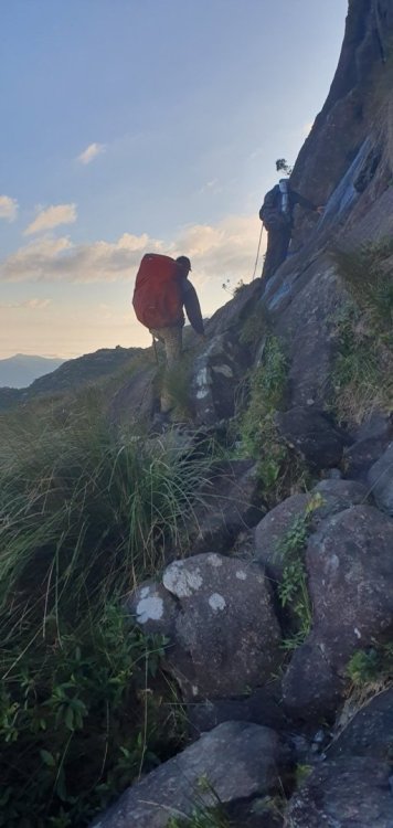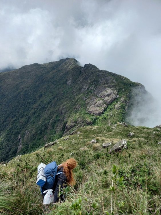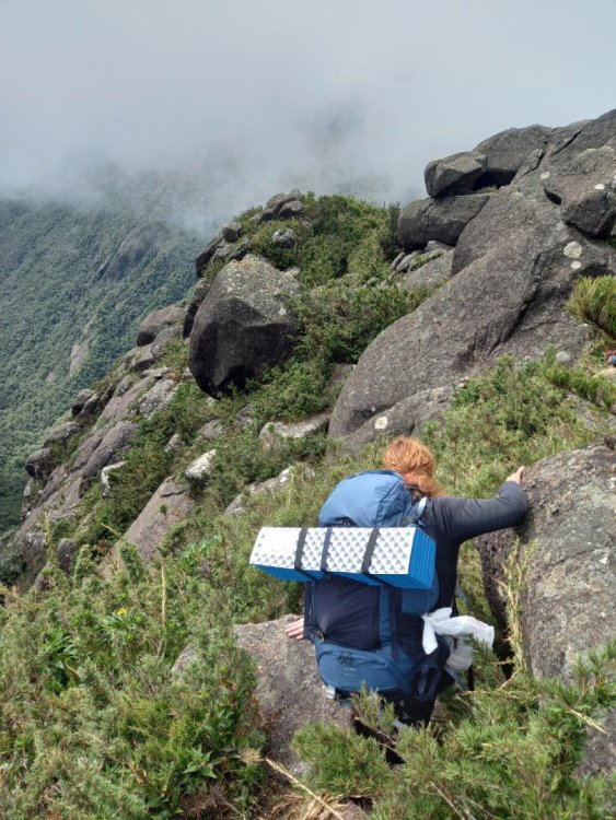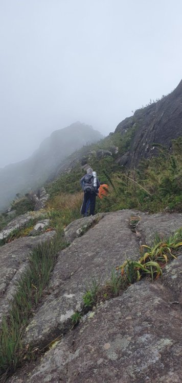 - Depois da Petro > Tere foi hora de subir de nível, só não sabia que seria tanto - 1. Guia A princípio recebi indicação do guia @b.runo_romualdo (35) 9810-1319 e havia fechado com ele. Porém, ele se machucou na semana da trilha e nos avisou que quem iria em seu lugar seria o @robsoncampos.guia (35) 9819-3859. Valor: 300,00 a guiada (nada incluso) e mais R$50,00 do transfer in/out da montanha a partir de MARMELOPÓLIS-MG. Embora não tenha trilhado com o Bruno, acredito que ele seja muito bom porque as recomendações foram muitas. Sobre minha experiência com o Robson, ele foi perfeito na minha opinião, foi certeiro em todas as ajudas e orientações durante o percurso e com certeza recomendo de olhos fechados. 2. Em quanto tempo realizar o trekking? Obviamente ou li e vi milhares de relatos e vídeos sobre essa travessia antes de ir e em absolutamente todos eles as pessoas dizem que a travessia é feita em 3 dias/ 2 noites. As grandes agências de turismo também vendem como sendo 2 pernoites na montanha. Qual foi minha surpresa quando ao entrar em contato com os guias nativos eles me disseram que 2 dias/ 1 noite seria o suficiente. Estranhei, mas vendo ali o tamanho da travessia (que deve ter uns 18km com as ascenções aos cumes) fazia sentido mesmo 2 dias, dividindo 9km pra cada dia. Usei como referência a Petro > Tere que 32km foram feitos em 3 dias/ 2 noites, uma divisão de mais ou menos 10km por dia. Então decidi realizar em 2 dias/ 1 noite mesmo (no final eu digo o que achei de ter feito dessa forma). 3. Água Levamos 2 garrafas de 1,5 litros e uma garrafa menor de 500ml por pessoa. Só reabastecemos uma vez na Pedra Redonda que, segundo o Robson, era a melhor água direto da nascente, todas as outras são 'mais ou menos'. Essa quantidade foi bem suficiente para nós. 3. Clima No geral, foi uma travessia 'quente'. Como fomos no final de abril/ começo de maio, o inverno rigoroso ainda não tinha chegado. A trilha inteira eu fiquei apenas com uma camiseta de manga comprida de controle de suor (Insider) e uma outra blusa/ jaqueta que passa longe de ser um anorak. Apenas a noite vesti a segunda pele e o fleece pra entrar no saco de dormir. Não passei frio em nenhum momento. Graças a Deus não caiu um pingo de chuva em nenhum momento. Vento teve um pouco mas nada anormal, com o movimento constante do corpo não foi um problema. Queria ter visto a temperatura quando estive por lá, mas meu celular Claro não dava nada de sinal. 3. O Relato Cheguei em Marmelópolis no dia 29 de abril as 21h. Mal consegui dormir pois o Bruno viria nos buscar em nossa hospedagem as 3h para seguirmos a base do Marins. Quando ele chegou, conhecemos nossos 2 outros companheiros de trilha, o Cleber e o Mário, ambos de Varginha-MG. Graças a eles, conseguimos fechar em R$50,00 o transfer por pessoa, pois o valor cheio é R$200,00, se fossemos só eu e o Rubens (meu marido) teria ficado R$100,00 por cabeça. A estrada até a base do Marins é bem zoada como de costume. Chegando lá, encontramos o Robson, que seria nosso guia. Começamos a subir as 4h do dia 30 de abril. O início da trilha é em mata densa e tinha muita, mas MUITA lama mesmo. A trilha também não é muito aberta e dependendo só da lanterna na cabeça, ficava difícil desviar de todos os galhos, raízes e buracos que apareciam pela frente. Chegamos no Morro do Careca depois de uns 45 minutos e fizemos a primeira pausa - eu obviamente já tava bem ofegante, mas dando conta. Acho que foi nesse momento que o Robson mencionou que estava com a mochila muito leve para o que ele geralmente leva e se ofereceu para carregar parte da minha água. Bom, eu não queria dar essa 'fraquejada' até porque minha mochila não tava tão pesada assim, mas como ele queria muito fazer essa gentileza, passei pra ele. Nisso o sol começou a chegar bem tímido e foi iluminando nosso caminho. Logo chegamos naquela pedra rachada no meio e logo me lembrei do Marco Aurélio e sua última marcação. Não tinha como não tirar uma foto por ali. Logo em seguida a travessia começa a te mostrar que não tá pra brincadeira. A partir daí é só subir pedra atrás de pedra, lage atrás de laje, escalaminhada atrás de escalaminhada. Não há um trecho de respiro até a base dos Marins. Nada, zero. Chegamos no acampamento base por volta de umas 7h30 e o Robson disse que nosso tempo tava excelente. Fizemos um café ali, deixamos as cargueiras e subimos o Marins leves. Olhar aquele paredão de longe assusta, parece que não tem como subir aquilo, mas pra falar a verdade, quando eu tava lá até que achei fácil. Em coisa de 40 minutos já estávamos no cume. Eu fiquei muito emocionada, era apenas a segunda vez que assinaria um livro de cume (o único que tinha assinado antes foi o das Prateleiras). Fora que... no dia anterior eu e o Rubens tínhamos feito 5 anos de casados, não teve sensação melhor que essa. Bem, como de costume, o tempo estava fechado durante o tempo que estávamos no cume por isso não demoramos muito pra descer. Na descida cruzamos com muitos grupos que tinham acampado no cume e desciam com cargueiras - estavam até pedindo corda em trechos que na minha opinião não eram necessários. Deve realmente fazer diferença subir leve por ali. Voltamos pro acampamento e logo seguimos rumo ao Marinzinho. Cara... O Marinzinho separa os homens dos meninos. Ele deve ter uns 3 falsos cumes que te dá a ilusão de ter chegado, mas na verdade ainda tem 30 metros de pedra pra você subir. É uma escalaminhada ferrada em todos os sentidos. Não consigo nem descrever o quão difícil é essa parte da travessia. Fizemos cume no Marinzinho por volta das 11h. Pra fechar com chave de ouro, como se a subida não tivesse sido suficientemente difícil, descer pode ser ainda PIOR. É nessa descida que tem o único trecho de corda, numa parede de uns 7 metros e 90 graus com algumas poucas agarras. Toda essa parte envolvendo o Marinzinho, o Robson foi ESSENCIAL em di