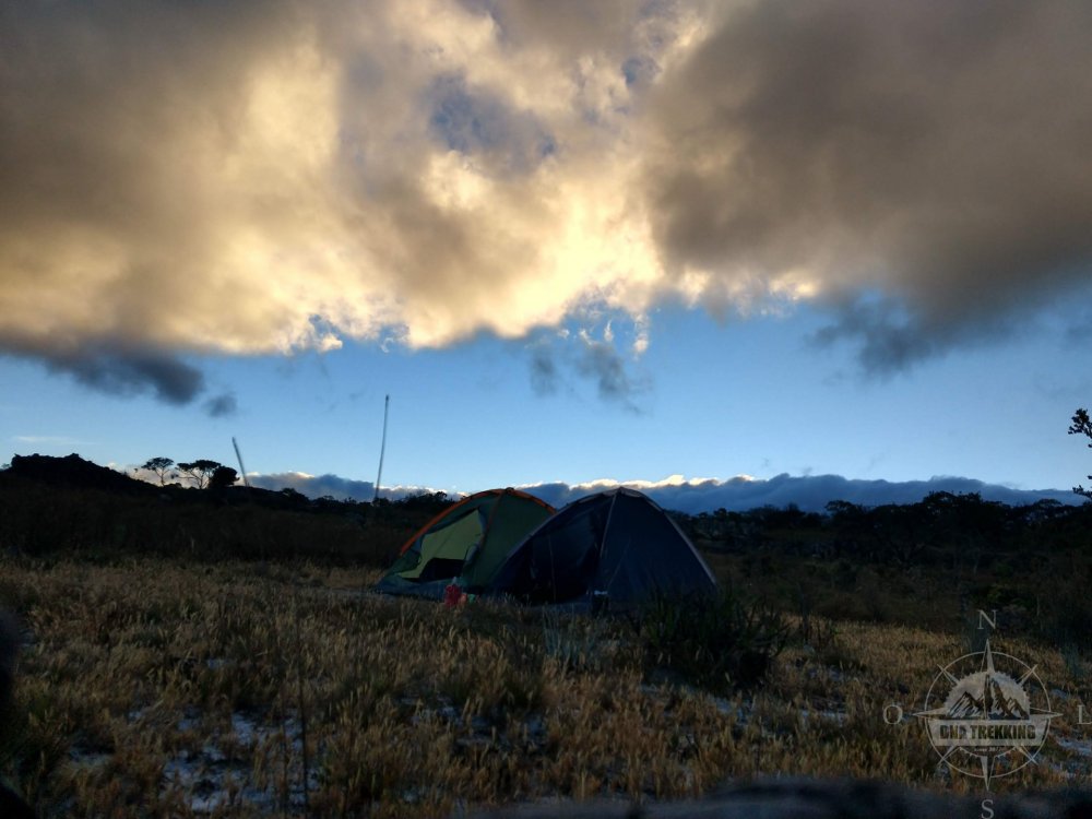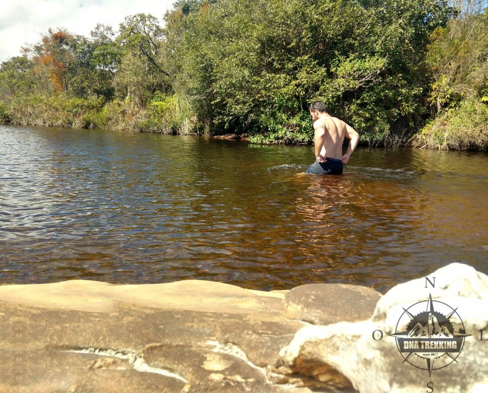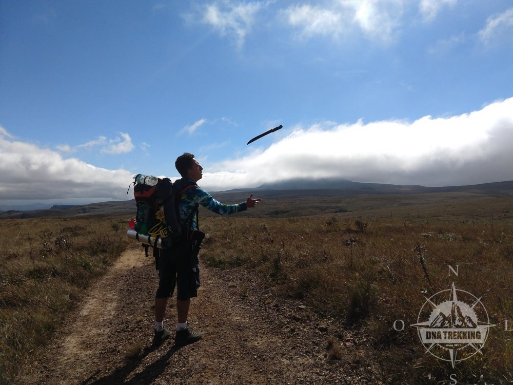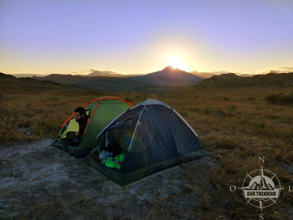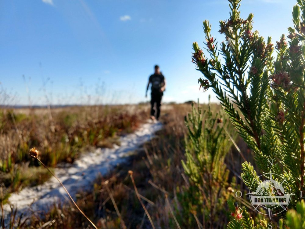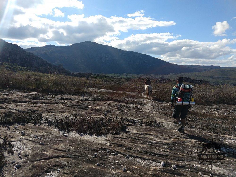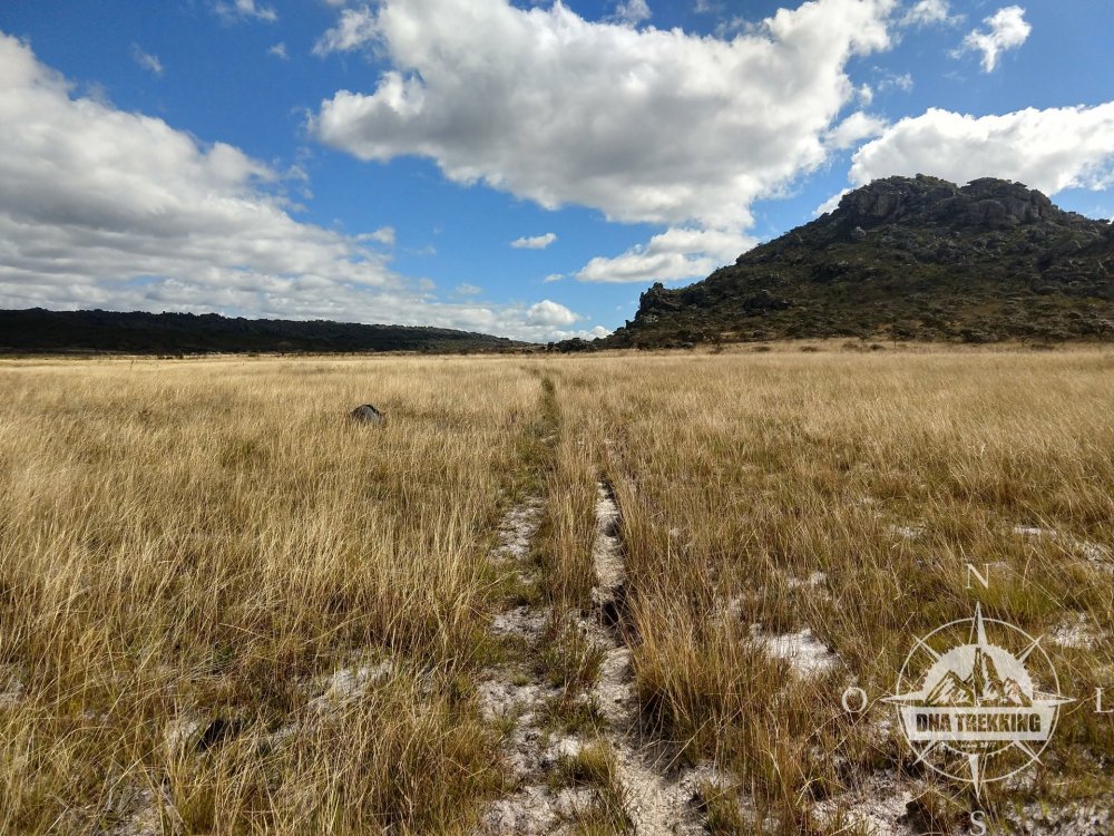 Já havíamos feito outras travessias antes. Eu (Nathan) e Diogo decidimos fazer algo diferente dessa vez por estarmos ambos desempregados e termos bastante tempo livre. A decisão de irmos só nós 2 (Inicialmente éramos 3, mas o Walker não pôde ir por um imprevisto, o que mais tarde se mostrou a melhor alternativa, pois uma terceira pessoa dificultar ainda mais arrumar carona) nessa travessia veio do fato de que em Outubro iríamos com toda a equipe fazê-la (cerca de 15 pessoas), mas não era uma área mapeada, o percurso não havia sido feito por ninguém. Então fomos no peito e na raça mapear nós mesmos para obter informações e garantir a segurança de toda a turma quando eles fossem. 1º dia Faríamos a Travessia + Mochilão raiz. Chegamos á beira da rodovia em Contagem-MG para pedir carona ás 6:30hrs da manhã de segunda-feira 23/07/2018, com placas de Diamantina e Curvelo em mãos. Mas só conseguimos carona por volta de 10:30hrs, quando um Professor de Português de Curvelo, enquanto voltava pra casa, nos confundiu com estudantes e por empatia resolveu nos dar carona. Chegamos á Curvelo por volta de 12:30hrs, onde almoçamos num ótimo restaurante de comida caseira. Conseguimos outra carona rumo a Diamantina por volta de 14:00hrs, com outro cara que também nos confundiu com estudantes. Paramos um pouco antes, no trevo que vira pra Serro. Nessa região as estradas são mais desertas e as pessoas mais desconfiadas, portanto foi mais complicado conseguir carona. Mas conseguimos mais uma até o trevo que vira para Presidente Kubitschek, cerca de 20km de Serro, ás 16:20hrs. A partir desse horário, por estar anoitecendo e como já disse, as pessoas são mais desconfiadas, não conseguimos mais carona, tivemos de subir uma colina na beira da rodovia e montar acampamento por lá mesmo, enquanto presenciávamos um lindo pôr-do-sol. 2º dia Às 7:00hrs da manhã, estávamos de volta à beira da rodovia pedindo carona novamente e um pouco depois chegamos em Serro, onde decidimos ir pra Milho Verde de ônibus para agilizar. Por só ter ônibus depois às 11hrs, até dar o horário fomos andar pelo centro histórico, que apesar de pequeno é bem bonito. Cerca de meio dia já estávamos em Milho Verde, onde almoçamos e tomamos uma cerveja enquanto usávamos o Wi-fi para dar notícia aos parentes e tentar mandar um e-mail de ultima hora de pedido de permissão de entrada no Parque Estadual do Rio Preto, mas não deu tempo de obter resposta, então só rezamos para o Diretor do parque nos autorizar e saímos em direção ao inicio da travessia. Mas não antes de deixar um adesivo da DNA TREKKING colado no mural de equipes de vários esportes que passaram por aquele local da Estrada Real. Estamos fazendo história! E finalmente às 15:00hrs começamos nossa jornada rumo ao desconhecido. Estávamos usando várias trilhas para diferentes destinos na região, como um quebra-cabeça que juntas serviriam de base o nosso caminho. A primeira era de Milho Verde para Capivari, passando pelo Pico do Raio. No início planejamos seguir até uma cachoeira perto de Milho Verde, porém no sentido contrário do Parque do Rio Preto, para tomar banho, dormir e começar a caminhada de fato na manhã seguinte subindo o rio. Andamos cerca e 2,5km rumo à cachoeira quando mudamos de idéia, não iríamos mais tomar banho, demos meia volta e partimos para o ponto inicial, novamente, encontrar com trilha para Capivari. Em resumo, andamos quase 5 km atoa. Entramos na trilha às 16:00hrs, estávamos num vale bonito, vegetação baixa e seca que lembrava muito uma savana africana. O chão de areia branca bem característico da região era difícil de caminhar. Atravessamos o vale até uma placade propriedade privada e uma casa abandonada, onde finalmente viramos para o norte e seguimos um cano de água que subia a serra. Era impossível não olhar para trás a todo momento para admirar a bela paisagem do vale. O sol sumiu às 17:30hrs, a lua cheia já estava no alto. Nesse momento já havíamos subido a serra e começamos a procurar um lugar adequado para montar acampamento, de preferência perto da água para finalmente tomarmos banho, mas não foi possível. Procuramos até o limite possível de luz que tínhamos, mas acabamos ficando numa área plana ao pé do Pico do Raio. Noite fria, com muita geada e muita ventania, mas a lua cheia imponente iluminando tudo. É sempre uma sensação única se sentar na porta da barraca e admirar o céu estrelado que poucos nas cidades tem a oportunidade de ver. 3º dia Combinamos de acordar às 5hrs, mas estava frio e havia muita geada ainda, então só levantamos umas 6:30hrs. Tivemos o privilégio de ver o sol nascer atrás do Pico Itambé, o mais alto da região. Tomamos café da manhã enquanto encontrávamos pegadas na areia perto das barracas do que acreditamos ser de Tamanduá e Onça. Começamos a caminhar cerca de 8:00hrs da manhã rumo ao Pico do Raio. Às 9:00hrs chegamos no pico, apesar da brisa refrescante, o sol estava muito quente. Lá de cima dava pra ver à oeste São Gonçalo do Rio das Pedras e ao norte visualizar no horizonte distante a cadeia de montanhas para onde deveríamos ir. Contornamos o pico, ainda no caminho para Capivari, mas perdemos a trilha que é demarcada com setas amarelas. Tendo que descer pelas pedras no meio do mato baixo. Mais para baixo reecontramos a trilha e nela seguimos até a fazenda de um casal de idosos, tendo que passar por dentro. Pedimos licença, conversamos um pouco. Pessoal simpático, encheram nossas garrafas de água e dali seguimos viagem. Finalmente encontramos um rio, um lugar adequado para enfim tomar banho após 3 dias! Nada como se sentir limpo de novo. Às 11:40 seguimos viagem. Quase chegando em Capivari, por volta de 12:30, era hora de sair da trilha pois ela seguia para o sul, e nosso destino era o norte. Ali, começaríamos caminhar às cegas, seguindo apenas a bússola e o instinto. O objetivo era a