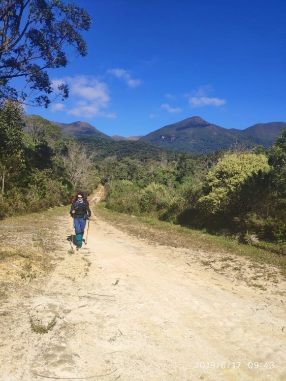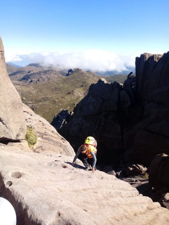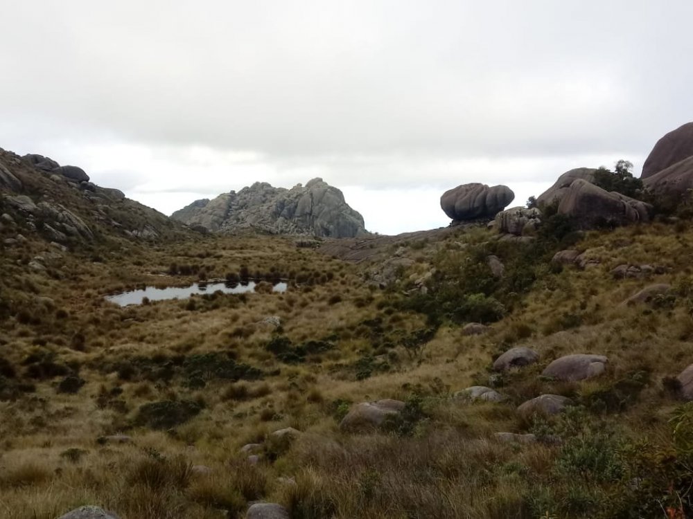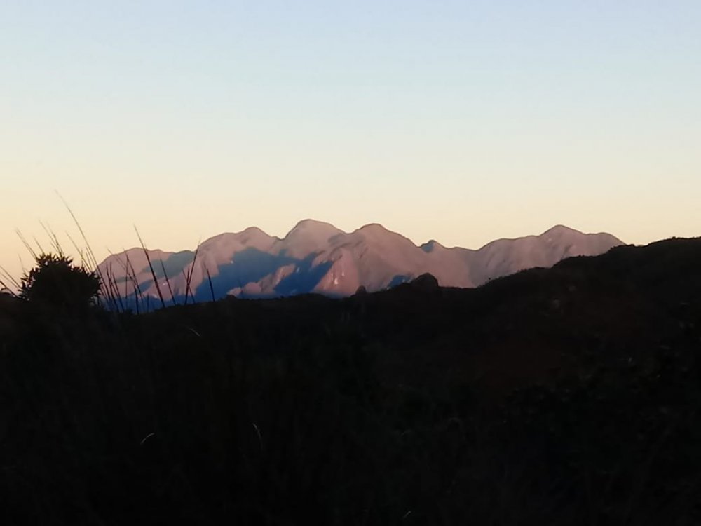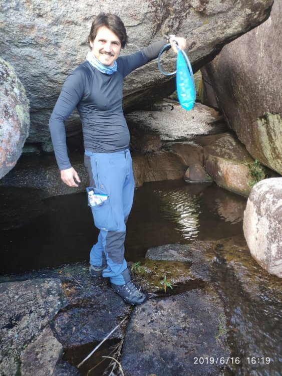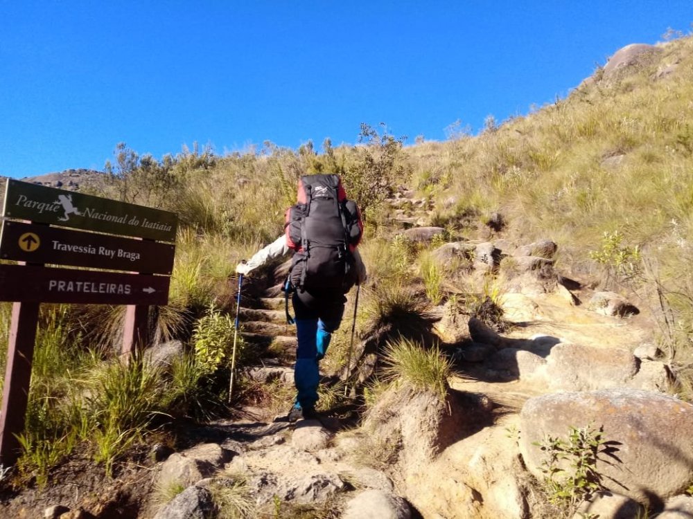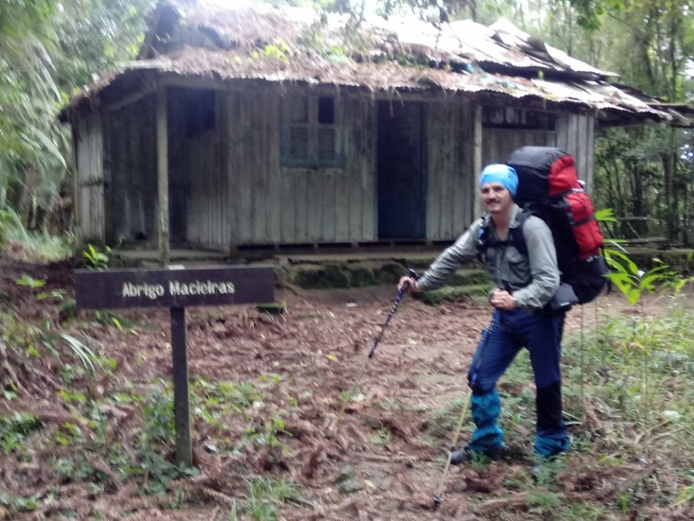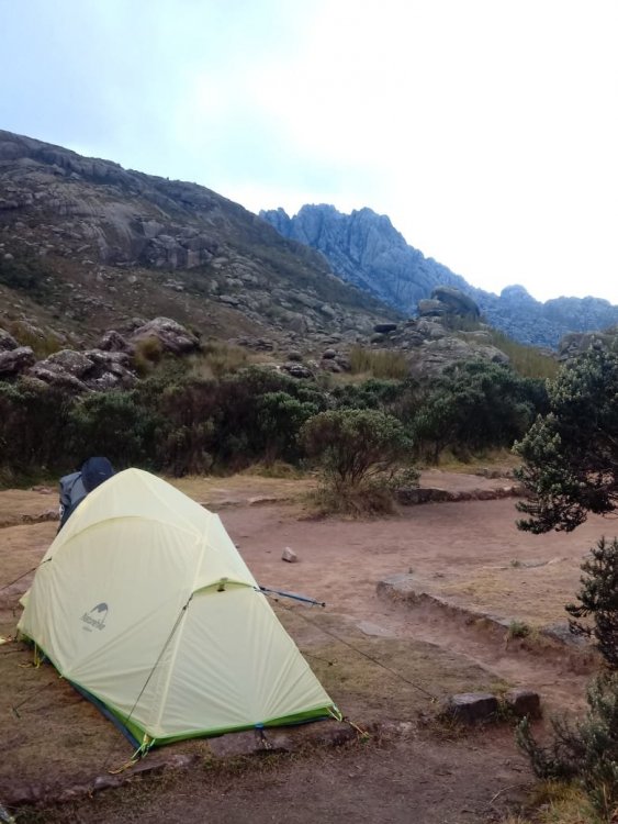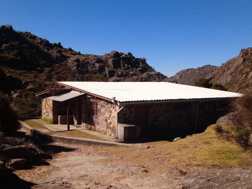 Travessia do Parque Nacional do Itatiaia - junho/2019 Foram aproximadamente 70 km m 5 dias de caminhada passando pelos seguintes pontos: Dia 1- Travessia Rui Braga subindo - Maromba (parte baixa PNI) – Abrigo Massena Dia 2- Travessia Couto Prateleiras – camping Rebouças Dia 3 – Agulhas Negras – Pedra do Altar – Camping Rebouças Dia 4 – Travessia Rancho Caído – Cachoeira do Aiuruoca – Ovos da Galinha – Pedra do Sino de Itatiaia – Rancho Caído Dia 5 – descida do Rancho caído até a cachoeira do escorrega do Maromba Nossa aventura começa na rodoviária Tiete com destino a Itatiaia. Saímos as 11h45 e por volta das 16h chegamos em Itatiaia. No caminho vim observando os contornos da serra do Itaguaré, Serra Fina e já imaginando a próxima aventura. Na rodoviária nosso anfitrião já nos esperava, passamos pela portaria do parque para o check in e pagamento de ingresso, porem já tinham fechado e falaram para que fizessemos todo o pagamento e check in no posto do Marcão. Fomos nos hospedar no quarto Gaia já dentro do PNI da parte baixa, uma casa dos anos 40 que hoje os moradores alugam os quartos para hospedagem. Um lugar muito aconchegante e bacana em total contraste com os próximos dias de trilha, uma noite bem dormida e corpo descansado. Inclusive a trilha começa ali mesmo, começamos as 7h30 e pegamos já um caminho por entre a mata passando pelas ruinas de uma imponente casa de outrora, seguindo pela rua de terra até o posto do Maromba onde chegamos as 8h e haviam nos informado que ali teria um guarda para checar a autorização da travessia Rui Braga. O homem não estava lá. Tinha um pessoal de colete amarelo do ICMBIO que estavam roçando a trilha e nos disseram para seguir adiante. Quarto Gaia Posto Maromba Começo da Ruy Braga E assim fomos, por uma trilha bem aberta no começo e recém roçada, em pouco tempo a trilha foi estreitando, mas ainda assim muito limpa, chamou a atenção alguns “guard rails” de concreto que encontramos no caminho, ali passou uma estrada antigamente, muito provavelmente para descer madeira que viraria carvão para os trens do Barão de Visconde de Mauá. Era um sigue zague de pouco aclive e fomos contornando as curvas de nível por entre a mata e passando por diversos riachos nas veredas que desciam. Ao meio dia em ponto chegamos no abrigo Macieiras, vários pinheiros europeus e araucárias o circundavam, uma casa de madeira bem antiga porem mal conservada, ainda assim se mantinha em pé, dava para imaginar que lugarzinho bucólico foi antigamente, com montanhistas e aventureiros se hospedando na casa. Ali fizemos nosso lanche do almoço e um breve descanso. As 12h45 seguimos adiante e logo mais alcançamos os campos de altitude e a primeira visão do Pico das Agulhas Negras e da serra das Prateleiras e para o outro lado do vale do Paraíba e da cidade de Resende. Abrigo Macieiras Mais um pouco de caminhada chegamos no Abrigo Massena as 14h45. Uma subida muito leve e tranquila. Imaginava que fosse mais pesada. O abrigo é imponente todo feito de pedra e muito deteriorado, sobrando somente as paredes de pedra maciça e uma parte do telhado do que deveria ser a sala principal do chalé, pois ali havia uma grande lareira em perfeitas condições. Tratamos de montar a barraca em frente e explorar a casa. Logo atrás subimos uma trilha até uma outra casa também abandonada no topo do morro que parecia ter tido uma antena pois havia uma base de ferro cortada e muito entulho de ferro em um buraco por ali. Atrás dela tinha uma linda vista do vale, da represa, da Serra do Mar e da Serra FIna. Eu havia lido em um relato aqui no mochileiros.com que tinha ainda uma terceira ruina em um morro aqui perto e por ali também seria a fonte de água próxima do Massena. Seguimos a trilha adiante e uns minutos depois achamos um fio de água que cruzava a trilha. Fomos em busca das ruinas seguindo a trilha mas não encontramos, quando resolvemos voltar vejo a ruina logo acima de um morro com uma araucária solitária visto de quem desce a Rui Braga. E para lá seguimos. Toda de pedra e tijolo maciço sem o telhado e todas as paredes em pé, havia ainda uma pia e parte do fogão a lenha. Estava aos pés das Prateleiras. Massena outras ruina com as prateleiras ao fundo Serra Fina Depois da exploração retornamos ao acampamento. Preparamos nossas coisas para jantar e com alguns galhos fizemos uma pequena fogueira na lareira. A fome apertava e fizemos a nossa janta. Com a noite veio o frio e as estrelas que brilhavam além de uma lua cheia intensa no céu. Tinha algumas nuvens, mas nada que incomodasse. Deitamos cedo. No dia seguinte acordamos as 5h a barraca estava coberta por uma fina camada de gelo, na hora de desmontar chegou a doer as mãos de frio para enrolar a lona. Café tomado e mochila pronta saímos as 6h30 subindo ainda mais um pouco até alcançar o vale do Rio Campo Belo tendo sempre as Agulhas Negras nos acompanhando, essa na realidade foi uma constante, pois a imponência deste Pico era vista de todo o parque em todas as trilhas que fizemos. Nessa altura do vale nos encontramos com talvez a continuação da estrada, isso se elas se encontrassem no passado, ali havia até alguns trechos com asfalto e diziam ser a BR mais alta do Brasil mandada construir por Getulio Vargas. Passamos pela placa que marcava o inicio/fim da Rui Braga (seriam 21km entre este ponto e o posto do Maromba) e o acesso a base das Prateleiras, logo adiante a cachoeira das Flores e enfim o camping Rebouças onde chegamos as 9h, aproveitamos e já escolhemos um bom lugar para montar nossa barraca e deixar nossas coisas. Fomos conhecer o abrigo e os arredores do camping. Abrigo Rebouças camping Rebouças E logo partimos em direção ao posto do Marcão, passamos pela nascente do Rio Campo Belo. Ali na entrada fizemos os procedimentos de check in, o pessoal do PNI falou que havia abaixado de zero a noite anterior, e também pediu para guardarmos bem a co