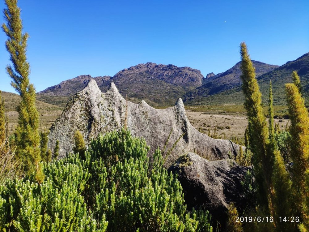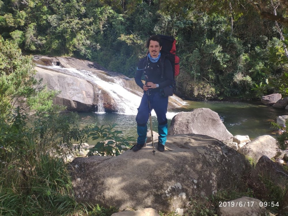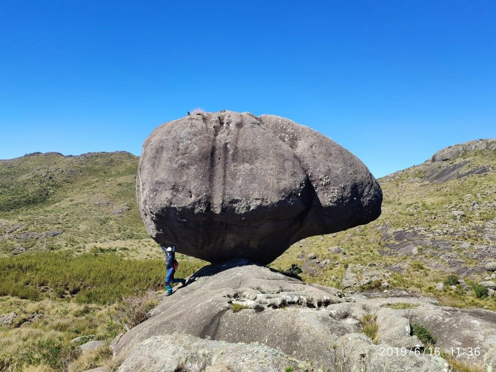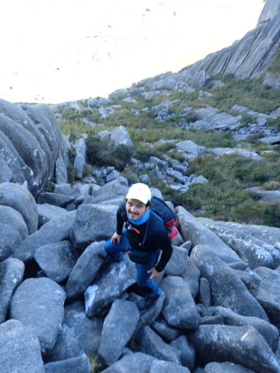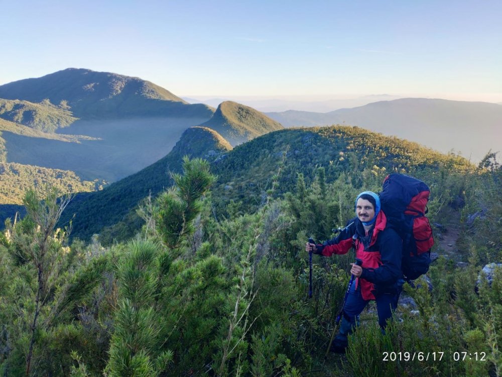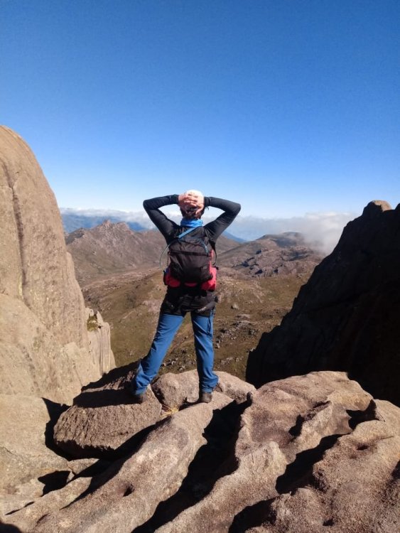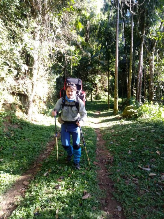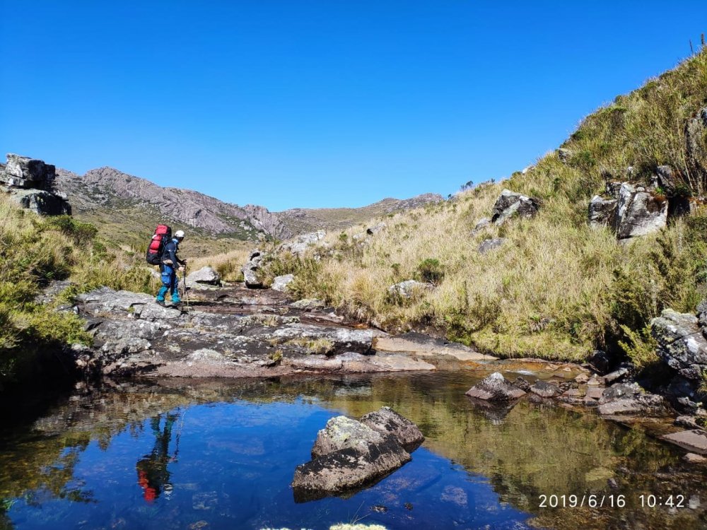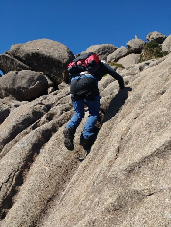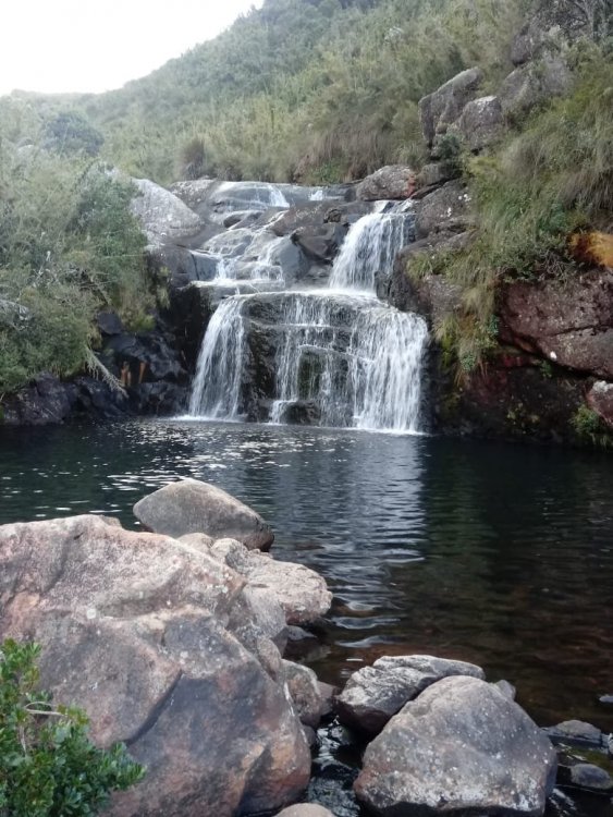 Travessia do Parque Nacional do Itatiaia - junho/2019 Foram aproximadamente 70 km m 5 dias de caminhada passando pelos seguintes pontos: Dia 1- Travessia Rui Braga subindo - Maromba (parte baixa PNI) – Abrigo Massena Dia 2- Travessia Couto Prateleiras – camping Rebouças Dia 3 – Agulhas Negras – Pedra do Altar – Camping Rebouças Dia 4 – Travessia Rancho Caído – Cachoeira do Aiuruoca – Ovos da Galinha – Pedra do Sino de Itatiaia – Rancho Caído Dia 5 – descida do Rancho caído até a cachoeira do escorrega do Maromba Nossa aventura começa na rodoviária Tiete com destino a Itatiaia. Saímos as 11h45 e por volta das 16h chegamos em Itatiaia. No caminho vim observando os contornos da serra do Itaguaré, Serra Fina e já imaginando a próxima aventura. Na rodoviária nosso anfitrião já nos esperava, passamos pela portaria do parque para o check in e pagamento de ingresso, porem já tinham fechado e falaram para que fizessemos todo o pagamento e check in no posto do Marcão. Fomos nos hospedar no quarto Gaia já dentro do PNI da parte baixa, uma casa dos anos 40 que hoje os moradores alugam os quartos para hospedagem. Um lugar muito aconchegante e bacana em total contraste com os próximos dias de trilha, uma noite bem dormida e corpo descansado. Inclusive a trilha começa ali mesmo, começamos as 7h30 e pegamos já um caminho por entre a mata passando pelas ruinas de uma imponente casa de outrora, seguindo pela rua de terra até o posto do Maromba onde chegamos as 8h e haviam nos informado que ali teria um guarda para checar a autorização da travessia Rui Braga. O homem não estava lá. Tinha um pessoal de colete amarelo do ICMBIO que estavam roçando a trilha e nos disseram para seguir adiante. Quarto Gaia Posto Maromba Começo da Ruy Braga E assim fomos, por uma trilha bem aberta no começo e recém roçada, em pouco tempo a trilha foi estreitando, mas ainda assim muito limpa, chamou a atenção alguns “guard rails” de concreto que encontramos no caminho, ali passou uma estrada antigamente, muito provavelmente para descer madeira que viraria carvão para os trens do Barão de Visconde de Mauá. Era um sigue zague de pouco aclive e fomos contornando as curvas de nível por entre a mata e passando por diversos riachos nas veredas que desciam. Ao meio dia em ponto chegamos no abrigo Macieiras, vários pinheiros europeus e araucárias o circundavam, uma casa de madeira bem antiga porem mal conservada, ainda assim se mantinha em pé, dava para imaginar que lugarzinho bucólico foi antigamente, com montanhistas e aventureiros se hospedando na casa. Ali fizemos nosso lanche do almoço e um breve descanso. As 12h45 seguimos adiante e logo mais alcançamos os campos de altitude e a primeira visão do Pico das Agulhas Negras e da serra das Prateleiras e para o outro lado do vale do Paraíba e da cidade de Resende. Abrigo Macieiras Mais um pouco de caminhada chegamos no Abrigo Massena as 14h45. Uma subida muito leve e tranquila. Imaginava que fosse mais pesada. O abrigo é imponente todo feito de pedra e muito deteriorado, sobrando somente as paredes de pedra maciça e uma parte do telhado do que deveria ser a sala principal do chalé, pois ali havia uma grande lareira em perfeitas condições. Tratamos de montar a barraca em frente e explorar a casa. Logo atrás subimos uma trilha até uma outra casa também abandonada no topo do morro que parecia ter tido uma antena pois havia uma base de ferro cortada e muito entulho de ferro em um buraco por ali. Atrás dela tinha uma linda vista do vale, da represa, da Serra do Mar e da Serra FIna. Eu havia lido em um relato aqui no mochileiros.com que tinha ainda uma terceira ruina em um morro aqui perto e por ali também seria a fonte de água próxima do Massena. Seguimos a trilha adiante e uns minutos depois achamos um fio de água que cruzava a trilha. Fomos em busca das ruinas seguindo a trilha mas não encontramos, quando resolvemos voltar vejo a ruina logo acima de um morro com uma araucária solitária visto de quem desce a Rui Braga. E para lá seguimos. Toda de pedra e tijolo maciço sem o telhado e todas as paredes em pé, havia ainda uma pia e parte do fogão a lenha. Estava aos pés das Prateleiras. Massena outras ruina com as prateleiras ao fundo Serra Fina Depois da exploração retornamos ao acampamento. Preparamos nossas coisas para jantar e com alguns galhos fizemos uma pequena fogueira na lareira. A fome apertava e fizemos a nossa janta. Com a noite veio o frio e as estrelas que brilhavam além de uma lua cheia intensa no céu. Tinha algumas nuvens, mas nada que incomodasse. Deitamos cedo. No dia seguinte acordamos as 5h a barraca estava coberta por uma fina camada de gelo, na hora de desmontar chegou a doer as mãos de frio para enrolar a lona. Café tomado e mochila pronta saímos as 6h30 subindo ainda mais um pouco até alcançar o vale do Rio Campo Belo tendo sempre as Agulhas Negras nos acompanhando, essa na realidade foi uma constante, pois a imponência deste Pico era vista de todo o parque em todas as trilhas que fizemos. Nessa altura do vale nos encontramos com talvez a continuação da estrada, isso se elas se encontrassem no passado, ali havia até alguns trechos com asfalto e diziam ser a BR mais alta do Brasil mandada construir por Getulio Vargas. Passamos pela placa que marcava o inicio/fim da Rui Braga (seriam 21km entre este ponto e o posto do Maromba) e o acesso a base das Prateleiras, logo adiante a cachoeira das Flores e enfim o camping Rebouças onde chegamos as 9h, aproveitamos e já escolhemos um bom lugar para montar nossa barraca e deixar nossas coisas. Fomos conhecer o abrigo e os arredores do camping. Abrigo Rebouças camping Rebouças E logo partimos em direção ao posto do Marcão, passamos pela nascente do Rio Campo Belo. Ali na entrada fizemos os procedimentos de check in, o pessoal do PNI falou que havia abaixado de zero a noite anterior, e também pediu para guardarmos bem a co
