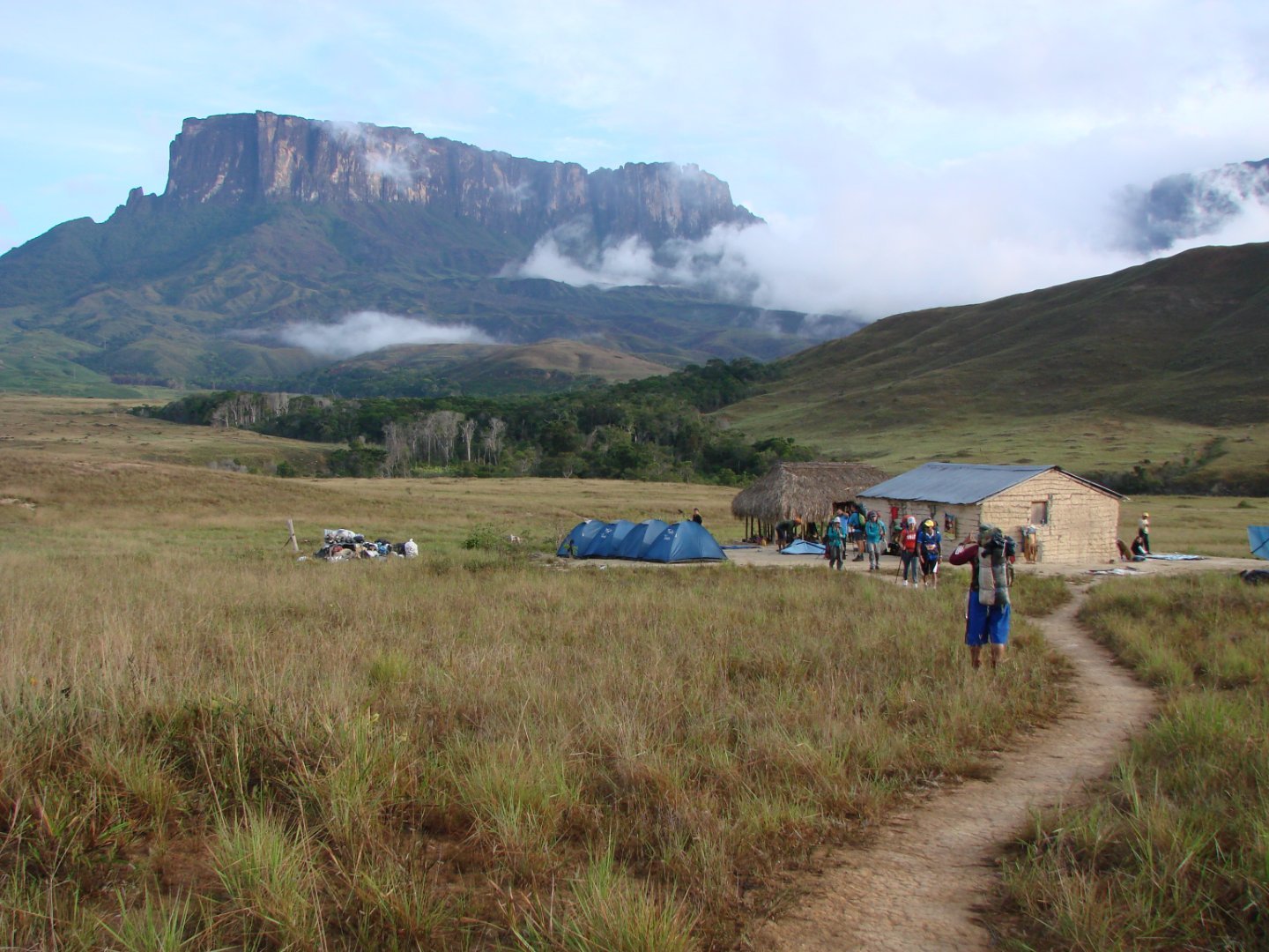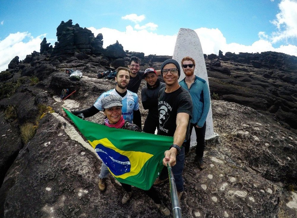 Foram três dias para a subida, três dias no topo do Roraima e dois dias para retornar. O Monte Roraima é o palco da famosa aventura denominada 'O Mundo Perdido' (1912) de Sir Arthur Conan Doyle, o mesmo autor de Sherlock Holmes. Expedição realizada em janeiro de 2015. Na imagem, o Monte Kukenan à esquerda e o Monte Roraima à direita Saída de Boa Vista e preparativos para a subida Saímos de Boa Vista por volta das 8h. Boa Vista é a capital do estado de Roraima e dista cerca de 215 km da fronteira com a Venezuela. Passando pela fronteira, percorremos mais 15 km até a primeira cidade no país vizinho, Santa Elena do Uiarén. Chegamos por volta das 10h e já fomos ter o primeiro contato com o dono da agência "Mystic tours", o senhor Roberto Marrero, morador de Santa Elena. Com ele acertamos o horário da ‘charla’ ou briefing sobre os procedimentos, cuidados e recomendações aos que irão subir o Monte. Após este breve encontro, aproveitamos para trocar reais por bolívares na cidade. A cotação do dia estava em 50 bolívares para cada real (ano de 2015). O valor que pagamos por pessoa foi de R$ 650,00 para oito dias (sete pernoites), incluindo alimentação e a montagem das barracas. Precisamos levar somente nossos objetos pessoais, como saco de dormir, isolante térmico e roupas. Para entrar em Santa Elena não foi preciso nada além de nossos documentos pessoais mas, para seguirmos adiante em nossa viagem, precisaríamos do ‘Permiso’. Retornamos então de Santa Elena para a fronteira e chegamos à Aduana. Fomos antes até a PF brasileira para obter o carimbo do nosso passaporte. Todo o processo durou cerca de duas horas. Na Aduana a Venezuela exigia, além dos documentos pessoais, a carteira de vacinação para a Febre Amarela. Após a obtenção do permiso, procuramos um hotel na cidade e encontramos o ‘Garibaldi’, no centro. Pagamos 1500 bolívares. A internet do hotel era muito ruim e ficamos sem conexão durante toda a estadia. No dia seguinte nos encontramos com o dono da agência para a ‘charla’ sobre a expedição, que durou pouco mais de uma hora. Na primeira parte, trouxe uma série de informações sobre como encarar os dias de caminhada, os locais onde iriamos pernoitar e os cuidados que deveríamos tomar. Na segunda parte da charla, falou sobre aspectos geológicos do Monte Roraima e concluiu falando sobre alguns aspectos esotéricos da região. É importante ressaltar que a agência que contratamos era voltada para o turismo esotérico e o agente nos fez algumas recomendações. Por exemplo, ao chegar à montanha ou entrada de alguma cueva (caverna), os índios Pemon – que consideram o Roraima um monte Sagrado –, recomendam que os chegantes sempre peçam permissão aos espíritos que guardam o lugar, dizendo que vêm em paz e que se comprometem a manter a harmonia do lugar. Disse também que, como em outros locais místicos, são também comuns avistamentos de OVNIS na região do Roraima. Concluiu dizendo que o Monte Roraima está ligado energeticamente com os principais pontos esotéricos do mundo, como Stonehenge, Nasca, Ilhas de Pascoa, Machu Pichu, Monte Fuji, Yukatan e, no Brasil, um ponto em Minas Gerais, na região de São Tomé das Letras. Primeiro dia Paraitepui ao acampamento do Rio Tek Chegamos na agência por volta das 9h, hora combinada para sairmos. Foi solicitado que não colocássemos nossos passaportes nas mochilas, pois poderiam ser requisitados nos dois postos de controle militar (os postos são denominados Alcabalas) que existem no trajeto. Dois veículos nos aguardavam. São preparados para estradas de difícil acesso, com espaço interno adaptado para abrigar nove pessoas além do motorista. Após a acomodação das bagagens nestes veículos, iniciamos a viagem de Santa Elena até o ponto conhecido como Paraitepui. Uma parte da estrada é asfaltada mas, em determinada altura, o veículo entra por uma estrada de terra que leva a este local, que marcou o início de nossa caminhada. O deslocamento dura cerca de 1 hora e 40 min. Na chegada a Paraitepui, o Sr. José (o nosso guia durante toda a viagem) foi cuidar dos detalhes de nossa liberação. O local é uma comunidade indígena com poucas habitações. Ficamos num abrigo simples, conferindo o equipamento para subida. A seguir, alongamos o corpo e tiramos algumas fotografias. A saída demorou um pouco pois o Sr. José aguardava a chegada dos chamados porteadores, que são moradores locais contratados para compor as diferentes expedições. Os porteadores fazem realmente um trabalho duro: carregam as barracas, a comida e demais utensílios necessários em cada parada. Um deles fica encarregado de levar o que eles chamam ‘chocolate’, ou seja, os dejetos gerados pelos membros da expedição durante a viagem! É proibido deixar estes dejetos no topo do Roraima. Após algum tempo, Sr. José chegou com os porteadores e com a permissão para a nossa viagem. Eles começaram a organizar nosso almoço: dois sanduíches imensos com queijo, presunto, cebola e pepino, acompanhados de suco. Após nos fartarmos, aguardamos mais alguns instantes e fomos orientados a colocar nossa mochila nas costas. Vale dizer que cada membro deve carregar seu próprio isolante térmico, seu sleeping bag, suas roupas e alimentos pessoais. Os organizadores sempre sugerem levar alguma comida extra de sua preferência. Momentos antes do início da caminhada (Imagem: Grupo 'Caminhando por aí', nossos companheiros de expedição) Finalmente iniciamos a caminhada! Como todos estavam animados, iniciamos muito bem, vencendo facilmente as subidas e descidas iniciais. Cerca de uma hora depois, nos deparamos com uma subida íngreme, chamada pelos locais de ‘La Prueba’. Dizem que é neste primeiro desafio que o chefe da expedição fica sabendo qual é o condicionamento físico de seus membros. Quem é sedentário, por exemplo, sente bastante esta primeira subida! Neste primeiro dia de caminhada, a pessoa q