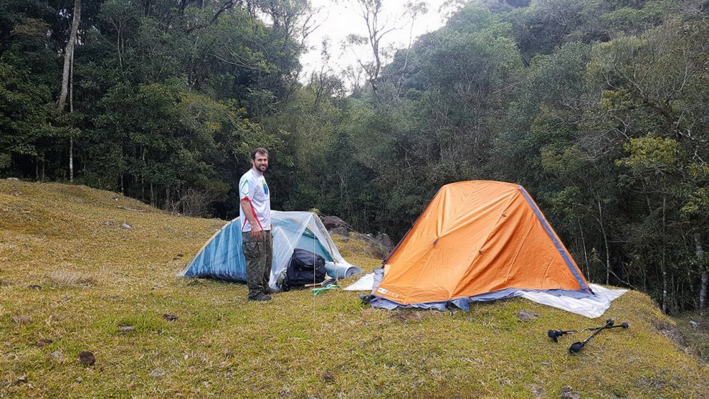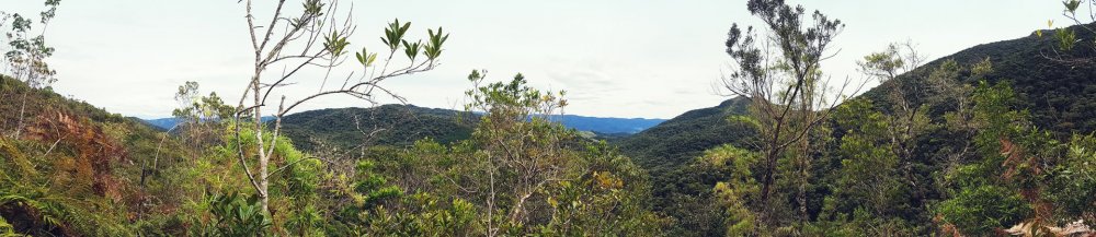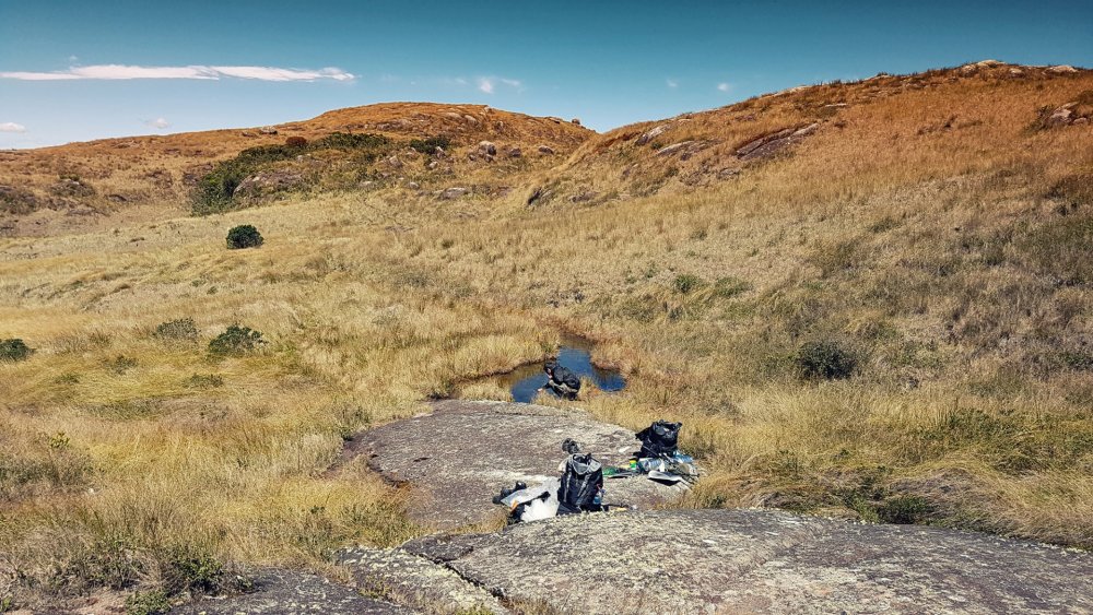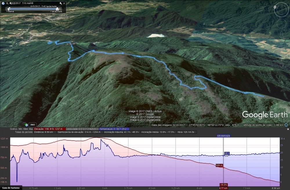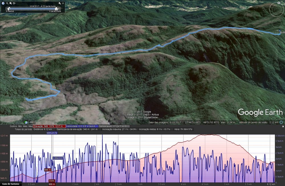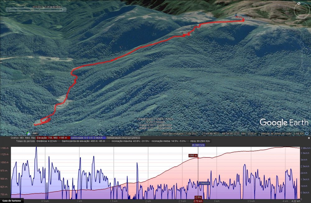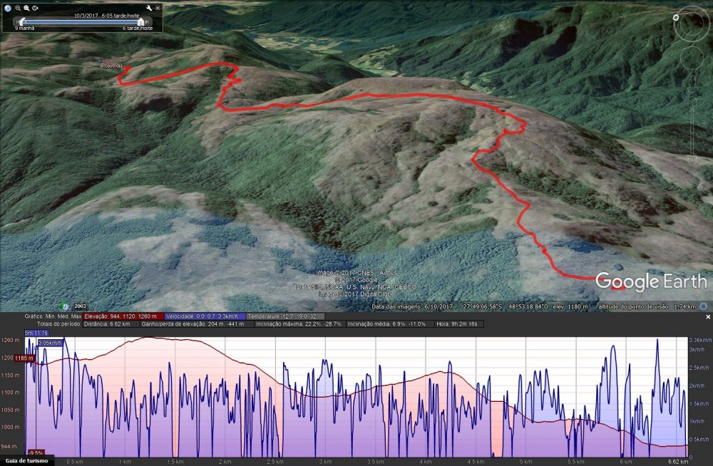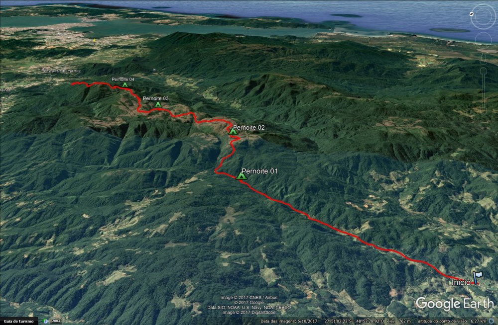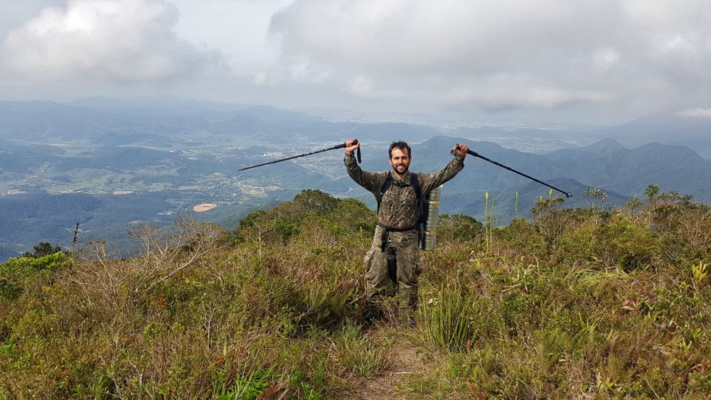 Travessia Parque Estadual da Serra do Tabuleiro São Bonifácio a Caldas da Imperatriz Localizado em uma região estratégica, única e muito especial da Mata Atlântica, o Parque Estadual da Serra do Tabuleiro possui uma ampla diversidade de habitats. Cinco das seis grandes formações vegetais do bioma Mata Atlântica encontradas no Estado estão representados no Parque. Por essa razão, ele abriga uma biodiversidade ainda maior que seus 84.130 hectares poderiam sugerir. O Parque Estadual da Serra do Tabuleiro ocupa cerca de 1% do território catarinense. Abrange áreas dos municípios de Florianópolis, Palhoça, Santo Amaro da Imperatriz, Águas Mornas, São Bonifácio, São Martinho, Imaruí e Paulo Lopes. Fazem parte do Parque as ilhas do Siriú, dos Cardos, do Largo, do Andrade e do Coral, e os arquipélagos das Três Irmãs e Moleques do Sul. Fonte: Fatma A ideia da travessia surgiu no início de julho de 2017, exatamente 3 meses antes, em uma das ascensões ao Morro do Cambirela, quando no cume, já praticamente na face oeste do Cambirela, avistei aquela imensidão de montanhas que sugeriam uma travessia muito interessante. Fiz algumas pesquisas na internet, e encontrei dois tracklogs que dariam uma boa base para a travessia. Um deles foi do Rafael Santiago, que acompanhava um breve relato da expedição. O outro era o do aventureiro Hendrik Fendel. Analisei exaustivamente as fotos de satélites, juntamente com os mapas topográficos da região e o tracklogs, mesclando as informações e criando uma trilha que para mim seria mais ideal. Nada muito diferente do que os outros fizeram, mas que de certa forma poderia facilitar um pouco a travessia, visto que existe muita vegetação densa na região, mata fechada mesmo, com poucas trilhas marcadas, e arbustos e capim alto e úmido, que dificultam muito avançar nessa região nessa época do ano. Me preparei juntando alguns equipamentos que ainda não tinha, e fui em busca de um parceiro para a travessia. Tentei convencer dois amigos, mas sem sucesso. Já estava decidido a enfrentar sozinho, quando toquei no assunto da travessia com meu amigo Junior Borttoloto que surpreendentemente na hora comprou a ideia, e se dispôs a compartilhar essa aventura, mesmo com poucos recursos técnicos que dispunha até então. Sem muito tempo para correr atrás de equipamentos, juntou o que pode, e marcamos o dia da travessia. Seria dia 01 de outubro de 2017. Dados da Travessia: Distância Total: 37,5km Tempo Total (não conta tempo acampado): 1 Dia, 19 horas, 3 minutos. Tempo em movimento: 21 horas, 18 minutos. Tempo parado: 23 horas, 03 minutos. Velocidade Média: 0,87km/h Velocidade Média em movimento: 1,76km/k Altitude máxima: 1276 m (Morro das Pedras) Subida: 3072m Descida: 3111m Arquivo do Tracklog: https://drive.google.com/file/d/0B8ysaVUguG6sNDVVZG9tcS1Wcm8/view?usp=sharing Tracklog no Google Maps: https://drive.google.com/open?id=1OZgNa__mw1oh1GEJ94iPz_By8gQ&usp=sharing Primeiro Dia, 01/10/2017 Saímos de casa perto das 8:30 da manhã em direção a São Bonifácio, onde seria o início da travessia. Esta se iniciaria perto do centro da cidade, aproximadamente 4km antes, em uma estrada de terra, onde há uma placa indicando “RIO MOLL”. Se preparamos, e iniciamos a caminhada por volta das 10:10 da manhã. Sol forte, pouco conhecimento do terreno, mas fomos avançando até a casa do Sr. Gilson, na fazenda Recanto das Pedras. Chegamos lá por volta de 11:50, após ter caminhado 4,2km em estrada de chão, numa temperatura média de 30°C. Batemos palma, e ninguém atendeu. A casa estava toda aberta, janelas escancaradas, e para nossa surpresa não havia ninguém em casa. Foi quando avistamos um vizinho em uma casa um pouco antes; e então resolvemos retroceder para pegar informações a respeito do início da trilha que começava nos fundos da casa do sr Gilson. Este nos informou que o sr. Gilson não estava muito contente em liberar a travessia através do seu terreno, porque alguns aventureiros anteriores andaram deixando lixo espalhado pelas trilhas. Falou que ele não deveria voltar cedo para nos conceder autorização; foi então que começamos a pensar que a nossa travessia havia acabado no começo, porque não tínhamos autorização para entrar na propriedade particular. Foi quando o vizinho resolveu autorizar, e disse que poderíamos seguir tranquilos, que ele estava autorizando e iria informar o sr Gilson, que entramos em sua propriedade e sem previsão de retorno; já que sairíamos por Caldas da Imperatriz, e se comprometemos a levar todo lixo que fossemos a produzir. Autorização concedida, o início da trilha foi relativamente fácil; mata fechada, porém com uma trilha bem marcada, seguindo o Rio Moll e cruzando ele por volta de 12 vezes até chegar num primeiro pasto, lugar planejado para o primeiro pernoite. Era 16:10, e resolvemos acampar ali mesmo, após ter caminhado um total de 7,7km. Km total: 7,7km Tempo em movimento: 02:46:15 Tempo parado: 03:17:50 Altitude inicial: 443m Altitude final: 738m Perda elevação: 42m Ganho de elevação: 338m Algumas fotos desse dia: Segundo Dia, 02/10/2017 Tivemos uma noite tranquila devido ao lugar isolado e cercado por montanhas; sem vento, temperaturas amenas, e o som do Rio Moll proporcionaram uma noite de sono recuperadora. Após o café, partimos as 8:55 do primeiro acampamento; cruzamos o Rio Moll mais algumas vezes seguindo seu curso rio acima, e rapidamente chegamos a outro pasto, que também seria um excelente local para acampamento. Nosso objetivo do dia era acampar no Morro das Pedras, próximo do Cânions onde se tem uma vista da Ilha de Santa Catarina. Continuamos avançando e as 10:00 cruzamos o Rio Moll pela décima sexta vez, seria a última; porque no pasto seguinte nossa direção passou de norte para leste, iniciando uma subida muito acentuada em meio a mata, passando de 780m para 1100m. A visão do pasto lá embaixo deixava ainda mais evidente o quanto nós estáv