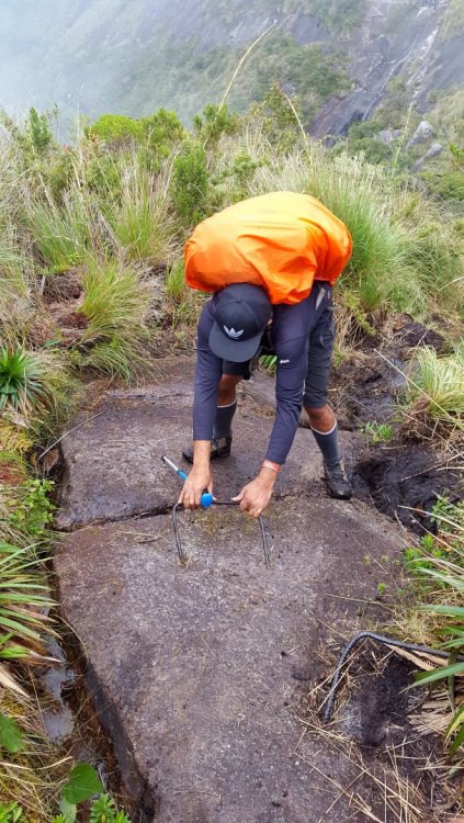 Expedição a Serra dos Órgãos Fase 3 Expedição a Serra dos órgãos Fase 3 Portal do Hércules. 48 Km 19 a 22 Abril 2017 O roteiro recomendado tem início na Portaria do parque em Petrópolis, localizada no bairro do Bonfim. O sentido Petrópolis-Teresópolis se justifica tanto pela menor dificuldade na passagem de determinados trechos críticos, quanto pela beleza da paisagem, podendo-se admirar de frente a majestosa cadeia de montanhas da Serra dos Órgãos. Primeiro dia: Bonfim-Castelos do Açú Duração estimada: 6 horas A travessia começa na Sede Petrópolis do PARNASO, no bairro do Bonfim. Após cerca de 40 minutos na trilha chega-se à entrada para a Gruta do Presidente e a Cachoeira Véu da Noiva. Mais 50 minutos de caminhada e chega-se à Pedra do Queijo, um bom local para descanso com vista panorâmica para o Vale do Bonfim e os picos da Alcobaça, do Alicate e outras montanhas de Petrópolis. Após mais 40 minutos de subida chega-se ao Ajax, local com fonte de água. O acampamento é proibido no local. Após a passagem pelo Ajax inicia-se o trecho de subida mais íngreme de Petrópolis. Conhecido como Isabeloca, em homenagem a uma suposta passagem pelo local da princesa Isabel em lombo de mulas, este trecho encontra-se bastante erodido. A situação é agravada pelos diversos atalhos que a equipe do parque e voluntários vêm tentando fechar para evitar o agravamento da situação. Ao fim da Isabeloca chega-se ao Chapadão do Açu, trecho mais plano de onde já se avista a Pedra do Açu, também conhecida como pico do Cruzeiro, ponto mais alto de Petrópolis, e os Castelos do Açu, interessante formação rochosa cheia de reentrâncias onde é possível se abrigar da chuva e do vento. Próximo aos Castelos do Açu existe um dos dois Abrigos de Montanha ao longo da Travessia (o outro sendo na Pedra do Sino) e a área de camping adjacente. Este é o local do primeiro pernoite. Segundo dia: Portal do Hércules- Interior Castelos do Acú- Cabeça de Índio- Cruzeiro Duração aproximada: 6 horas Seguindo na direção leste chega-se ao Morro do Marco após cerca de 30 minutos. O local é facilmente identificado pela pirâmide de pequenas pedras que dá nome ao morro. No Morro do marco é possível pegar uma variante da trilha e conhecer os Portais de Hércules. Retornaremos para o castelo do açu, onde conheceremos o interior do Castelo e logo após vamos na cabeça de Indio e no Cruzeiro ver o por do sol Terceiro dia: Castelos do Acú-Pedra do Sino Duração estimada: 7 horas Seguindo na direção leste chega-se ao Morro do Marco após cerca de 30 minutos. O local é facilmente identificado pela pirâmide de pequenas pedras que dá nome ao morro. No Morro do marco é possível pegar uma variante da trilha e conhecer os Portais de Hércules, uma espécie de mirante na beira das vertentes mais inclinadas da Serra dos Órgãos, com bela visão do vale da Morte. Descendo o Morro do Marco, em cerca de 30 minutos chega-se ao Vale da Luva, local coberto pela interessante mata nebular, com grande abundância de plantas epífitas, entre as quais destacam-se orquídeas endêmicas da Serra dos Órgãos. O Vale é cortado por um pequeno riacho onde é possível se refrescar e encher os cantis. O local é uma alternativa de acampamento para aqueles que pretendam fazer a travessia com apenas um pernoite ou para roteiros mais longos do que três dias. Em seguida inicia-se a subida do Morro da Luva. O cume é atingido em cerca de 30 minutos. Após a descida em superfície rochosa, onde a trilha não é bem marcada e o risco de se perder em dias de neblina é alto, chega-se à Cachoeirinha (mais 30 minutos), local com água abundante e ponto recomendado para descanso. A subida do Elevador, logo após a Cachoeirinha, é uma escada de ferro que exige equilíbrio para passar com mochilas cargueiras (foto ao lado). Na seqüência chega-se, após cerca de 40 minutos, ao Morro do Dinossauro, um dos pontos mais altos do parque, de onde já é possível avistar a Pedra do Sino, o Vale das Antas e a Pedra do Garrafão. A descida até o Vale das Antas leva cerca de 40 minutos. No vale estão outras nascentes do Rio Soberbo e o local tem água o ano inteiro. O camping é proibido no local em função da fragilidade do ambiente e das nascentes do rio Soberbo. Após mais uma subida íngreme chega-se ao Dorso da Baleia, em frente à vertente da Pedra do Sino. Do local é possível avistar a maior parede de escalada (bigwall) do Brasil, onde estão as vias Franco-Brasileira e Terra de Gigantes. Após a descida de uma grota, inicia-se a subida do paredão que leva à Pedra do Sino. A subida é íngreme e a passagem conhecida como Cavalinho é o ponto mais perigoso da travessia (foto abaixo), sendo obrigatório o uso de cordas. Após o Cavalinho, o montanhista segue por uma, estreita trilha que contorna a Pedra do Sino até encontrar a trilha de subida para o cume, ponto culminante da Serra dos Órgãos (2.263m). Dependendo da hora de chegada neste ponto, pode-se optar pela subida ao cume ou descida para montar o acampamento ou se instalar no abrigo da Pedra do Sino (Abrigo 4). É proibido acampar no cume da Pedra do Sino. A subida até a Pedra do Sino à noite é altamente recomendável, principalmente em noites de tempo bom. A vista da cidade do Rio de Janeiro à noite é impressionante e vale o passeio. Quarto dia: Pedra do Sino-Teresópolis Duração estimada: 5 horas O percurso do terceiro dia inclui apenas a descida da Pedra do Sino até a Sede Teresópolis do PARNASO. São 11 Km de descida relativamente suave com belas vistas do município de Teresópolis e do Parque Estadual dos Três Picos. Recomenda-se uma nova subida ao cume da Pedra do Sino para admirar o nascer do sol. Abaixo da cota 2000m, a estrutura da vegetação começa a mudar. O campo de altitude é substituído por uma mata nebular, com grande quantidade de bromélias e orquídeas. A trilha sombreada pela mata passa pelas ruínas do ant