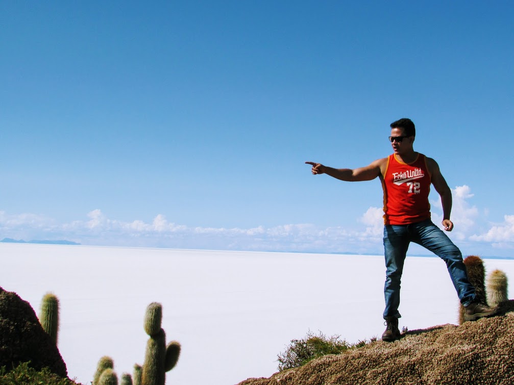 Bom, galera, moramos em uma cidade na fronteira do Brasil com a Bolívia, chamada Guajará-Mirim, no Estado de Rondônia. Cruzando o rio, chegamos a Guayaramérin, cidade localizada no departamento do Beni, onde pegamos o voo, em um sábado, dia 08 de Abril de 2017. Pagamos R$ 692,00 pelas passagens de ida e volta para Cochabamba (R$ 346,00 cada). A estrutura do aeroporto de Guayaramérin é bem precária, resumindo-se à pista de pouso e a uma estrutura metálica coberta onde os passageiros são abrigados. Às 11h fizemos o check-in na sede da empresa Eco-jet; almoçamos e seguimos para o aeroporto, onde amargamos uma espera de mais de três horas, pois o voo atrasou. Chegamos em Cochabamba por voltas das 18h e rumamos para a casa de uns amigos, que nos hospedaram até terça-feira (11/04). Em Cochabamba, aproveitamos o domingo (09/10) para conhecer o mercado La Cancha, uma enorme feira livre cheia de brechós e diversas lojas com preços convidativos, onde aproveitei e comprei uma jaqueta de couro por R$ 135,00. No fim da tarde, visitamos o Cristo da Concórdia, o cartão-postal da cidade, onde assistimos a um belíssimo pôr do sol. Cochabamba é uma cidade cheia de opções para a noite, com barezinhos e restaurantes de excelente qualidade. Gostei mais de lá do que de La Paz, a qual conheci em outra ocasião. Deixamos a segunda-feira para acertarmos os demais detalhes da viagem. Compramos uma passagem, para o dia seguinte, de trem, o Expresso Del Sur, de Oruro até Uyuni. Esse trem só sai às terças-feiras e sextas-feiras, às 14h30min. A passagem foi adquirida antecipadamente por uma Agência de Viagens chamada Viccio Tours, super confiável, que também nos emitiu as passagens aéreas. Pagamos R$ 60,00 pela passagem, na classe executiva. Compramos, também, na rodoviária, uma passagem de Cochabamba até Oruro, com saída às 6h da manhã, pela qual pagamos cerca de R$ 17,00. Saímos de Cochabamba com destino a Oruro no horário marcado. A distância entre as duas cidades é curta, cerca de 215 km, mas como a estrada é só de subidas e de curvas sinuosas, levamos em torno de 4h30min até chegar ao destino. Lá chegando, pedimos a um taxista que nos levasse até a imagem da Virgen de Socavón, padroeira dos mineradores, maior imagem dedicada à Nossa Senhora erigida na América do Sul. Essa santa é cheia de mistérios e histórias a envolverem o sincretismo religioso dessa cidade, conhecida por seu exótico carnaval. Sacamos algumas fotos e o taxista nos deixou em um restaurante ao lado da estação de trem. Pagamos pelo almoço cerca de R$ 30,00 e, detalhe, no restaurante não tinha wi-fi. Às 14h30min o trem partiu de Oruro com destino a Uyuni. A distância entre as cidades é de cerca de 318km, mas como o trem se move em velocidade lenta, só chegamos ao itinerário às 21h30min. Você pode optar fazer a viagem em menos tempo, caso queira ir de ônibus. Há diversas empresas que fazem esse trajeto de Oruro; Não vale a pena comprar passagem de trem que não seja na classe executiva, pois é uma verdadeira muvuca e certamente você não terá sossego em ter de dividir um banco que não reclina com mais outras três pessoas por sete horas seguidas de viagem. O trecho de trem é lindo, com paisagens impressionantes. O trem não é luxuoso, mas fornece serviço de bordo e há um vagão climatizado onde se pode comer bem e tomar cervejas locais, como a deliciosa Wari. Chegando em Uyuni, fomos diretamente para o hostel, que reservamos pelo booking.com. Optamos pelo Reina do Salar. Pagamos uma diária, em quarto compartilhado e banheiro não privado, por R$ 60,00, por pessoa. Deixamos lá as coisas, tomamos um banho e fomos em busca de comer algo. A cidade tem uma rua principal com várias opções de restaurantes. Fazia um frio imenso, escolhemos uma pizzaria que tinha aquecedor e wi-fi e nos alimentamos. Amanhecemos o dia e fomos em busca de uma agência para fechar o passeio. O amigo da Viccio Tour nos indicou a Manager, com quem fechamos o passeio completo de 3 (três) dias, por R450,00, com quase tudo incluso (café da manhã, almoço, jantar), com exceção da taxa de R$ 75,00 para visitar a Laguna Colorada, a taxa de R$ 17,00 para a Isla Incauhasi, além dos banhos por onde passarmos, pelos quais devemos pagar cerca de R$5,00. Éramos um grupo de 6 (seis) pessoas, quatro brasileiros e dois venezuelanos. Voltamos para o hostel e às 10h30min o motorista veio nos buscar, em um 4x4. 1º DIA Iniciamos o passeio passando em uma tenda para comprar água e alguns lanchinhos. Recomendo que cada um compre cerca de 5l de água. É imprescindível que levem remédio para dor de cabeça, dor de barriga, enfim, primeiros socorros. Seguimos para o Cemitério de Trens, onde tivemos uns 30min para tirarmos algumas fotografias, depois seguimos para um lugarejo bom para comprar artesanato e onde almoçamos (quinoa, batatas, salada, banana cozida e carne de rês). Nosso motorista era ótimo e bem atencioso, um senhor muito educado chamado Hugo. Depois do almoço rumamos para o meio do Salar e em menos de uma hora chegamos ao monumento do Rali Dakar. A imensidão do Salar impressiona e nos deixa hipnotizado. Não conseguiria descrever com palavras a sensação de estar nesse lugar deslumbrante, mas as fotografias aqui anexadas dão um pouco da dimensão dessa beleza. Tiramos algumas fotografias também nesse lugar dedicado a diversas bandeiras de vários países e times de futebol e logo depois nos dirigimos a Isla Incauhasi, a Ilha dos Cactos Gigantes. Aqui ficamos em torno de duas horas. É uma caminhada íngreme, mas bela. Do alto temos uma visão perturbadoramente bela da imensidão branca de sal por trás dos enormes cactos seculares. Descemos a ilha e fomos dar um passeio pelo deserto, onde escolhemos um local ermo para tirarmos fotos em perspectiva. Depois, saímos em busca de um espelho d'água. Por sorte, nessa época ainda encontramos um trecho alagado, onde tiramos as melhores fotos 