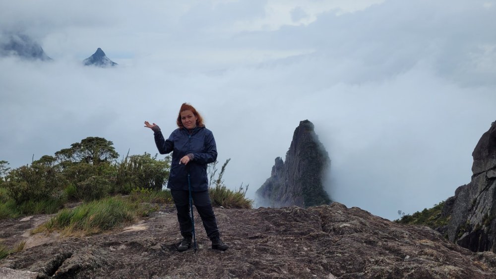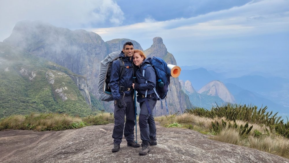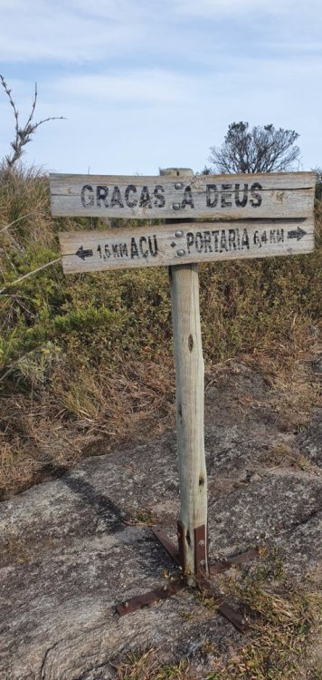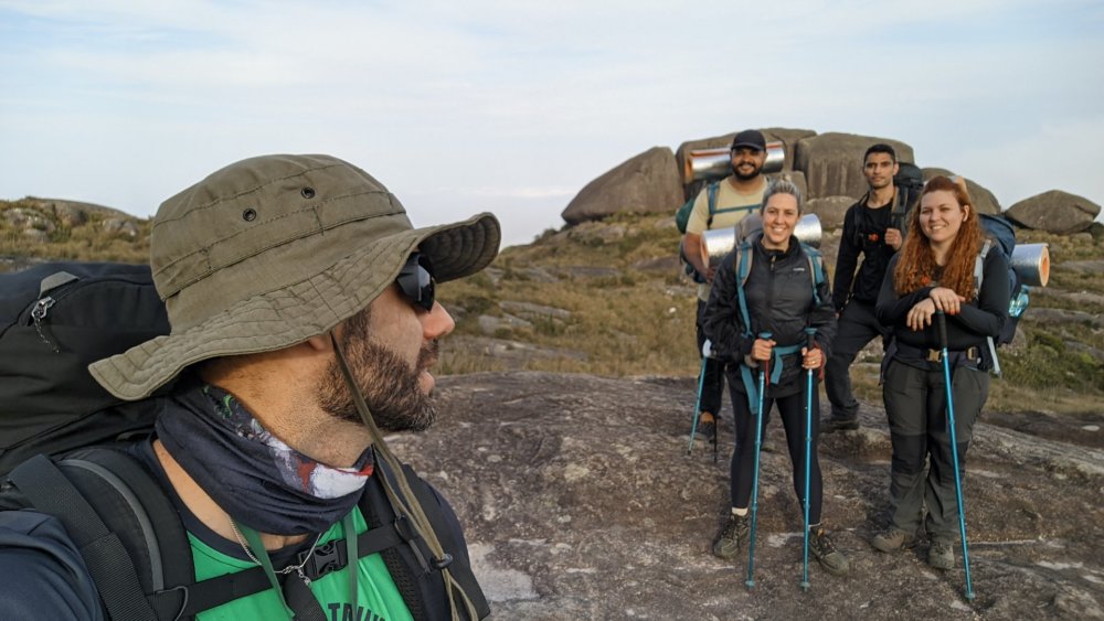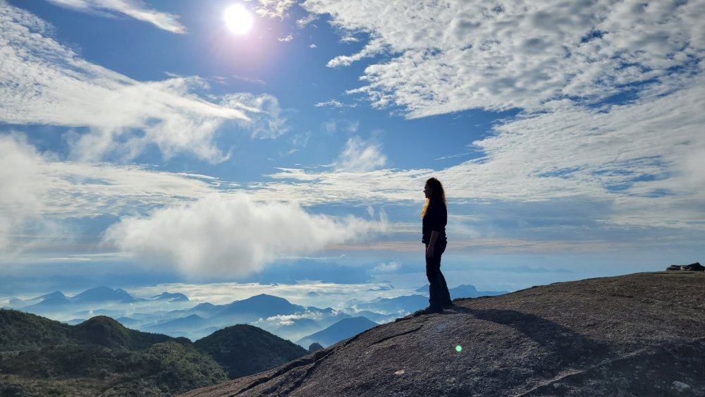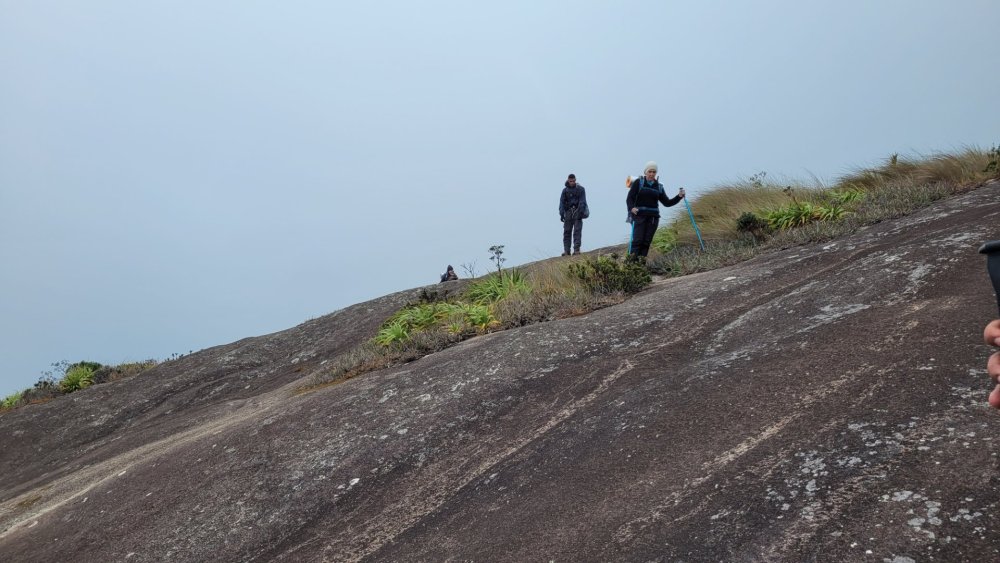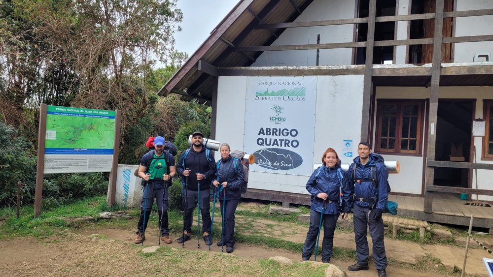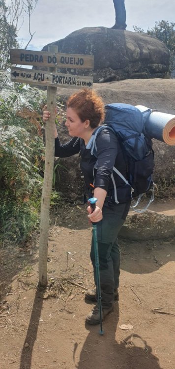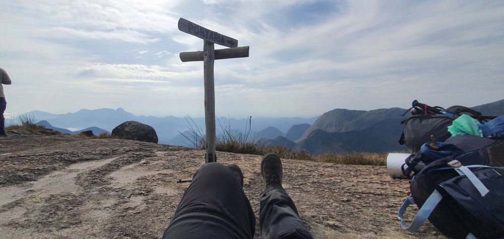 - Desde que me meti nessa vida de trekking, tenho subido de dificuldade aos poucos e eis que chegou vez da barraca e do saco de dormir- Agência contratada: @botasnatrilha (Instagram) - R$800,00 por pessoa (agosto de 2022) - incluído transporte desde o centro do Rio de Janeiro (IDA E VOLTA) e as jantas na montanha. Recomendo DEMAIS especialmente por esse transporte desde o Rio, quebrou um galho! Pessoal acha que chegando em Petrópolis a entrada do parque fica do lado da Rodoviária kkkkk não gente, é bem longe, estrada bem íngreme, estreita - foi muito conveniente esse tranfer está incluído! Os refúgios na Serra dos Órgãos seguem fechados por tempo indeterminado, apenas o camping está aberto. No entanto, podemos usar o banheiro que possui um chuveiro gelado. 06/08 - sábado (pré travessia) Chegamos eu e meu marido no Rio ao meio-dia. Fomos andando do Santos Dummont até um AirBNB na Lapa. Fizemos mercado para comprar os lanches de trilha que não estavam inclusos no pacote comprado com a agência. Depois disso, tudo deu errado. O AirBNB era o mais barato que eu achei e me arrependi profundamente por isso. Barulho externo (afinal era Lapa, numa noite de sábado) além da cama desconfortável, pessoas sem noção na casa, sujeira... Dormimos muito pouco e mal. Começamos bem! Só que não. 07/08 - domingo (dia 1) O Daniel (guia da agência) veio buscar a gente no AirBNB, como uma gentileza. Na verdade, o horário combinado era 6h e ele acabou chegando praticamente as 7h, acho que foi uma forma de desculpa rs. No carro já estavam o Valdir e a Débora, o outro casal que iria com a gente pra trilha. Seguimos em direção a Petrópolis. Chegando na entrada do Parque Nacional da Serra dos Órgãos, pegamos os sacos de dormir, os isolantes térmicos e a barraca que alugamos com a própria agência. Era a primeira vez que iria dormir em um saco de dormir e fiquei assustada com o peso que teria que levar. Mas bora! Também coloquei a barraca na minha mochila porque meu marido já estava com os litros extras de água. Eu fiquei com 12,5kg e ele com quase 14kg (ele leva mais roupa também porque é muito friorento). Começamos a subir as 10h. Os primeiros 2km foram tecnicamente tranquilos com um desnível considerável - mas ainda estávamos na sombra. Quando o sol esquentou, ai ficou complicado. Respiração começa a pesar - dou umas paradas mais longas - respiro fundo e sigo, um passo após o outro. As 11h44 - 3,3km depois chegamos - na Pedra do Queijo - primeira parada real. Tomei um lanche, sentei, apreciei a paisagem. "Respira, você consegue! Um passo atrás do outro a gente chega lá". O peso da cargueira judiava, parecia que aumentava a cada metro andado. Seguimos. 13h15 chegamos no Ajax, primeiro ponto de água. Meu marido notando que eu estava sofrendo com o peso da cargueira tirou a barraca da minha mochila e colocou na dele. Nisso minha mochila abaixou 2kg (indo pra 10,5kg) e a dele subiu 2kg (indo pra quase 16kg). Um gentleman, que homem! “Bom, deixa eu levar a água pelo menos”? “Tá bom”. Continua subindo e tomando sol na cabeça - Nunca mais vai acabar isso aqui? Lágrimas começaram a cair, "será que eu ainda não tava preparada?" Mas ai eu olhei no horizonte, um tapete de nuvem vinha vindo mais abaixo, chegando devagar em meio as montanhas. Que coisa linda! Vou continuar, com certeza. As 14:36 terminamos de subir todo aquele trepa pedra que parecia que nunca mais ia terminar. Ali sentamos de novo, sensação de vitória. Tiramos muitas fotos e continuamos. 15h18 chegamos no "Graças a Deus" só faltavam mais 1,6km que alegria! Nisso nosso parceiro de trilha quis subir o drone, por isso acabamos perdendo um bom tempo ali - que não foi incomodo algum já que o clima tava ótimo e a paisagem incrível. Por volta de 17h45 estávamos montando pela primeira vez uma barraca na vida. O guia nos orientou e assim foi. Jantamos macarrão com linguiça. Eu ainda arrisquei um banho muito rápido no chuveiro mega gelado do refúgio. Mas fiz bem, depois que coloquei a roupa pra dormir fiquei até mais quente. Entrei num saco de dormir. É ruim mesmo dormir no chão duro, mas o cansaço é tanto que até parecia macio. Apaguei. Essa primeira noite, a mínima foi de 11 graus. O Daniel falou que dessa temporada de 2022 foi a travessia “mais quente” que ele tava fazendo. O que na verdade não foi uma coisa muito boa não, já falo porquê. Pedra do Queijo Fim da subida do primeiro dia Grupo na Pedra do Açu 08/08 – segunda-feira (dia 2) Acordamos ainda escuro, era umas 4h30 para tentar pegar o nascer do sol no Morro do Marco. Infelizmente o tempo estava absolutamente fechado – tudo branco. Tomamos nosso café da manhã ali em meio a neblina (lembra do calor? A travessia mais quente do ano? Então...) Nesse roteiro a agência também leva a gente nos Portais do Hércules, o que envolvia um ‘desvio’ da trilha original, 1,5km pra ir mais 1,5km pra voltar, ou seja, 3km a mais pra andar nesse segundo dia. Embora o tempo estivesse fechado, tínhamos esperança que talvez depois de andar até lá alguma coisa mudasse. Deixamos nossas mochilas na bifurcação e seguimos para os Portais. Infelizmente, chegou lá, tudo branco. Dava pra ver apenas alguns picos ao longe, a pontinha do Dedo de Deus, o Cabeça de Peixe e mais alguma coisa. No geral: branco. Isso deixou o clima do grupo bem pra baixo, andamos 3km a mais por nada. Voltamos para pegar as mochilas e seguimos para o Morro da Luva. A minha moral tava muito baixa. Os Portais eram um ponto muito alto do rolê e a gente não viu nada. Foi muito frustrante, era como se tivessem tirado nossa recompensa. Quando a gente começou a subir o Morro da Luva eu tava bem mal para péssima. Que subida lazarenta e eu nem vi a melhor parte da travessia! Minha motivação tava acabando... Mas vamos continuar. No topo do Morro da Luva, ainda em meio a neblina, vi que tinha que ter escolhido um pouco melhor a minha segunda pele, minhas r