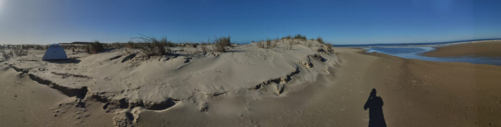 Eu e minha esposa Magali decidimos em setembro de 2020 fazer a travessia. Começamos a planejar e nos preparar desde então. Definimos que a melhor data seria na semana santa pois seria mais fácil de conciliar férias, folga etc e ainda daria uma margem de segurança maior caso fosse necessário estender a travessia. Fomos com o objetivo de caminhar no mínimo 35km/dia mas tentar fazer 40km/dia, que reduziria em um dia a travessia. Inicialmente iríamos seguir no sentido sul (Rio Grande x Barra do Chuí), porém na semana que antecederia nosso início a previsão indicava maior incidência de vento sul e optamos em inverter, saindo da Barra do Chuí no sentido norte. Saímos de Itapema/SC de carro até a rodoviária de Pelotas/RS no dia 27/03 onde deixamos nosso carro e pegamos o ônibus até Chuí. Chegando em Chuí levamos 20min até conseguir um taxi para a Barra do Chuí (lá não existe Uber/99 etc). Pernoitamos em um Airbnb lazarento, mas enfim, a ideia era ficar bem próximo da praia para conseguir começar a caminhada cedo. Obs: não conseguimos sinal de celular na Barra do Chuí. Dia 01 Iniciamos a caminhada as 06:00 do dia 28/03/2021 com vento sul moderado. Nossa ideia inicial era fazer uma parada a cada 10km, porém preferimos tocar direto até Hermenegildo e nos abrigar do vento. Foram aproximadamente 13km até essa primeira parada. Aproveitamos para comunicar os familiares. Trocamos as meias e seguimos a caminhada. Logo ao passar Hermenegildo começou uma chuva leve. Vestimos a capa de chuva e continuamos. Poucos km a frente a chuva engrossou, porém não havia local para abrigo e continuamos a caminhada por mais 5km até encontrar um barraco de pescador onde nos abrigamos por aproximadamente 1 hora até a chuva passar. Ao longo do dia o sol ia e vinha. Como era domingo, vários moradores de Hermenegildo passavam de carro. Estávamos aproximadamente no KM 38, totalmente secos quando uma chuva torrencial nos atingiu. Sem possibilidade de abrigo, seguimos até completar 40km e montamos acampamento em meio as dunas (agora sem chuva). Nessa noite ventou pouco, porém a chuva recente e o orvalho que se formou acabou gerando um pouco de condensação no interior da barraca. Jantamos, cuidamos dos pés e eu percebi a primeira bolha inesperada (bolha nos mindinhos eu já esperava). Distância: 41km (areia fofa) Dia 02 Despertador tocou as 5:00, comemos, organizamos as coisas e levantamos acampamento. Eram aproximadamente 6:45 quando começamos a caminhar com as roupas e tênis molhados. Decidimos racionar a água para reabastecer na casa do Sr. Ricardo que possui poço e atingiríamos entre 10 e 11 horas da manhã. Faltando 1 km da casa do Sr. Ricardo, avistamos uma vaca deitada na beira da praia. Minha esposa achou que ela estivesse morta, mas eu percebi movimentos de orelha. Estávamos a 50mt dela quando nos observou e levantou assustada. Virou-se contra nós e avançou em nossa direção. Nesse momento tentei chamar atenção para mim e me afastei da minha esposa. Imediatamente empunhei os bastões como se isso fosse resolver alguma coisa. A vaca recuou e virou da direção da Magali quando pedi para ela ficar parada e fui até ela. A vaca ameaçou novamente e juntos erguemos os bastões lentamente até que a vaca recuou e se afastou pelo outro lado. Lentamente nos desviamos e seguimos nosso rumo. A adrenalina subiu bastante nessa hora e o susto foi enorme. Melhor que nada aconteceu e ficou apenas por isso. Chegamos na casa do Sr. Ricardo e chamamos por ele. Não estava, enchemos nossas garrafas e tratamos com cloro. Enquanto isso, aproveitamos a sombra para um descanso e para trocar as meias. Descobri uma nova bolha se formando em baixo do outro pé. Quando estávamos para sair chegou um veículo com 3 homens que estavam construindo uma nova casa para o Sr. Ricardo mais aos fundos (pois a atual está quase sendo tomada pelas dunas). Conversamos um pouco e seguimos nossa caminhada. Por ser 2a-feira, nesse dia praticamente não tivemos contato humano. Nesse dia encontramos o único caminhante que veríamos ao longo da nossa caminhada. Nos cumprimentamos, conversamos rapidamente e cada um seguiu seu destino. Nós querendo seguir e ele querendo terminar logo. No meio da tarde pegamos chuva novamente. Decidimos proteger os tênis com o saco que usávamos para atravessar os arroios pois não queríamos andar novamente com os pés molhados. Esse foi o pior dia e a pior noite, o dia todo foi um misto de "chega, vamos desistir, etc", por sorte não passou ninguém oferecendo carona. Quando paramos para acampar, ventava sudoeste e então montei a barraca abrigado por dunas nesse lado. Só havia abertura pequena para o leste e foi ai que começou nossa pior noite. Já estávamos dormindo (aproveitamos 21:30) quando o vento virou leste com chuva forte. Vacilei ao não reforçar o estaqueamento da porta que estava exposta ao leste e aconteceu o óbvio, o speck soltou e essa lateral "caiu". Fiquei sentado encostado no bastão para a lateral ficar de pé. Quando estiou sai à procura de algo para ancorar essa porta e achei um barril cortado que coloquei sobre o speck e enchi de arreia. Nessa noite continuou ventando muito e chovendo diversas vezes. Distância: 40km (areia fofa com bem pouca área firme) Dia 03 Despertador tocou as 5:00, estava chovendo e botei o soneca para + 15min. Continuava chovendo e seguimos dormindo até aproximadamente 6:15 quando parou de chover, então comemos e saímos para caminhar já eram 8:00. Decidimos que 30km estaria bom para esse dia. Seguimos +/- a ideia do dia anterior e racionamos a água para reabastecer no Farol Albardão que estava a 7-8km de distância. Fomos muito bem recebidos no Albardão onde bebemos água e reabastecemos todas nossas garradas. A água lá é potável, então não tratamos nem filtramos. Nesse dia percebemos que uma parada a cada 10km não era sustentável e decidimos parar a cada 7km. Nesse dia comecei a sentir fortes dores na ju