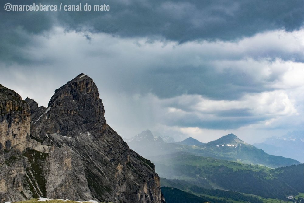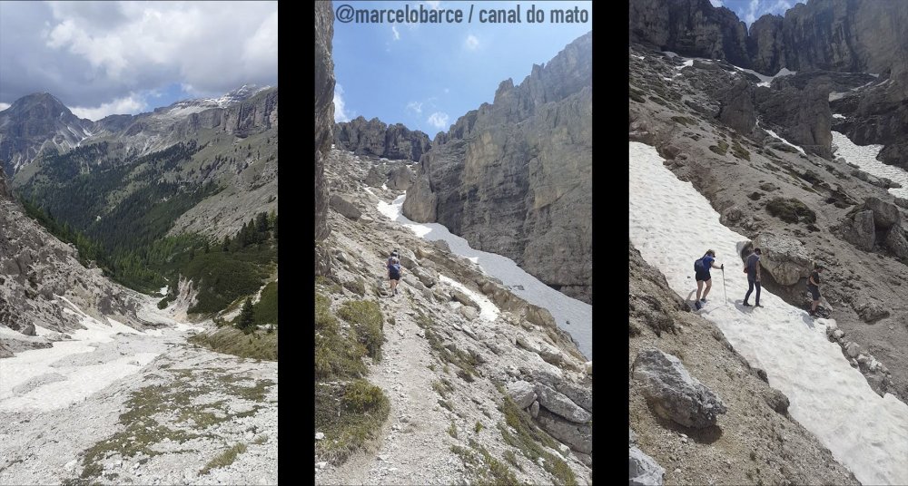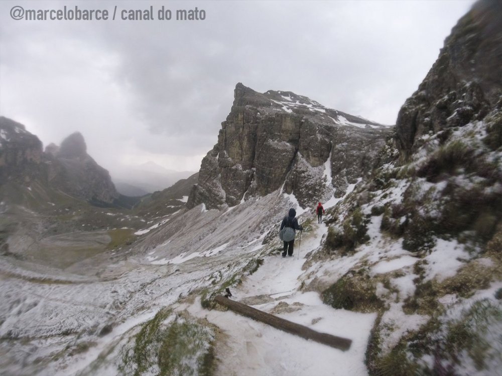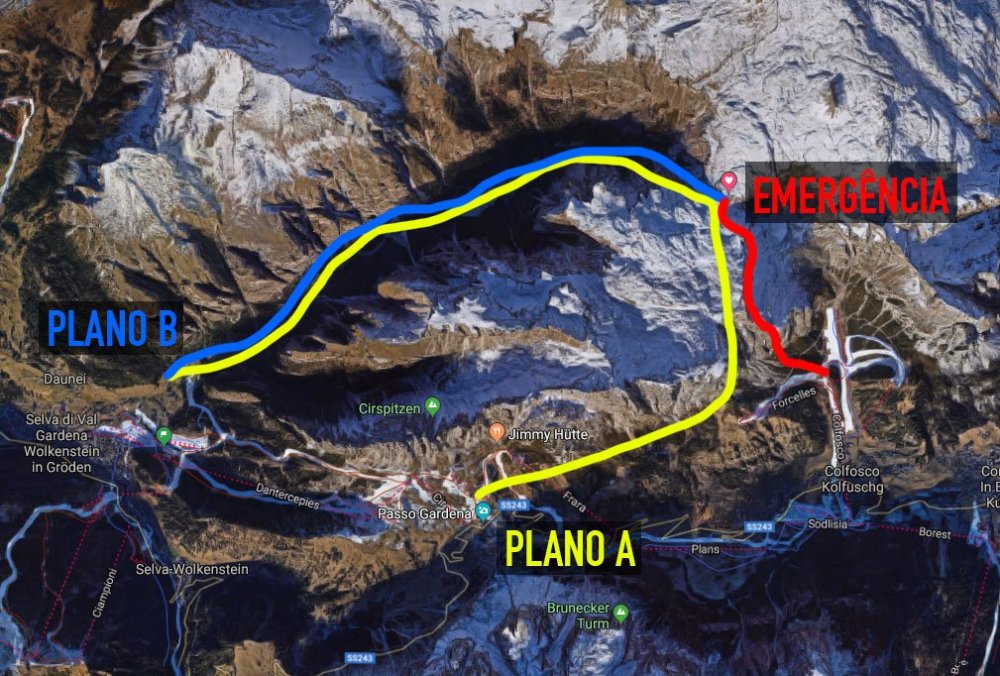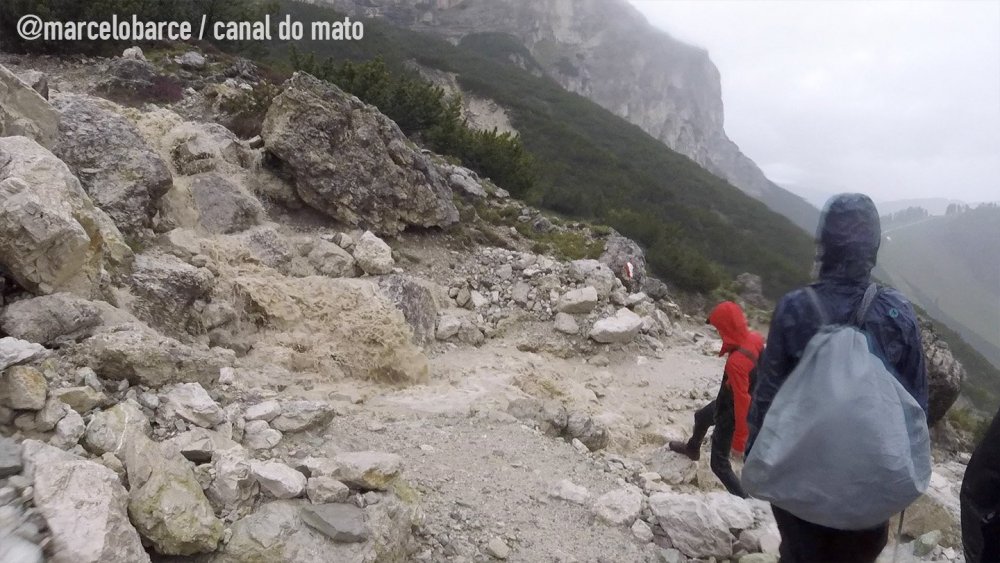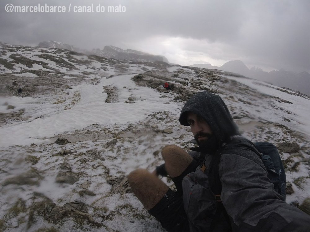 (relato em vídeo no fim do post) Na primavera desse ano, fui visitar a região de Trentino-Alto Àdige, para conhecer os Dolomiti, no norte da Itália. Me hospedei no Youth Hostel Bolzano, que era um dos únicos na região. Fiz 3 dias de trilhas, mas vou falar primeiro dessa travessia que eu registrei em foto e vídeo. No hostel, eu conheci 3 americanos que também tinham bastante experiência em trilhas, e fui com eles. Era primavera (4 de junho), um dia ensolarado com previsão de chuva para o fim da tarde, fazia uns 27 graus de temperatura. A chuva parecia inofensiva, mas se revelou uma tempestade assustadora no alto da montanha e deixou a temperatura NEGATIVA. Este foi um dos dias mais incríveis, bonitos e assustadores da minha vida. A ROTA DA TRAVESSIA Tomamos um ônibus circular de Bolzano para a bela cidade de Selva di Val Gardena, 1 hora de viagem ao preço de 5 EUROS, esse seria o único custo do passeio. PLANO A: pegaríamos o bondinho de ski Dantercepies (bandeirinha verde do mapa, abaixo do plano B) e a partir dali, daríamos uma volta no Monte Puez, um lugar com vistas incríveis, e desceríamos pelo vale de Valunga (trecho azul do mapa). PLANO B: começaríamos a trilha pelo final do Plano A, o vale Valunga, e ao chegar no ponto mais alto (o coraçãozinho do mapa), voltaríamos pelo mesmo caminho. EMERGÊNCIA: esta foi uma rota de fuga que precisamos tomar para fugir da tempestade RELATO O dia estava lindo, a previsão era de sol com nuvens para a tarde toda com uma garoa no fim da tarde. Infelizmente, o bondinho Dantercepies estava em manutenção, e por isso fomos seguir o plano B, começando pelo vale de Valunga, que começa nesta foto acima. Valunga é fantástico, se parece muito com o vale de Yosemite dos EUA. Inclusive, eu diria que esta rocha em primeiro plano da foto acima é parecida com o famoso "El Capitan". Já estive nos 2 parques nacionais para fazer esta comparação. Os americanos que estavam comigo concordaram, hahaha. O legal do Valunga é que não passa carros no meio. As vistas eram lindas em todos os sentidos. Enfim, começou a grande subida do fim do plano B, uma parte muito íngreme com bastante escalaminhada e alguns trechos de neve bem perigosos em que um escorregão poderia ser fatal. Mas fomos com calma e cuidado, e deu tudo certo. A vista dali era fantástica, mas já começava a dar sinais de chuva. Para nossa surpresa, quando chegamos no final da subida, que era uma passagem de montanha, avistamos uma tempestade assustadora que não era visível antes. Do lado de onde viemos, o clima estava razoável... mas do outro lado da montanha, as nuvens estavam bem escuras e já estava chovendo: PRESTE ATENÇÃO naquela cidadezinha no canto inferior direito da foto, este lugar se chama Colfosco e foi nossa salvação. Estávamos num lugar com pouca visibilidade dos arredores, subi num ponto mais alto antes que fosse tarde, para ver qual seria a direção mais segura para fugir da tempestade: Repare nas duas fotos acima que a chuva já havia mudado de lugar, use a montanha pontuda (monte Sassongher) como ponto de referência. Foi questão de 10 minutos para eu descer e a chuva pegar a gente. Daí pra frente, as coisas só pioraram. Nosso plano de voltar pelo mesmo caminho foi por água abaixo (literalmente), porque seria impossível descer aquele trecho íngreme de neve com chuva. Optamos por seguir a trilha do plano A até encontrar um dos abrigos de montanha da região, que estaria a mais ou menos 2 horas de distância. Porém, este plano também não deu certo. Começou uma tempestade de granizo muito forte com MUITOS RAIOS e nós tivemos que nos separar e abaixar, para diminuir a chance de tomar um raio. Estimamos que a temperatura baixou para -5 graus. A paisagem que antes estava verde e ensolarada, ficou cinzenta, coberta de neve e granizo. Estávamos todos com casacos corta-vento impermeáveis, bem protegidos, mas vestindo shorts, o que obviamente tornou a experiência bem fria, apesar de suportável (graças às jaquetas). O local era SUPER EXPOSTO, pois se tratava de um platô gigante. O melhor que podíamos fazer era tentar ficar numa parte menos alta. Na foto: eu em primeiro plano, Micky de jaqueta vermelha no fundo, Nathan de preto mais ao fundo, Elsa de preto no canto esquerdo da foto. Foi aí que traçamos a rota de emergência! Nós não voltaríamos mais para Val Gardena, porque as duas rotas (plano A e B) estavam extremamente perigosas, e eram os únicos caminhos de volta. A prioridade agora era encontrar um abrigo para salvar a nossa pele. Após a chuva diminuir, nós desceríamos para a cidade de Colfosco, que fica do outro lado da montanha e tem uma trilha quase plana cercada por montanhas, que era menos exposta aos raios, mas não menos desoladora. Tivemos que atravessar algumas cachoeiras de lama causadas pela chuva, mas não foi difícil e deu tudo certo: Esta descida pela rota de emergência durou aproximadamente 1 hora e meia, e apesar dos trovões assustadores e da garoa que não parava, essa rota passou segurança. Claramente, foi uma decisão sensata abrir mão de retornar a Val Gardena. Chegando em Colfosco, batemos na porta de uma casa que tinha luzes acesas e fomos recebidos por uma senhora MUITO hospitaleira que nos deu toalhas e preparou um chá para cada um. Rachamos um taxi para Bolzano, que saiu 30 euros por pessoa. Se não fosse isso, o passeio inteiro teria custado apenas 10 euros de ida e volta do ônibus. Ao fim, saiu 35 euros. Valeu a pena? Sim, hahahahahaha. Abaixo, o relato em vídeo, no meu canal, para vocês terem uma noção do que foi: Obrigado, espero que gostem. Qualquer dúvida, é só perguntar