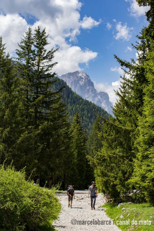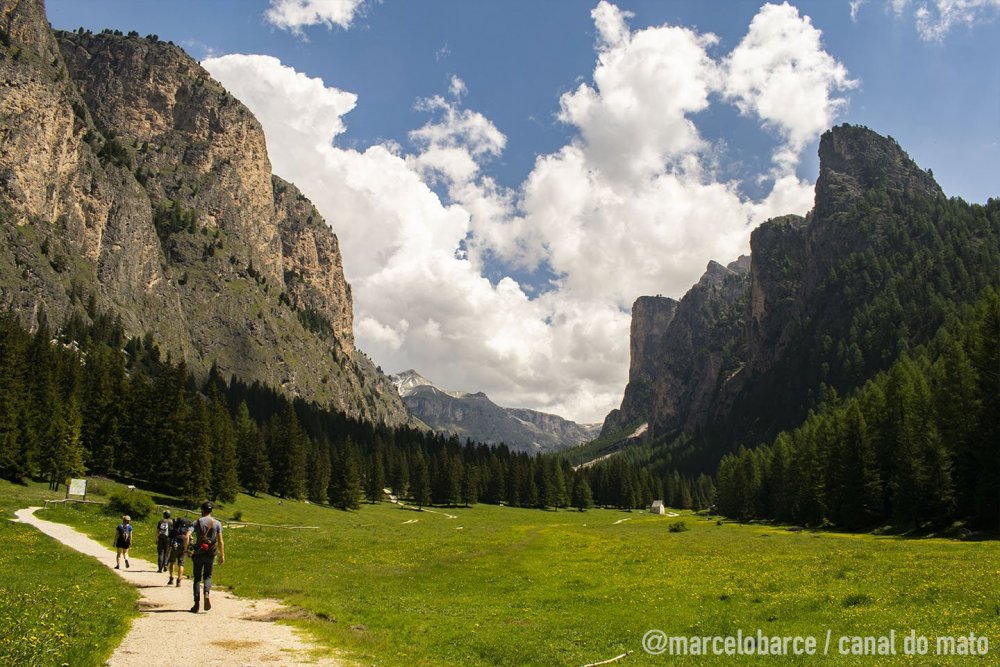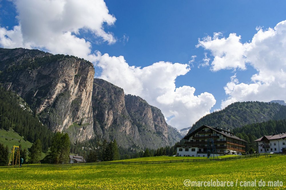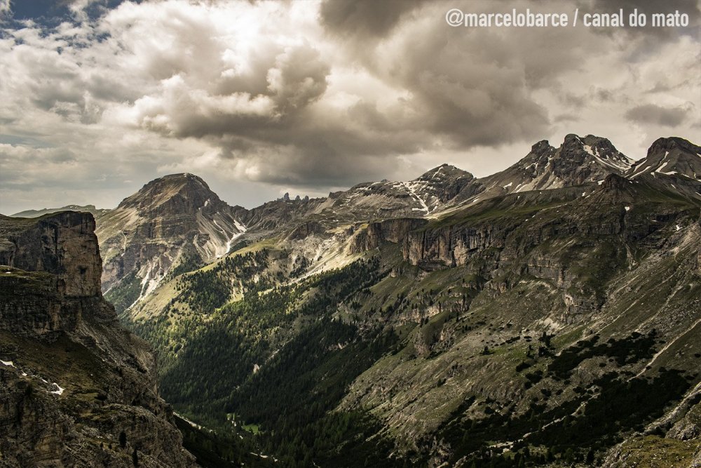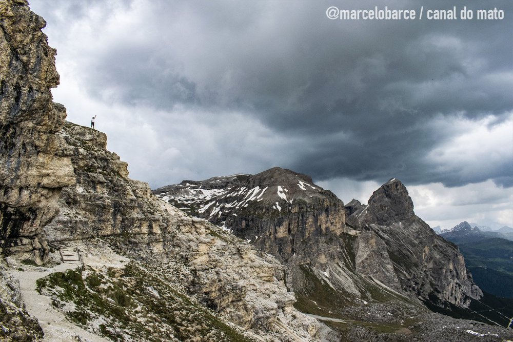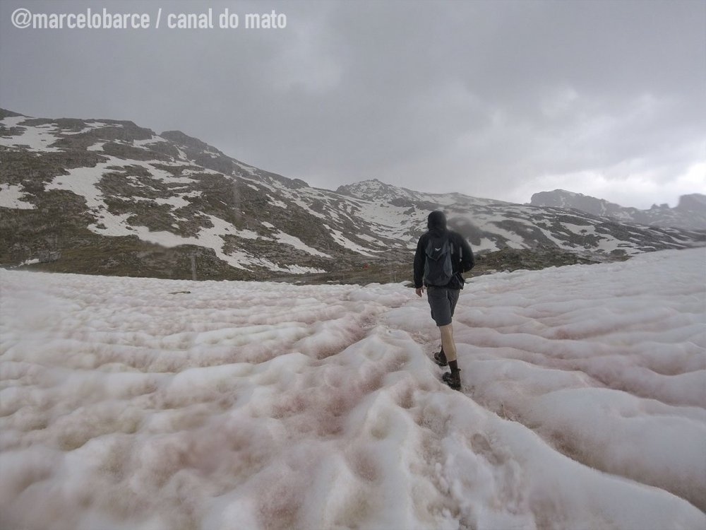 (relato em vídeo no fim do post) Na primavera desse ano, fui visitar a região de Trentino-Alto Àdige, para conhecer os Dolomiti, no norte da Itália. Me hospedei no Youth Hostel Bolzano, que era um dos únicos na região. Fiz 3 dias de trilhas, mas vou falar primeiro dessa travessia que eu registrei em foto e vídeo. No hostel, eu conheci 3 americanos que também tinham bastante experiência em trilhas, e fui com eles. Era primavera (4 de junho), um dia ensolarado com previsão de chuva para o fim da tarde, fazia uns 27 graus de temperatura. A chuva parecia inofensiva, mas se revelou uma tempestade assustadora no alto da montanha e deixou a temperatura NEGATIVA. Este foi um dos dias mais incríveis, bonitos e assustadores da minha vida. A ROTA DA TRAVESSIA Tomamos um ônibus circular de Bolzano para a bela cidade de Selva di Val Gardena, 1 hora de viagem ao preço de 5 EUROS, esse seria o único custo do passeio. PLANO A: pegaríamos o bondinho de ski Dantercepies (bandeirinha verde do mapa, abaixo do plano B) e a partir dali, daríamos uma volta no Monte Puez, um lugar com vistas incríveis, e desceríamos pelo vale de Valunga (trecho azul do mapa). PLANO B: começaríamos a trilha pelo final do Plano A, o vale Valunga, e ao chegar no ponto mais alto (o coraçãozinho do mapa), voltaríamos pelo mesmo caminho. EMERGÊNCIA: esta foi uma rota de fuga que precisamos tomar para fugir da tempestade RELATO O dia estava lindo, a previsão era de sol com nuvens para a tarde toda com uma garoa no fim da tarde. Infelizmente, o bondinho Dantercepies estava em manutenção, e por isso fomos seguir o plano B, começando pelo vale de Valunga, que começa nesta foto acima. Valunga é fantástico, se parece muito com o vale de Yosemite dos EUA. Inclusive, eu diria que esta rocha em primeiro plano da foto acima é parecida com o famoso "El Capitan". Já estive nos 2 parques nacionais para fazer esta comparação. Os americanos que estavam comigo concordaram, hahaha. O legal do Valunga é que não passa carros no meio. As vistas eram lindas em todos os sentidos. Enfim, começou a grande subida do fim do plano B, uma parte muito íngreme com bastante escalaminhada e alguns trechos de neve bem perigosos em que um escorregão poderia ser fatal. Mas fomos com calma e cuidado, e deu tudo certo. A vista dali era fantástica, mas já começava a dar sinais de chuva. Para nossa surpresa, quando chegamos no final da subida, que era uma passagem de montanha, avistamos uma tempestade assustadora que não era visível antes. Do lado de onde viemos, o clima estava razoável... mas do outro lado da montanha, as nuvens estavam bem escuras e já estava chovendo: PRESTE ATENÇÃO naquela cidadezinha no canto inferior direito da foto, este lugar se chama Colfosco e foi nossa salvação. Estávamos num lugar com pouca visibilidade dos arredores, subi num ponto mais alto antes que fosse tarde, para ver qual seria a direção mais segura para fugir da tempestade: Repare nas duas fotos acima que a chuva já havia mudado de lugar, use a montanha pontuda (monte Sassongher) como ponto de referência. Foi questão de 10 minutos para eu descer e a chuva pegar a gente. Daí pra frente, as coisas só pioraram. Nosso plano de voltar pelo mesmo caminho foi por água abaixo (literalmente), porque seria impossível descer aquele trecho íngreme de neve com chuva. Optamos por seguir a trilha do plano A até encontrar um dos abrigos de montanha da região, que estaria a mais ou menos 2 horas de distância. Porém, este plano também não deu certo. Começou uma tempestade de granizo muito forte com MUITOS RAIOS e nós tivemos que nos separar e abaixar, para diminuir a chance de tomar um raio. Estimamos que a temperatura baixou para -5 graus. A paisagem que antes estava verde e ensolarada, ficou cinzenta, coberta de neve e granizo. Estávamos todos com casacos corta-vento impermeáveis, bem protegidos, mas vestindo shorts, o que obviamente tornou a experiência bem fria, apesar de suportável (graças às jaquetas). O local era SUPER EXPOSTO, pois se tratava de um platô gigante. O melhor que podíamos fazer era tentar ficar numa parte menos alta. Na foto: eu em primeiro plano, Micky de jaqueta vermelha no fundo, Nathan de preto mais ao fundo, Elsa de preto no canto esquerdo da foto. Foi aí que traçamos a rota de emergência! Nós não voltaríamos mais para Val Gardena, porque as duas rotas (plano A e B) estavam extremamente perigosas, e eram os únicos caminhos de volta. A prioridade agora era encontrar um abrigo para salvar a nossa pele. Após a chuva diminuir, nós desceríamos para a cidade de Colfosco, que fica do outro lado da montanha e tem uma trilha quase plana cercada por montanhas, que era menos exposta aos raios, mas não menos desoladora. Tivemos que atravessar algumas cachoeiras de lama causadas pela chuva, mas não foi difícil e deu tudo certo: Esta descida pela rota de emergência durou aproximadamente 1 hora e meia, e apesar dos trovões assustadores e da garoa que não parava, essa rota passou segurança. Claramente, foi uma decisão sensata abrir mão de retornar a Val Gardena. Chegando em Colfosco, batemos na porta de uma casa que tinha luzes acesas e fomos recebidos por uma senhora MUITO hospitaleira que nos deu toalhas e preparou um chá para cada um. Rachamos um taxi para Bolzano, que saiu 30 euros por pessoa. Se não fosse isso, o passeio inteiro teria custado apenas 10 euros de ida e volta do ônibus. Ao fim, saiu 35 euros. Valeu a pena? Sim, hahahahahaha. Abaixo, o relato em vídeo, no meu canal, para vocês terem uma noção do que foi: Obrigado, espero que gostem. Qualquer dúvida, é só perguntar