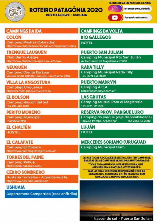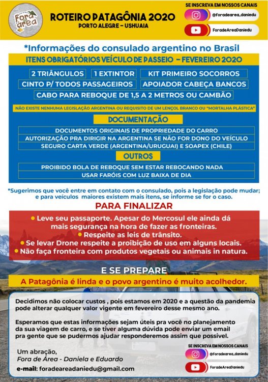 Tudo bem pessoal, Em fevereiro deste ano fomos para o Ushuaia, saindo de Porto Alegre no Rio Grande do Sul. Foram 26 dias conhecendo as belezas da região. Descemos pela Rota 40 até o Ushuaia, e voltamos pela Rota 3. Tentei resumir nesse material as informações que muita gente está me perguntando. Meu gasto total com gasolina foram R$ 2.600 Gasto total da viagem R$ 7,000. (total 2 pessoas) Tem um pdf em anexo com o roteiro, abração Roteiro Patagônia- Fora de Àrea.pdf -