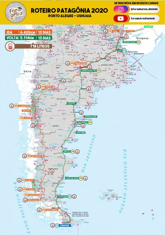 Bom pessoal, há muito tempo venho querendo realizar essa aventura, porém historia normal que se segue, trabalho, dinheiro e tempo, acredito que essas são os principais contra tempos para realizar viagens deste porte. Porém recentemente surgiu a oportunidade de tirar 20 dias de ferias, então realizarei o sonho de viajar até o Ushuaia de carro. (barraca, camping, roots), em 20 dias, sozinho. Venho aqui compartilhar e pedir a vocês dicas de roteiros, viagem, estrada... Como so fiquei sabendo agora que vou conseguir ir (motivo este também de eu ir sozinho), estou montando o roteiro agora, tenho praticamente menos de 2 meses para ver tudo oque preciso e conto com ajuda de vocês. A ideia é sair de Uruguaiana dia 20/12/2019 e chegar sem muitas estadias em 3 ou 4 dias até o Ushuaia (3.700km), de lá ficar alguns dias pela região (creio eu que uns 5 dias), após isso, ir viajando em direção a Santiago no Chile, fazendo estadias nas cidades mais interessantes, de Santiago volto a Uruguaiana. Que são 1700km. Conforme vou atualizando o roteiro e coisas da viagem vou postando aqui.. Agradeço..