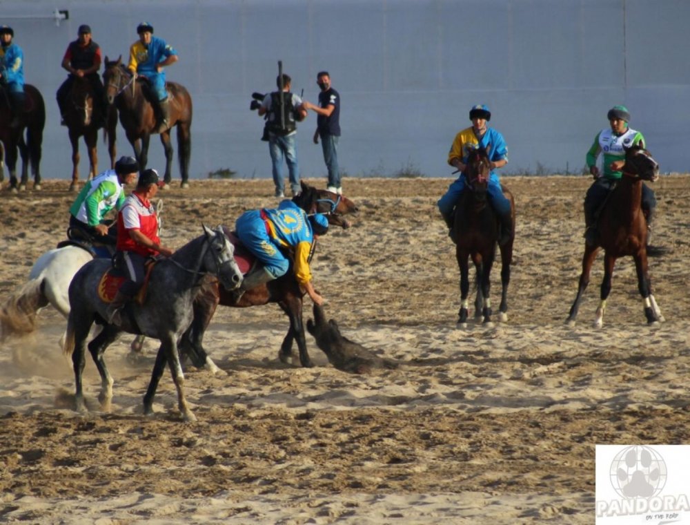 WORLD NOMAD GAMES - QUIRGUISTÃO Nossa experiencia no pequeno país do Quirguistão, que fica na fronteira dos gigantes Cazaquistão e China fica para um próximo post, esse relato é sobre os Jogos Nômades, uma das experiencias mais increíveis que tivemos a oportunidade de participar em nossas vidas: Imagine jogos brutais, tribais realizados a seculos, em todos os países que tem o sangue nômade nas veias, todos reunidos em Cholpon-Ata, no lago Issyk- Kul, maior lago do país. Desde que ficamos sabendo da existência do World Nomad Games, que ocorrem a cada 2 anos desde 2014 no Quirguistão, a ideia de participar de um evento tão único e representativo da cultura nômade não saiu mais da nossa cabeça. Mas ainda estávamos no Cazaquistão e não queríamos passar correndo pelos lugares de natureza, então optamos por chegar apenas para os 2 últimos dias dos jogos. As competições esportivas são a atração central do evento, mas em paralelo, ocorrem diversas apresentações de teatro, música, dança e artes. Representantes de mais de 60 países se enfrentam em dezenas de modalidades, que giram em torno das provas sob o cavalo e de luta livre principalmente. Chegamos à tardinha e fomos direto para o Hipódromo, onde alguma coisa bem emocionante devia estar ocorrendo, considerando os gritos da plateia. Caímos no meio do jogo de Kok Boru, esporte nacional do país e, de longe, aquele que mais encanta as multidões. Imaginem a nossa expressão ao entender o que acontecia em campo: os jogadores, de cima de seus cavalos, perseguiam uma cabra morta, sem cabeça, e deviam arremeçá-lá nos respectivos buracos no fim de cada lado do campo. Na maioria dos arremessos, eles caiam com a cabra (ex-cabra) e tudo pra dentro do buraco, já que imagino a dificuldade de jogar um corpo de 45 quilos montado em um cavalo a galope e em plena velocidade. No meio do caminho, eles se batem e se espancam, visando dificultar o “gol” do adversário. Ficamos bastante impressionados com a brutalidade do esporte, desde o uso de um animal morto até a violência livre entre os jogadores. Mas quando se trata de tradição e cultura, aprendemos apenas a observar. O Kok Boru é jogado há centenas de anos pelos povos nômades, sendo ainda hoje para o Quirguistão e o Afeganistão o que o futebol é para nós. Ficamos desolados ao saber que as competições de caça com águia já haviam terminado. Outra tradição milenar dessas bandas, as águias caçadoras eram extremante importantes para o sustento das tribos nômades ao prover alimento e pele no rigoroso inverno da Ásia Central. Nos dias de hoje, existem pouquíssimos Berkutchi, os homens que ainda mantêm viva a tradição e fazem algumas exibições com suas águias douradas (nome dado devido à cor das penas em sua cabeça). O treinamento das águias caçadoras pode levar até 4 anos e requer práticas um tanto cruéis, como deixar a ave vendada durante a maior parte do tempo, pra que ela dependa inteiramente do seu treinador, e assim esqueça seus instintos selvagens. Durante os Nomad Games pudemos vivenciar de perto alguns esportes totalmente diferentes do que estamos acostumados no Ocidente, em que ficaram evidentes a brutalidade e a raiz primitiva ainda presentes nos povos dessa região da Ásia. Foram imagens pra não esquecer tão cedo. Mais posts e informação no nosso instagram: https://www.instagram.com/pandoraontheroad/