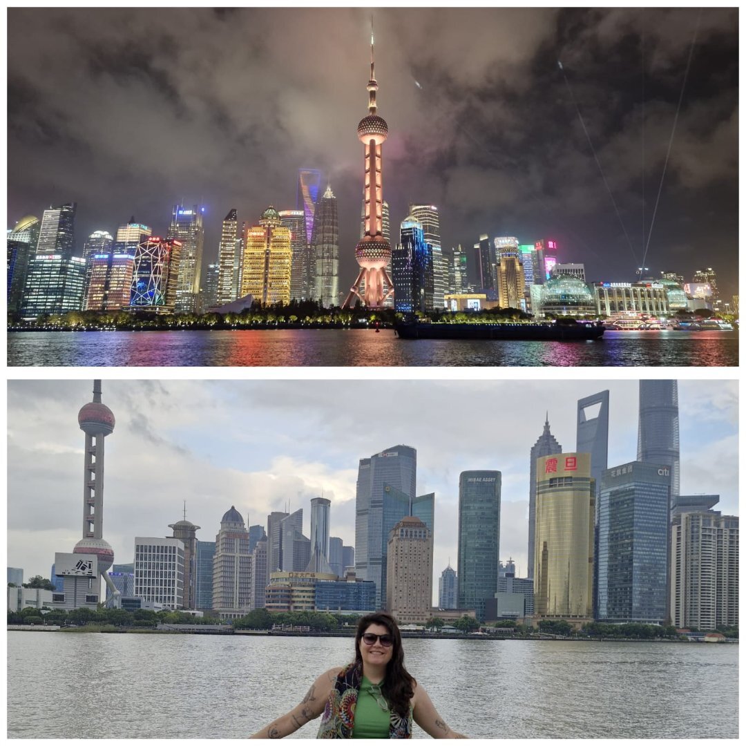 Tem uma região muito famosa de Chongqing, que são construções muito iluminadas na beira no rio (víamos da varanda do quarto tb) que eu gostaria de ter chegado perto, mas me pareceu impossível kk! Quando chegamos até a ponte a ideia era tentar ir neste lugar, mas já estávamos exaustos, com 25 mil passos dados, resolvemos voltar pras imediações da rua de pedestres pra nos despedirmos de Chongqing, no dia seguinte pegaríamos nosso último trem bala na China!