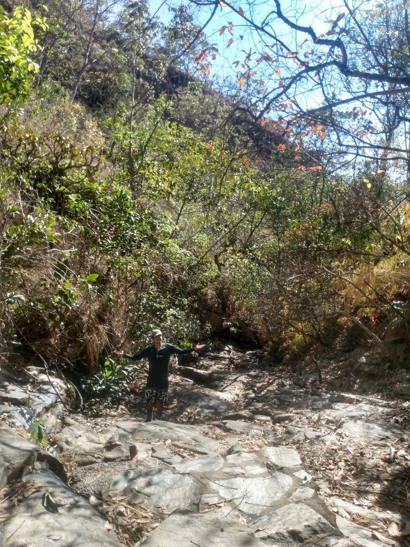 Junto ao totem existe um estacionamento e a cachoeira do bom despacho, que dá bastante gente pelo fácil acesso. Em virtude da época, estava bem seca. Enfim comecei a acompanhar a trilha, subindo a serra. Esta não tem portaria, nem é cercada. Ao que deu a entender é tipo “entre por sua conta e risco”, e dado o isolamento de alguns pontos, creio que não deve ser tão difícil ficar desorientado ou se perder. Mas, há algumas placas no caminho, indicando as direções dos pontos de referência da trilha.