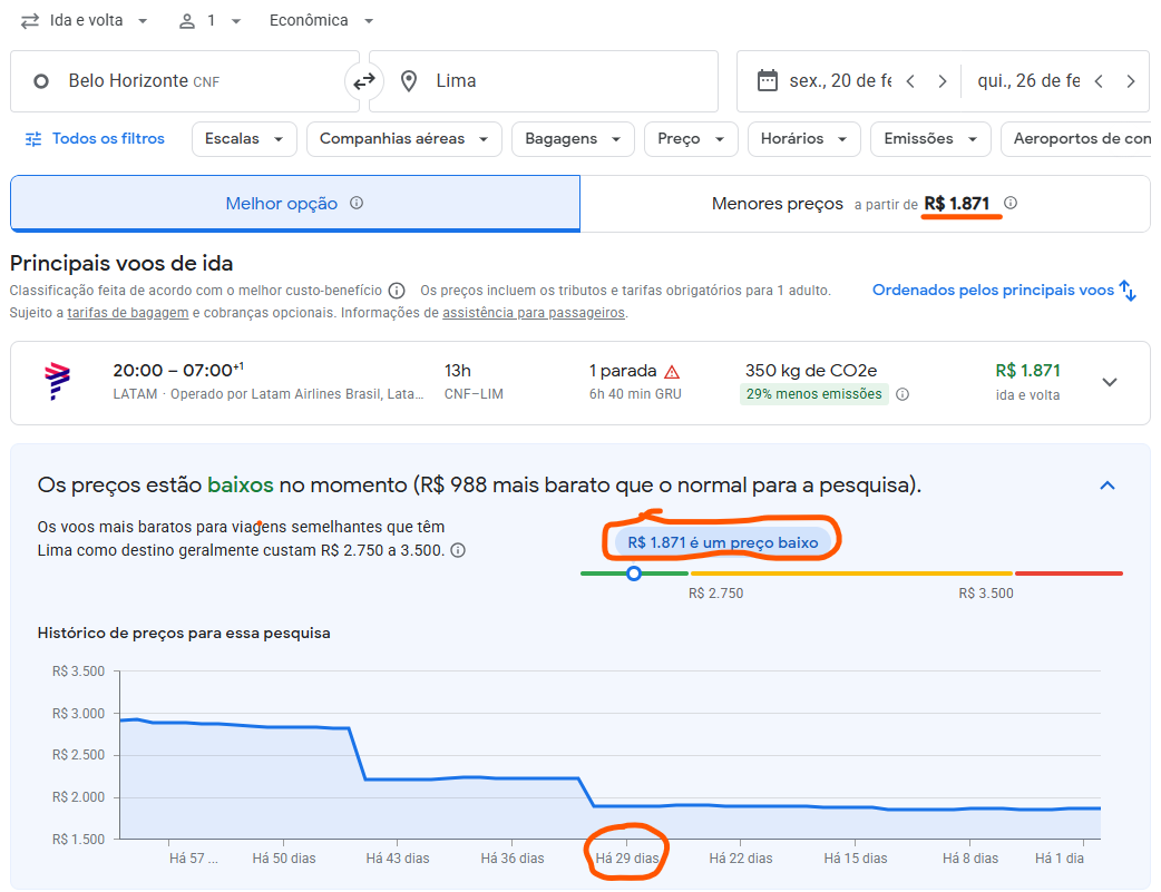 Membros Fabricio-JP Postado Setembro 29 Membros Postado Setembro 29 Partindo de Confins pra Lima, o histórico do Google Flights mostra que R$1.871 é a melhor tarifa (encontrada p/ voar no mês de Fevereiro). Veja o print abaixo p/ detalhes. Pra conseguir uma tarifa mais barata é necessário encontrar passagens da Sky Chile partindo de Guarulhos-GRU. Vi tarifa de R$1.374 entre GRU e LIM pros meses de Outubro, Novembro e Dezembro. 1 Citar