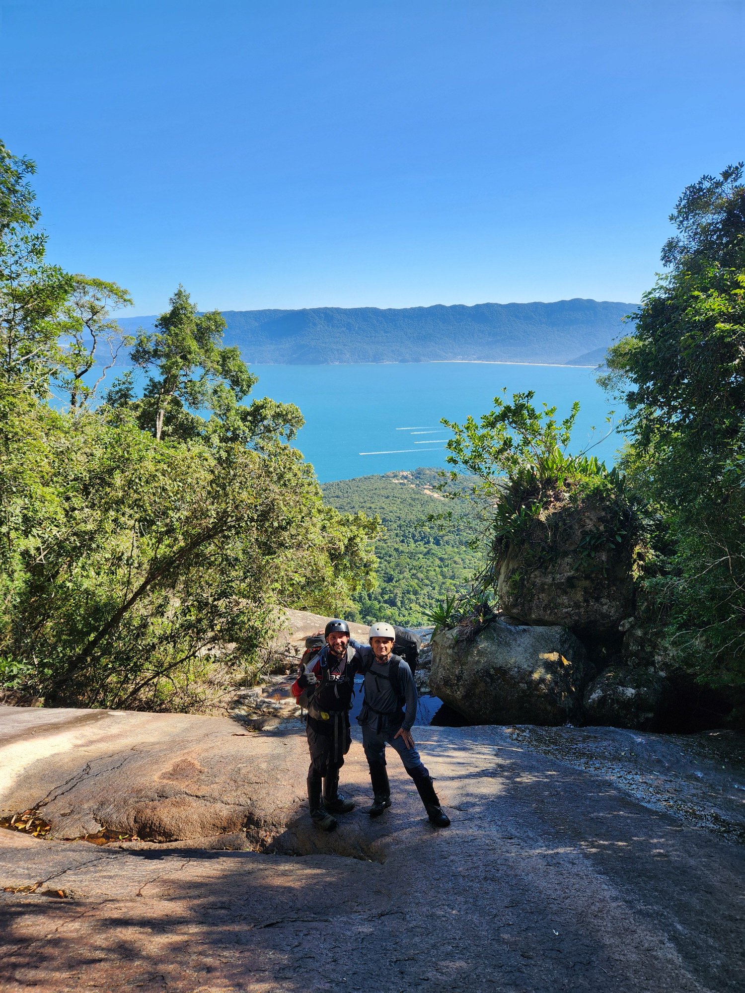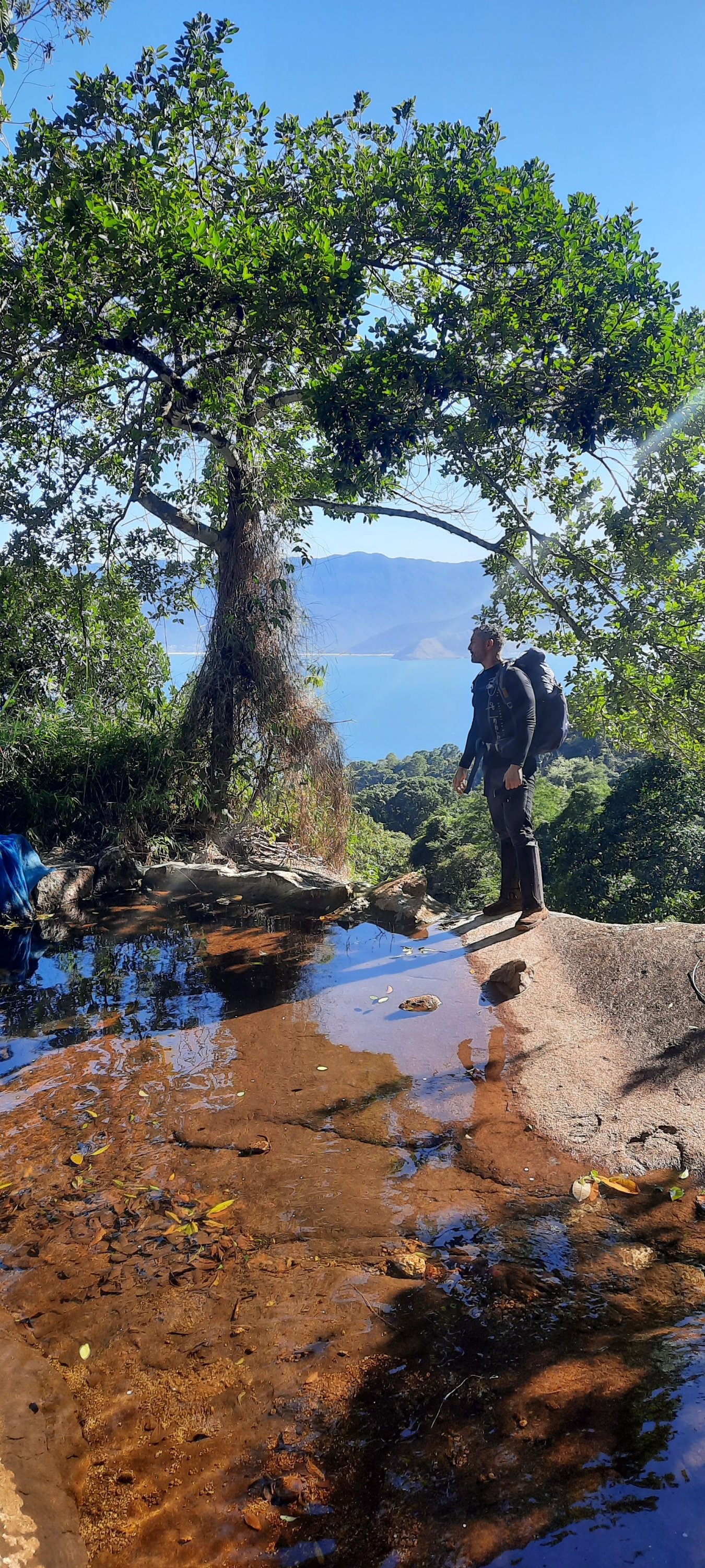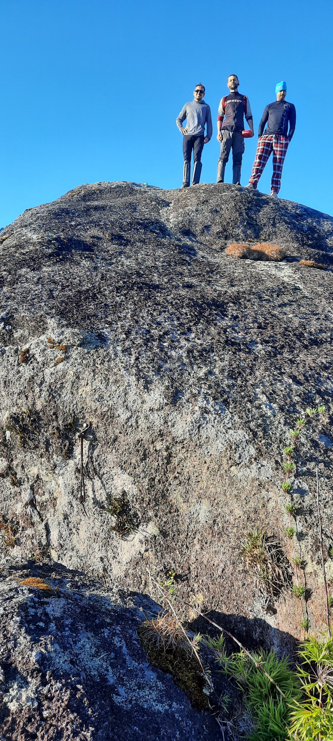 Membros de Honra DIVANEI Postado Quinta às 18:32 Membros de Honra Postado Quinta às 18:32 (editado) Mais um relato da SÉRIE 30 ANOS DE AVENTURA PEDRA DO RODAMONTE – A LENDA( 2022) Já é final de tarde quando ascendemos a crista final que nos separa de uma lenda da Ilha da Aventura. Eu e o Potenza estamos completamente tomados por um sentimento avassalador, um misto de ansiedade e medo, misturado com encantamento e deslumbramento. Thiaguinho e Morado seguem à frente, abrindo uma espécie de bambuzinho apenas com a força do ódio, já que vínhamos enfrentando uma vegetação cretina desde a parte da manhã. Quando nossa alma tocou o último degrau, o ultimo e derradeiro penhasco e a PEDRA se apresentou para gente, aí sim, fomos inundados por um oceano de emoções, porque sabíamos que havia chegado a hora, o desafio havia sido lançado em nossa direção, fomos chamados para a aventura ou a gente escalava aquele gigante rochoso ou simplesmente teríamos que enfiar o rabo entre as pernas e voltar para casa com um fracasso no bolso. A PEDRA DO RODAMONTE é daquelas montanhas que ao longo do tempo, acabou por se tornar uma LENDA entre a comunidade montanhista, bom, pelo menos entre o nicho dos montanhistas raiz, aqueles poucos que ainda restaram em matéria de montanhismo de aventura e exploração. Muito porque, a única menção a essa formação rochosa, vinha de um aventureiro do passado (AUGUSTO), que tentou chegar até ela por duas vezes, mas não obteve sucesso. Mas tudo na vida parece ter o seu tempo e sua hora, então acabou que a gente se dedicou a tocar “trocentos” outros projetos, inclusive subindo outros picos selvagens na própria Ilhabela, montanhas que receberam muito menos gente que a lua. E toda vez que eu olhava aquelas montanhas na travessia da BALSA, sempre me vinha à cabeça sobre os mistérios que poderiam se esconder no topo daquela PEDRA, que num passado muito distante, eu até pensei que ela seria o tal do Pico do Papagaio, pela semelhança com a ave bicuda. ( Rodamonte ao fundo) O tempo passou, subimos não só o Papagaio, como o Queimada do Frade, o Pico do Eixo, o distante Serraria, a Agulha do Bonete, sem contar o turístico Baepi, além de explorar uma infinidade de rios selvagens e praias e cachoeiras isoladas dos olhos humanos, mas chegou uma hora que não foi mais possível adiar e assim, o RODAMONTE entrou em definitivo no nosso radar, já era tempo de formar um grupo e botar os pés naquela montanha lendária, mesmo que a gente ainda não soubesse qual seria o nosso ponto de partida. ( Foto tirada pelo Augusto em 2001, um zoom que fez a pedra ficar menor) As discussões giraram em torno do relato do Augusto, que teria partido lá pelos lados da Cachoeira do Veloso, encontrado uma picada que o levou bem próximo da PEDRA. Mas o relato era de mais de 20 anos atrás, bem provável que essas picadas nem mais existissem, além do que, também não é muito fácil conseguir extrair todas as localizações apenas de um relato, então simplesmente resolvemos descartar essa possibilidade e fomos a procura de outra solução, tentando achar pelo menos um ponto de partida. Localizamos no aplicativo de trilhas (wikloc ) um caminho que partiria próximo ao píer do CABARAÚ e que subia a encosta por trilha até acima da cota 250 de altitude, o que já era melhor do que partir varando mato da cota zero. Bom, realmente imaginávamos que aquele caminho seria uma trilha, mas não foi bem isso que encontraríamos durante a expedição. Traçado a estratégia, lançamos o convite nos grupos de trilhas, que a cada dia ia ficando cada vez menor ou ao menos, com cada vez menos gente a fim de se enfiar nessas expedições dos quintos dos infernos, alguns botaram a culpa no trabalho, outros quando ouviram falar na possibilidade de escalada com corda, já pularam fora, enfim, o mundo do montanhismo raiz vem a cada ano se desintegrando, perdendo adeptos para outros esportes menos filhos da puta, como a escalada, por exemplo. Então, além de mim, o Thiago Silva e o Paulo Potenza, veio se juntar a nós, o paranaense mais casca grossa do Estado. Marcelo Morato se deslocou do sul do pais e veio nos fazer companhia, formando assim o quarteto fantástico, mas nem tanto. ( rsrsrsr) Antes das nove da noite, o Thiaguinho e o Morato nos apanhou na rodoviária do Tietê e mesmo antes da meia noite, já estacionamos em São Sebastião e como de costume, atravessamos para a ilha pela balsa, apenas como passageiros, já que agora em diante não necessitávamos mais do carro e optamos por usarmos o transporte público, que pouco antes da uma da manhã, nos deixou bem em frente ao PIER DO CABARAÚ. Tomando portando, o asfalto no sentido sul da ilha, não andamos nem 2 minutos e já entramos à esquerda, subindo numa rua calçada e em mais 5 minutos passamos em frente a uma casa onde o asfalto terminou e aí aceleramos o passo para nos livrarmos logo de um cão barulhento e ganhamos a escuridão da noite, já longe de qualquer habitação. Interceptamos o caminho marcado pelo gps, subindo um córrego a nossa direita, abandonando em definitivo a estradinha que a frente se tornaria uma trilha, mas que a gente não havia se dado conta disso. Estávamos caminhando agora às margens desse riacho, subindo ele, mas não era propriamente uma trilha e sim uma picada que desaparecia constantemente, fazendo com que a gente caísse no leito do riacho, pulando pedras para não molharmos as botas. Aquele traklog era cretino e parecia que não nos levaria a lugar nenhum e a madrugada foi chegando, a gente caindo de sono e nada de encontrar um lugar decente para acamparmos, mas depois de nos lascarmos todos numa florestinha de espinhos, interceptamos uma trilha vindo da esquerda, que nos levou para longe do riacho e nos jogou num bosque plano e com arvores frondosas e aí não tivemos mais dúvidas, jogamos as mochilas ao chão e demos por encerrada nossa caminhada noturna. Já eram três da manhã