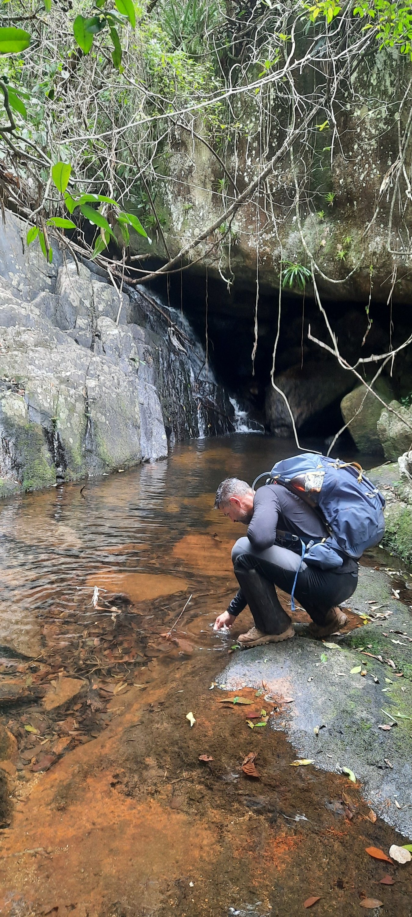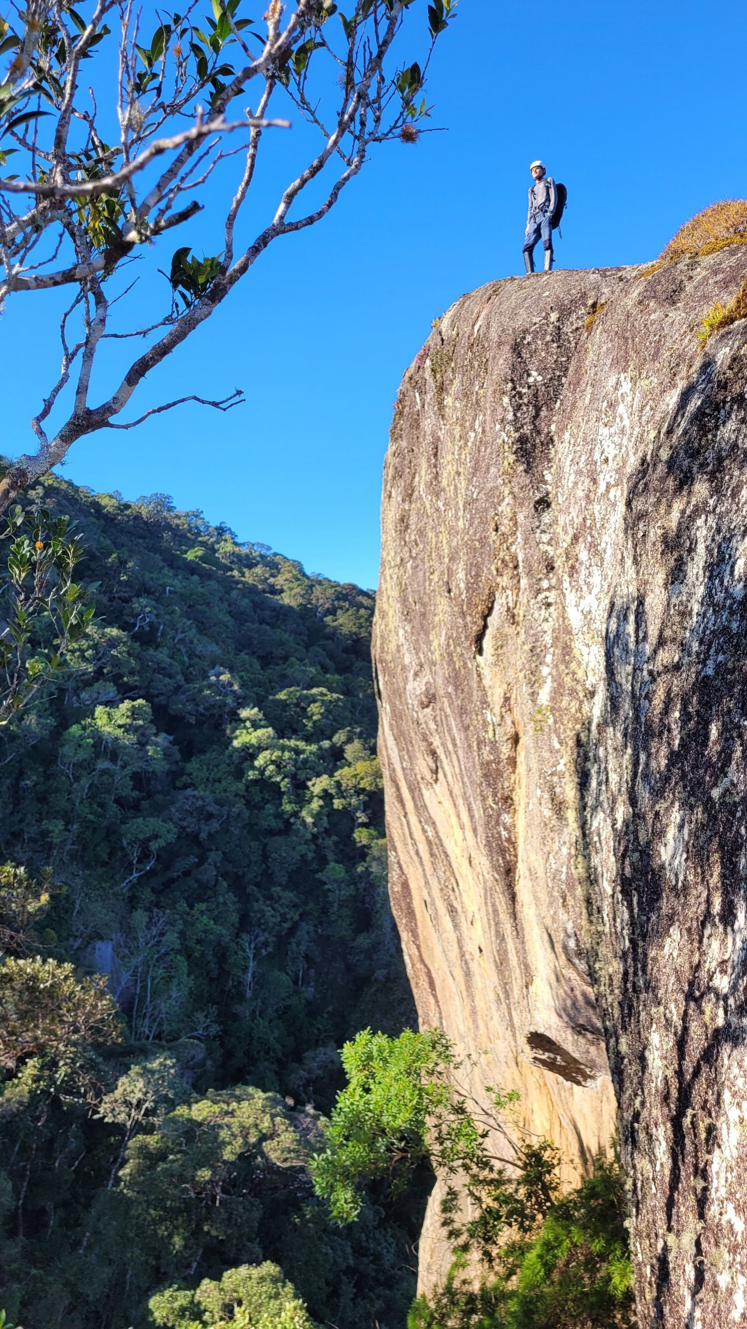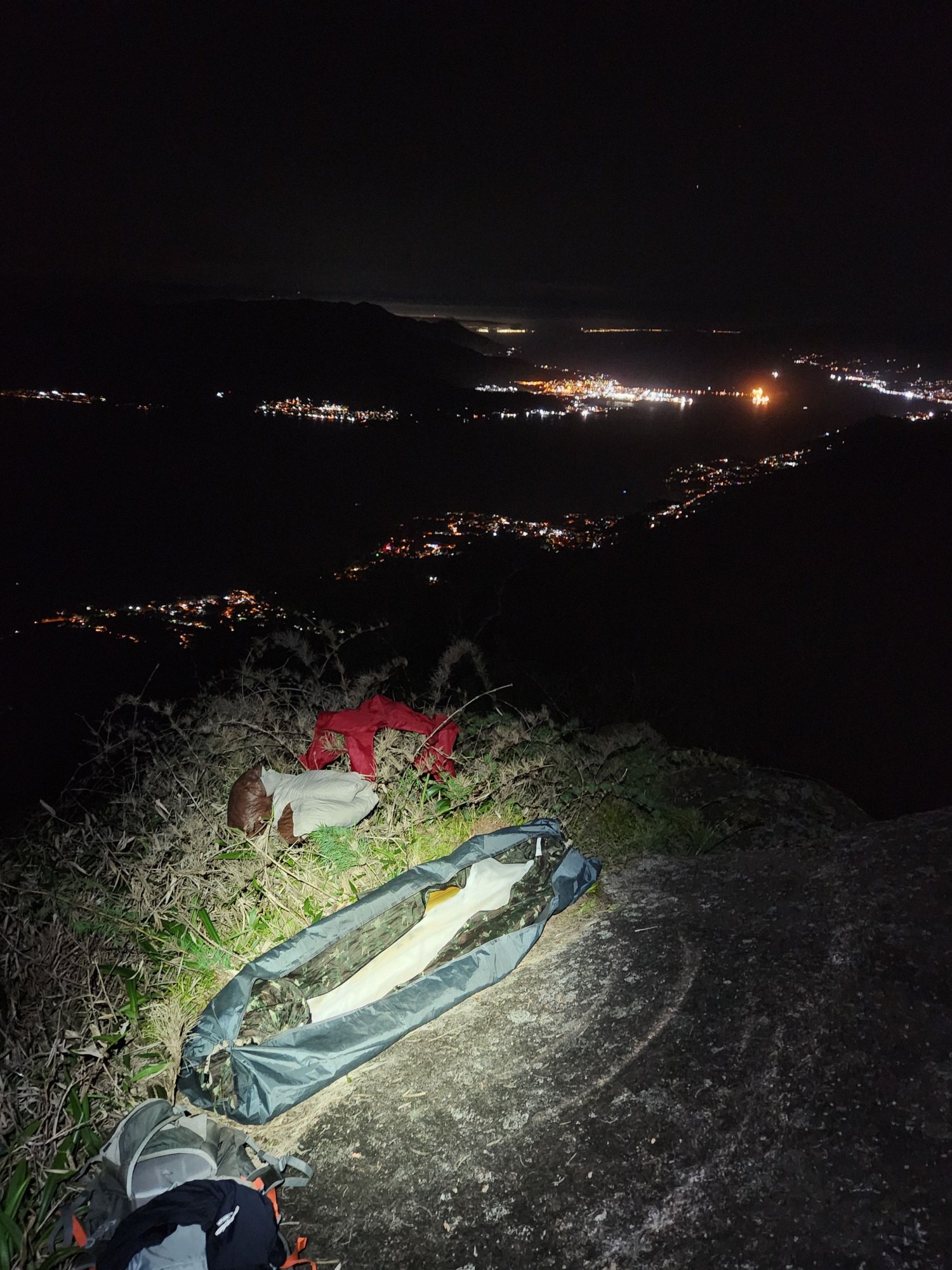Membros de Honra DIVANEI Postado Quinta às 18:32 Membros de Honra Postado Quinta às 18:32 (editado) Mais um relato da SÉRIE 30 ANOS DE AVENTURA PEDRA DO RODAMONTE – A LENDA( 2022) Já é final de tarde quando ascendemos a crista final que nos separa de uma lenda da Ilha da Aventura. Eu e o Potenza estamos completamente tomados por um sentimento avassalador, um misto de ansiedade e medo, misturado com encantamento e deslumbramento. Thiaguinho e Morado seguem à frente, abrindo uma espécie de bambuzinho apenas com a força do ódio, já que vínhamos enfrentando uma vegetação cretina desde a parte da manhã. Quando nossa alma tocou o último degrau, o ultimo e derradeiro penhasco e a PEDRA se apresentou para gente, aí sim, fomos inundados por um oceano de emoções, porque sabíamos que havia chegado a hora, o desafio havia sido lançado em nossa direção, fomos chamados para a aventura ou a gente escalava aquele gigante rochoso ou simplesmente teríamos que enfiar o rabo entre as pernas e voltar para casa com um fracasso no bolso. A PEDRA DO RODAMONTE é daquelas montanhas que ao longo do tempo, acabou por se tornar uma LENDA entre a comunidade montanhista, bom, pelo menos entre o nicho dos montanhistas raiz, aqueles poucos que ainda restaram em matéria de montanhismo de aventura e exploração. Muito porque, a única menção a essa formação rochosa, vinha de um aventureiro do passado (AUGUSTO), que tentou chegar até ela por duas vezes, mas não obteve sucesso. Mas tudo na vida parece ter o seu tempo e sua hora, então acabou que a gente se dedicou a tocar “trocentos” outros projetos, inclusive subindo outros picos selvagens na própria Ilhabela, montanhas que receberam muito menos gente que a lua. E toda vez que eu olhava aquelas montanhas na travessia da BALSA, sempre me vinha à cabeça sobre os mistérios que poderiam se esconder no topo daquela PEDRA, que num passado muito distante, eu até pensei que ela seria o tal do Pico do Papagaio, pela semelhança com a ave bicuda. ( Rodamonte ao fundo) O tempo passou, subimos não só o Papagaio, como o Queimada do Frade, o Pico do Eixo, o distante Serraria, a Agulha do Bonete, sem contar o turístico Baepi, além de explorar uma infinidade de rios selvagens e praias e cachoeiras isoladas dos olhos humanos, mas chegou uma hora que não foi mais possível adiar e assim, o RODAMONTE entrou em definitivo no nosso radar, já era tempo de formar um grupo e botar os pés naquela montanha lendária, mesmo que a gente ainda não soubesse qual seria o nosso ponto de partida. ( Foto tirada pelo Augusto em 2001, um zoom que fez a pedra ficar menor) As discussões giraram em torno do relato do Augusto, que teria partido lá pelos lados da Cachoeira do Veloso, encontrado uma picada que o levou bem próximo da PEDRA. Mas o relato era de mais de 20 anos atrás, bem provável que essas picadas nem mais existissem, além do que, também não é muito fácil conseguir extrair todas as localizações apenas de um relato, então simplesmente resolvemos descartar essa possibilidade e fomos a procura de outra solução, tentando achar pelo menos um ponto de partida. Localizamos no aplicativo de trilhas (wikloc ) um caminho que partiria próximo ao píer do CABARAÚ e que subia a encosta por trilha até acima da cota 250 de altitude, o que já era melhor do que partir varando mato da cota zero. Bom, realmente imaginávamos que aquele caminho seria uma trilha, mas não foi bem isso que encontraríamos durante a expedição. Traçado a estratégia, lançamos o convite nos grupos de trilhas, que a cada dia ia ficando cada vez menor ou ao menos, com cada vez menos gente a fim de se enfiar nessas expedições dos quintos dos infernos, alguns botaram a culpa no trabalho, outros quando ouviram falar na possibilidade de escalada com corda, já pularam fora, enfim, o mundo do montanhismo raiz vem a cada ano se desintegrando, perdendo adeptos para outros esportes menos filhos da puta, como a escalada, por exemplo. Então, além de mim, o Thiago Silva e o Paulo Potenza, veio se juntar a nós, o paranaense mais casca grossa do Estado. Marcelo Morato se deslocou do sul do pais e veio nos fazer companhia, formando assim o quarteto fantástico, mas nem tanto. ( rsrsrsr) Antes das nove da noite, o Thiaguinho e o Morato nos apanhou na rodoviária do Tietê e mesmo antes da meia noite, já estacionamos em São Sebastião e como de costume, atravessamos para a ilha pela balsa, apenas como passageiros, já que agora em diante não necessitávamos mais do carro e optamos por usarmos o transporte público, que pouco antes da uma da manhã, nos deixou bem em frente ao PIER DO CABARAÚ. Tomando portando, o asfalto no sentido sul da ilha, não andamos nem 2 minutos e já entramos à esquerda, subindo numa rua calçada e em mais 5 minutos passamos em frente a uma casa onde o asfalto terminou e aí aceleramos o passo para nos livrarmos logo de um cão barulhento e ganhamos a escuridão da noite, já longe de qualquer habitação. Interceptamos o caminho marcado pelo gps, subindo um córrego a nossa direita, abandonando em definitivo a estradinha que a frente se tornaria uma trilha, mas que a gente não havia se dado conta disso. Estávamos caminhando agora às margens desse riacho, subindo ele, mas não era propriamente uma trilha e sim uma picada que desaparecia constantemente, fazendo com que a gente caísse no leito do riacho, pulando pedras para não molharmos as botas. Aquele traklog era cretino e parecia que não nos levaria a lugar nenhum e a madrugada foi chegando, a gente caindo de sono e nada de encontrar um lugar decente para acamparmos, mas depois de nos lascarmos todos numa florestinha de espinhos, interceptamos uma trilha vindo da esquerda, que nos levou para longe do riacho e nos jogou num bosque plano e com arvores frondosas e aí não tivemos mais dúvidas, jogamos as mochilas ao chão e demos por encerrada nossa caminhada noturna. Já eram três da manhã