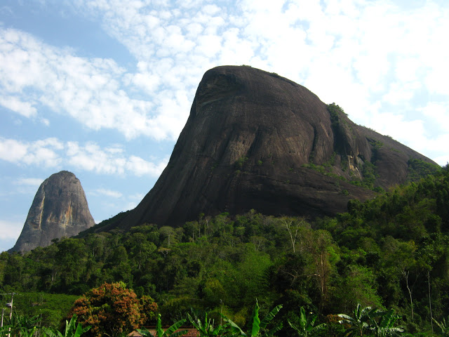A programação para esse último dia em Pancas era tentar subir a Pedra da Gaveta e, sobrando tempo, conhecer a Cachoeira Bassani. Peguei o ônibus das 9h novamente (R$1,70) e desci 5km depois junto à placa "Pedra da Gaveta - Pedra da Agulha". Entrei na rua à direita e caminhei na direção da casa do seu Geraldino Romais, aliás ali eu estava entrando no território dos Romais, descendentes de imigrantes pomeranos, como muitas outras famílias de Pancas. Deixei para conhecê-los ao final da caminhada e segui às 9h30 direto por uma estradinha bem sombreada e repleta de plantações, como de cacau, que começou a contornar a Pedra da Gaveta, em destaque à minha direita. Depois de algum tempo, a Pedra da Agulha surgiu à minha frente e, quando me aproximei, de formato de torre ela mudou para uma espécie de barbatana de tubarão. Mais uma vez estava caminhando entre pés de café e tinha então a Agulha à esquerda e a misteriosa Pedra da Gaveta à direita. Misteriosa porque em todo o contorno que fiz não vi nenhum ponto onde pudesse subi-la sem equipamento de escalada. Tentei encontrar alguma trilha na mata na parte mais alta do cafezal e até tive ajuda de um rapaz que trabalhava ali, mas nada. Ele me mostrou o lugar onde passava até uma estrada ali mas a mata tomou conta de tudo. Na impossibilidade de subir a pedra, resolvi voltar e ir conhecer o seu Geraldino. Ele e sua esposa são um casal extremamente simpático, conversamos na varanda de sua casa de madeira tipicamente pomerana com vista privilegiada da Pedra do Camelo, depois ele me mostrou as fotos de sua família e tomamos um suco de graviola do seu quintal. Ainda tocou oito baixos para eu ouvir. Sensacional! Tentei pegar o ônibus das 14h20 para voltar a Pancas mas o perdi. O jeito foi voltar a pé pela rodovia sem acostamento, mas aproveitei para mais fotos da Gaveta, Agulha e Camelo, as pedras mais famosas da cidade.