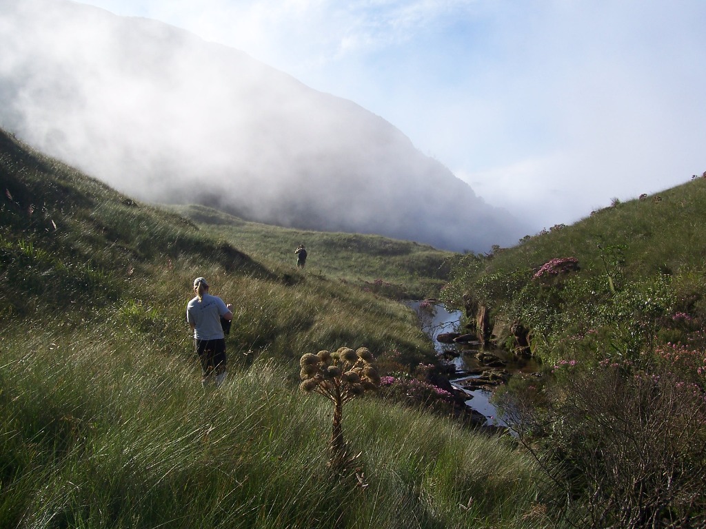 Assim sendo, eu, Serginho, Zeca e Papael, que já havíamos desmontado as barracas e montado as mochilas partimos para o dito vale a sudeste, contornando a Pedra da Tartaruga pelo seu lado sul, perto de onde largamos as cargueiras, levando apenas as máquinas fotográficas e alguma água para a caminhada. Já se passava das 8h30min.
