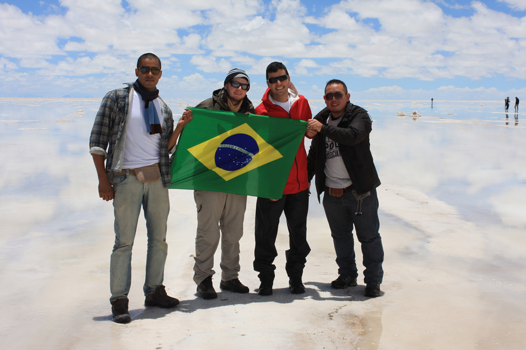 Colaboradores riquao Postado Outubro 8, 2013 Colaboradores Postado Outubro 8, 2013 (editado) [t3]O INÍCIO[/t3] Segue um resumo da nossa viagem de janeiro de 2012, que foi o meu 2º mochilão, 1ª vez que entrei em um avião e a 1ª vez que saí do Brasil. Embarquei nessa junto com 3 camaradas, um alemão, um negão e um japonês, respectivamente Diego, Alessandro e Marcio, nos dizíamos os caras da piada. Acho importante dizer também que não tínhamos planejamento quase nenhum, somente uma ideia das cidades que iríamos passar e de alguns lugares para conhecer, o resto seria decidido tudo na hora, inclusive, compramos só a passagem de ida, afinal, não fazíamos a menor ideia de quando voltaríamos (só sabíamos que dia 23 teríamos que estar em SP) e nem de onde voltaríamos. E assim, fomos e voltamos, com o universo conspirando a nosso favor... Foto: Os 4 toiços (já com as mochilas despachadas). Nossa viagem seguiu a seguinte ordem: Sucre, Potosí, Uyuni (Salar e Parque Nacional Eduardo Avaroa com passagem pelos desertos, lagoas, gêiseres, etc), La Paz, Copacabana, Isla Del Sol, Copacabana, Cuzco, Águas Calientes, Machu Picchu, Águas Calientes, Cuzco. [t3]SÃO PAULO - SANTA CRUZ DE LA SIERRA - SUCRE[/t3] 01/01/2012 - Por volta das 10h da noite partiu o nosso voo saindo de Guarulhos/SP para Santa Cruz de La Sierra na Bolívia, ainda fizemos escala em Campo Grande (MS). 02/01/2012 Resumo: Chegada a Santa Cruz de la Sierra, partida imediata para Sucre. Foto: Dormimos no aeroporto. Chegamos de madrugada em Santa Cruz, e pernoitamos no aeroporto, esperamos amanhecer e embarcamos direto para SUCRE, onde chegamos perto da hora do almoço. Os primeiros hostels que tentamos estavam cheios e o primeiro onde conseguimos vaga foi no hostel AMIGO. Na hora de fechar rolou um pequeno desentendimento quanto ao quarto com baño ou não, pois queríamos um quarto para dormir e um lugar onde pudéssemos tomar banho, que não precisava ser dentro do quarto (baño privado), e o desentendimento foi causado porque nos passaram os dois preços o do quarto (com baño compartido, como chamam lá) e quarto con baño (nesse caso banheiro privativo), e um primeiro momento entendemos que teríamos que pagar o dobro para poder tomar banho, o que não era verdade. Depois de nos entendermos, assumimos o quarto, um cômodo com duas beliches e muitos cobertores, perfeito para nós. A tarde fizemos um rolê pela cidade, não havia quase nada aberto pois como dia 1º, feriado, caiu no domingo, eles empurram o feriado para segunda-feira, e portanto era feriado. Pudemos observar um pouco da cidade, conhecer ruas e praças que estavam muito pouco movimentadas e quase não havia comércio aberto. A noite fomos dormir cedo, visto que o resto da última noite havíamos passado no aeroporto. Foto: As ruas pouco movimentadas no centro de Sucre, a direita o Japa sacando uns foto. 03/01/2012 Resumo: A cidade de Sucre com direito a downhill de bicicleta nas montanhas e trilha até El Cânion de Rufo. Acordamos e fomos para o centro de SUCRE, estávamos decididos a fazer um dos passeios que as agências da cidade oferecem, acabamos fechando um downhill de bicicleta. Saímos da agência no centro da cidade de carro, com um guia e um motorista. O carro saí do centro da cidade, e conforme vai se afastando vai subindo morro, é interessante porque pudemos ver como é o que seria a periferia da cidade de Sucre, é como se fosse roça, não há favelas, pelo menos nós não vimos, apesar de que em vários lugares tivemos impressão de favela porque as casas não são acabadas. Quando chegamos ao alto de uma montanha eles param o carro, todos descem, descem as bicicletas do carro e começamos o downhill, com um guia que desce junto conosco de bike, o Ricardo e outro que vai atrás dirigindo o carro, o Willian. Foto: Crianças brincando a beira da estrada por onde passamos para chegar até o ponto de onde começaríamos o downhill. A descida foi tranquila e a vista que se tinha era maravilhosa de uma serra como se fosse um mar de morros. No final da descida atravessamos um pequeno rio e chegamos a um campo de futebol, só digo que era um campo porque havia duas traves em uma área plana mas o terreno era horrível para querer jogar bola ali, muitas pedras, buracos e desníveis absurdos, eu cresci jogando bola em rua não plana de terra e pedra e posteriormente paralelepípedo, que me parecia melhor que aquele campo, depois do campo tinha um trecho de subida onde eles ofereceram para colocar as bicicletas no carro, para subir e depois nos devolveriam para percorrermos uma parte plana mais a frente, eu preferi subir pedalando, foi um pouco cansativo mas consegui sem me matar muito. Lá em cima, todos a postos e de bicicleta novamente seguimos a trilha da mesma forma que fizemos o downhill, com o Ricardo de bike e o Willian atrás de carro. Até que chegamos a um ponto onde havia ocorrido um deslizamento de terra que impedia que o carro passasse pela estrada, passamos com as bicicletas mas o Willian teve que deixar o carro e seguir a pé, pois mais a frente seria necessário que ele estivesse junto com o grupo. Foto: Parada para foto durante o downhill, o da frente é o guia Ricardo, o motorista Willian que tirou a foto. Chegamos ao final do trecho que faríamos de bicicleta e as deixamos, com Willian que ficou tomando conta enquanto entramos numa trilha que nos levaria até El Canion de Rufo com o Ricardo. Fizemos a trilha passando por alguns trechos de descida de pedras, depois parte pela beira do rio hora em areia, hora em pedras mesmo e quando chegamos ao canion, que é um vão entre duas montanhas e a água do rio vem do meio desse vão todos estavam cansados e com fome, paramos e o Ricardo nos entregou os kits de lanche que estavam inclusos no pacote do tour da agência. Comemos, descansamos, conversamos bastante e começamos a volta, ao final da parte a pé, reencontramos Willian e as bicicletas, e retomamos a pedalada de volt