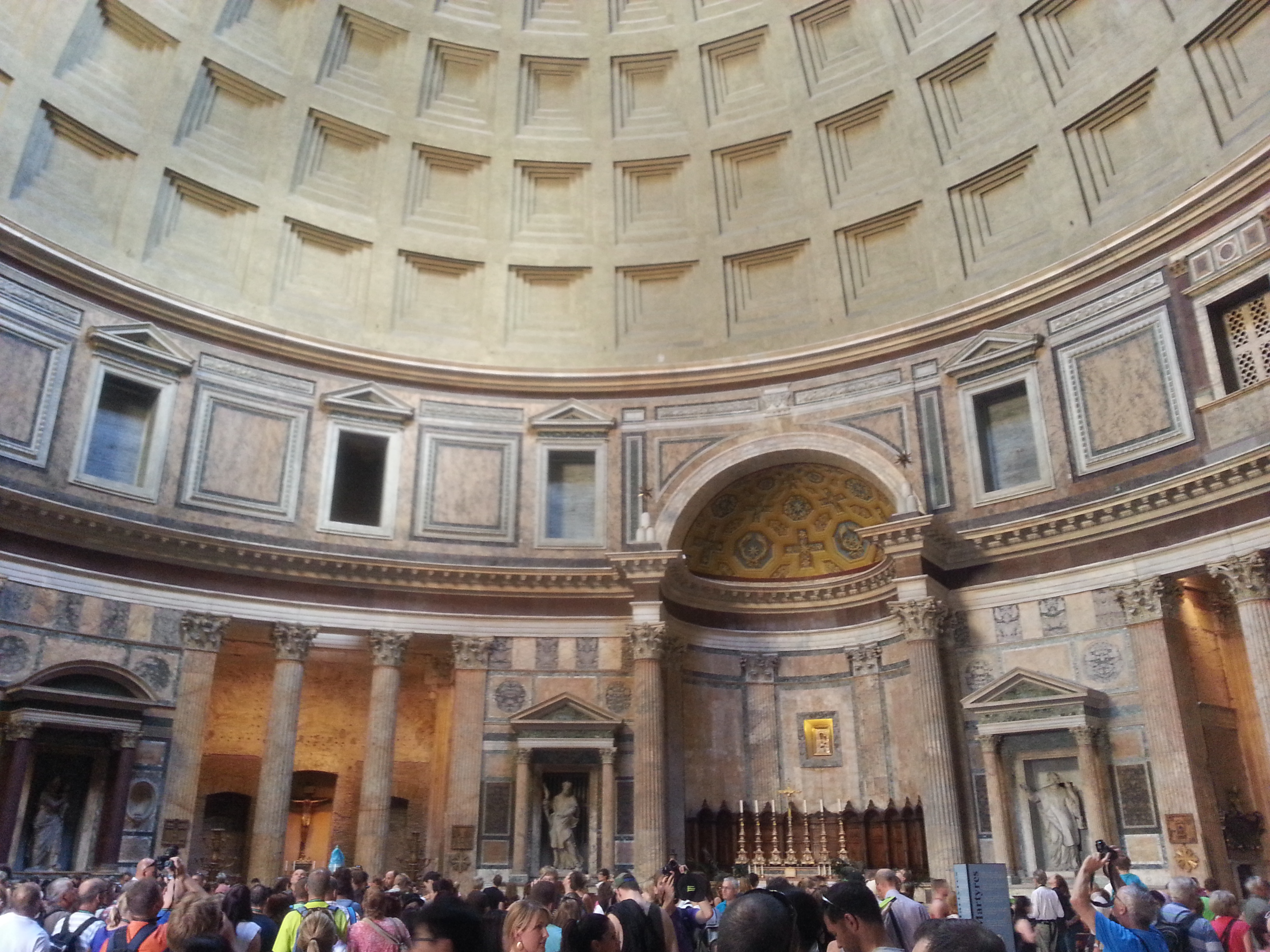Membros Thicarpel Postado Dezembro 14, 2013 Autor Membros Postado Dezembro 14, 2013 Roma 24/09/2013 Neste dia, primeiro visitei o Panteão em Roma, na mesma região em que fica a Fontana Di Trevi... É a construção da Roma Antiga mais bem conservada, e leva esse nome por ser, originalmente e por muitos séculos, o local de adoração aos vários deuses romanos. Desde o Séc. VII, é um templo cristão e, a todo momento, uma voz fica pedindo silêncio em italiano, inglês, alemão, francês, espanhol, japonês e chinês... rsrsrs... Apesar de ser um local de culto religioso, muitos turistas não respeitam o silêncio que se faz necessário... O Panteão tem um domo enorme, vazado! Não sei se é verdade, mas um espanhol me disse que, quando chove, chove dentro do panteão mesmo! rs! A entrada é gratuita (como deveria ser em toda igreja, viu.. Dona Abadia de Westminster!!!!! kkkk) Na fachada, vocês podem ver a menção ao nome de Agripa, uma homenagem ao cônsul romano Marco Vispânio Agripa. Citar