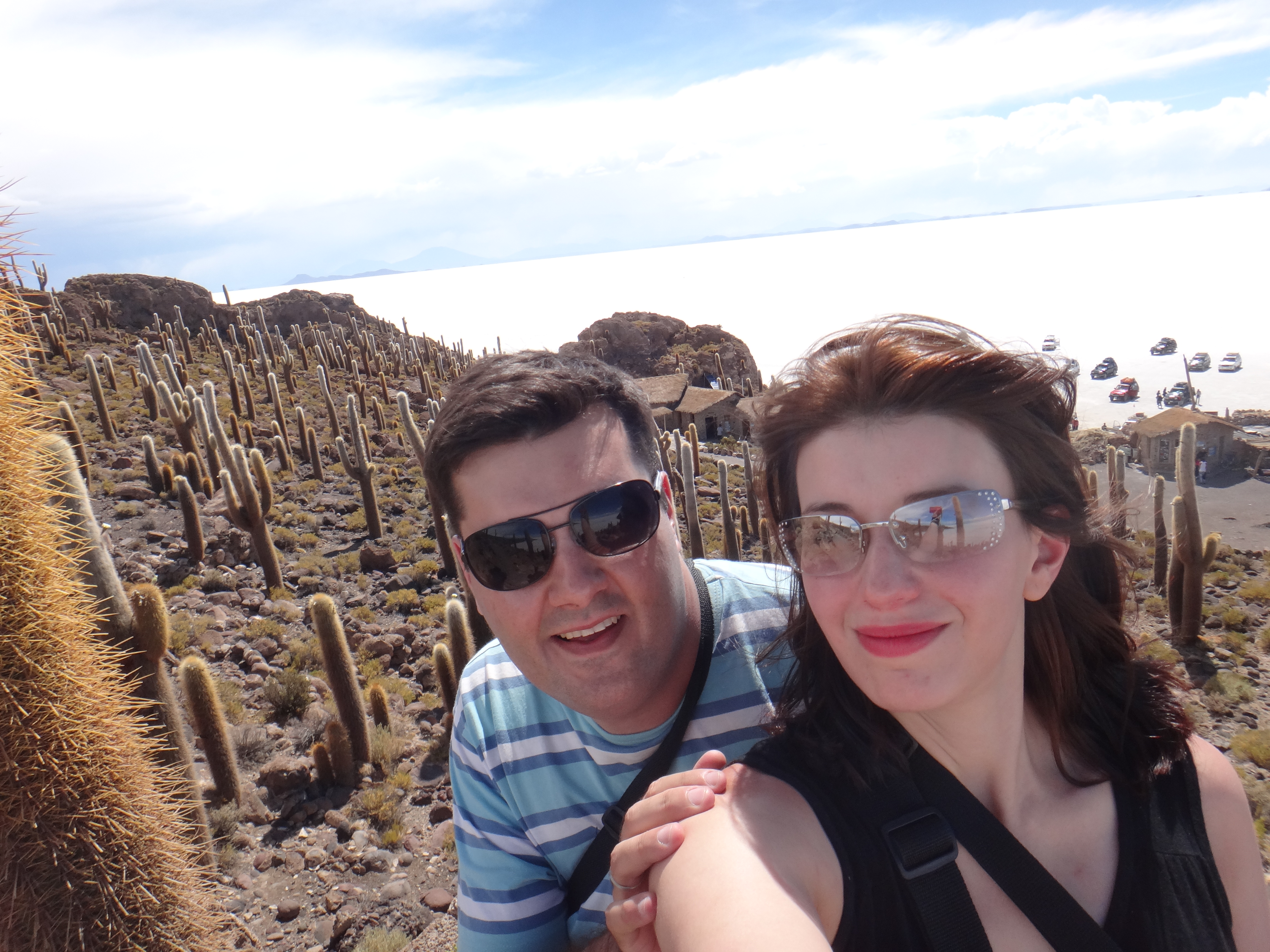 Membros deborah.wakin Postado Janeiro 13, 2014 Autor Membros Postado Janeiro 13, 2014 Dia 7 (26/12/2013) – Cidade de Uyuni - Salar de Uyuni Comemos metade do panetone que compramos no dia anterior no café da manhã. A maioria dos hostels/hotéis na cidade de Uyuni não oferecem café da manhã, mas o preço médio é de 10 bolivianos por pessoa nos restaurantes locais. Fomos até a agência, que é do outro lado da rua do hotel em que nos hospedamos e ficamos esperando o jipe que nos levaria ao Salar, torcendo para que as pessoas que nos acompanhariam durante os 3 dias fossem tranquilas. O guia chegou, colocou nossas coisas em cima do jipe e depois mais dois casais entraram no veículo. Comecei a ouvir AC/DC e fiquei toda animada achando que o guia curtia aquilo, só que eu estava empolgada demaaaaaais e as outras pessoas não. Parando no cemitério de trens, me dei conta de que não sei como meu celular estava tocando minhas mp3 do AC/DC. Fiquei super sem graça, desliguei o celular e preferi não tocar no assunto. Paramos no cemitério de trens e logo que descemos o casal de japoneses que estava no jipe veio conversar conosco. Nos apresentamos e eles nos disseram que se casariam daqui a 5 meses. Depois fomos falar com o outro casal que estava no jipe. Mais uma vez eu fui toda empolgada e dei outro fora: perguntei se eles também eram japoneses. Eu juro, eles se pareciam com japoneses !! Ainda bem que eles eram extremamente educados e me responderam que são colombianos. Depois desses dois foras, resolvi falar menos e fomos tirar fotos. Antes de descermos do jipe, o guia nos falava quanto tempo teríamos para ficar em cada local. Nosso grupo foi excelente em todos os sentidos inclusive com relação ao horário, todos colaboraram e ninguém se atrasou em nenhum momento. O guia fala somente em espanhol e tínhamos que traduzir o que ele dizia para o inglês para que os nossos amigos japoneses pudessem compreender. Nossa próxima parada foi um museu de sal no meio do deserto. Lá tinha também diversos artesanatos a venda. Compramos alguns chaveiros com o sal de Uyuni por 6 bolivianos cada um. Depois, fomos até o deserto de sal. Era época de chuva e no início tinha muita água, tudo muito lindo, daí passei a entender por que de quando chove chamarem o salar de espelho do céu. Tentamos tirar as fotos criando ilusões de ótica, mas não deu certo, até que vimos nossos amigos colombianos tirando fotos legais e eles resolveram nos ajudar. Vou explicar: o objeto deve bem ficar próximo a câmera e as pessoas beeeeeeeem longe para dar certo. Almoçamos ali mesmo, naquele ponto do salar. Nosso almoço foi quinua com legumes e queijo, para beber tinha coca cola e água e de sobremesa bananas. Tinha frango também para as pessoas que comem carne. Acredito que aí comecei a emagrecer ainda mais, por que quinua, legumes e queijo branco=estômago vazio e mesmo comendo um segundo prato em todas as refeições, parecia que cabiam mais uns dez pratos daqueles no meu estômago, daí eu tomava muita coca cola e colocava muita, mas muita maionese nos legumes. Isso ajudava a criar uma falsa sensação de saciedade. Mesmo assim, não me senti incomodada, foi apenas uma fase de adaptação, afinal de contas eu não estava ali para comer pratos sofisticados e sim para conhecer o salar. E, diga-se de passagem, todas as refeições que fizemos no salar eram saborosas. Almoço em Uyuni Após, fomos para a Ilha do Pescado ou Incahuasi (em quéchua, casa do inca). Paga-se 30 bolivianos para entrar no lugar. Cada um dos cactus que vimos por lá, crescem um centímetro por ano. Tem também um casal de llamas no local. Tentamos dar a volta na ilha, mas desistimos no meio do caminho. O sol estava muito forte e estávamos cansados. Mesmo com protetor solar meus braços estavam fritando com o sol. No caminho para o hotel de sal, avistamos várias vicunhas. Enfim, chegamos ao hotel de sal. Nosso grupo foi o primeiro a chegar e o guia nos disse que só tinham 2 quartos com cama de casal e que precisávamos escolher qual casal ficaria no quarto com camas de solteiro. Disse que eu e meu namorado ficaríamos no quarto de solteiro. Em seguida chegaram outros dois grupos com mais casais, que também tiveram que ficar em quartos com duas camas de solteiro. Nesse hotel não há suítes e existem apenas dois sanitários e uma ducha. Você tem que pagar 10 bolivianos pelo banho. Eu vi aquela fila toda se formando para tomar banho e optei por tomar banho no dia seguinte. Tomamos chá com bolachas. Mais tarde e nem aí para os meus quilos perdidos, dei a outra metade do panetone para o cachorro do hotel, e depois disso, percebi que estávamos sem comida reserva. De janta, nos serviram sopa de legumes e quando tomaram conhecimento de que eu não como carne, começaram a me servir omelete em todas as refeições. Comi omelete e salada e as outras pessoas salsicha e salada. Nesse dia fez muito frio e usamos nossos sacos de dormir. Depois das 21 horas o hotel fica sem energia elétrica, desligam o gerador e você tem que se virar para encontrar suas coisas no quarto, ir até o banheiro, etc. Usei o celular e deu tudo certo. Ah, e para carregar os eletrônicos é meio concorrido. Uma das primeiras coisas que fiz foi colocar a bateria da minha câmera e meu celular na tomada, por que já estavam descarregados. Nosso quarto no hotel de sal Citar