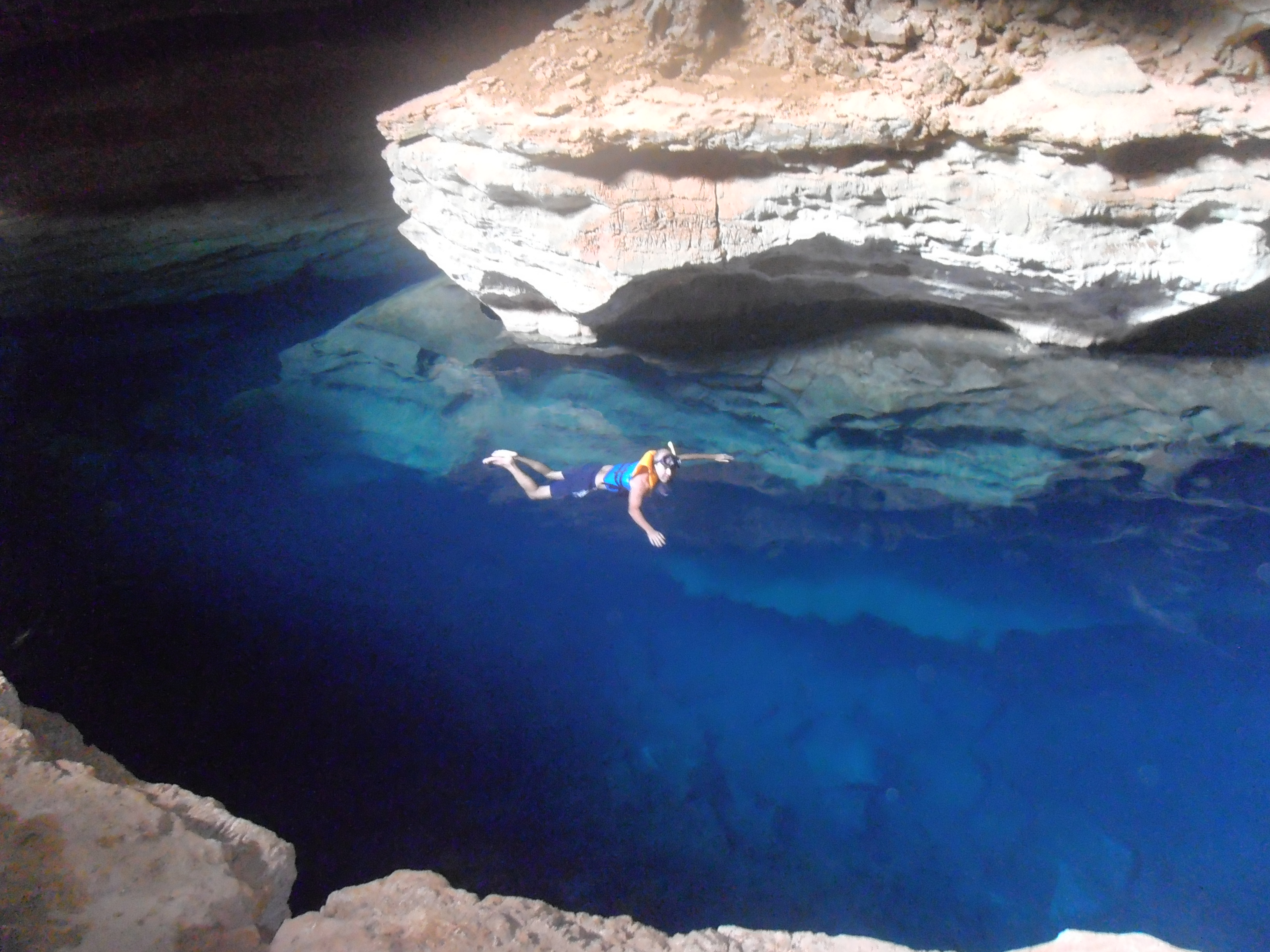 O visual da entrada da gruta já instiga a um mergulho imediato naquelas águas de sonho. Colocamos o colete, máscara, snorkel e pegamos, cada um, uma lanterna à prova d’água. O guia, que nos acompanha por todos os 170m de comprimento da caverna, se ofereceu para tirar fotos (somente possível com o flash ligado, já que a escuridão lá dentro é total). O trajeto passa por três salões enormes: uma média de 8 metros de profundidade e 10 metros de altura (da água ao teto). Por incrível que pareça, há muitos peixes, alguns com quase meio metro. Também há “pencas” de pequenos morcegos no teto. A experiência foi fantástica e saímos de lá realizados.