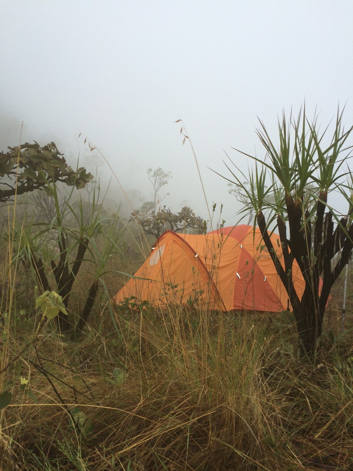 As primeiras reclamações de cansaço do Alexandre vieram durante os 8km de pernada que separam a travessia das Fiandeiras até o acampamento das Sete Quedas, onde presenciamos uma novidade; a implantação de um banheiro seco, que estava extremamente limpo e bem cuidado. Aproveitamos o final da tarde pra montarmos nossas tendas (a do Peter não era bem uma tenda), tomar um bom banho de rio e conhecer nossos colegas que já estavam acampados quando chegamos. Iniciamos uma boa conversa com o Jordano, a Cecília, o Henrique, o André e a Camilla nossos vizinhos de acampamento que tinham se conhecido pelo Trekking Brasília e estavam realizando a primeira trilha juntos, todos muito agradáveis e bons de prosa. A noite continuou com bastante conversa e trocas de receita de comida de trilha e com a escuridão pudemos confirmar que o incêndio que consumia o parque tinha aumentado bastante.