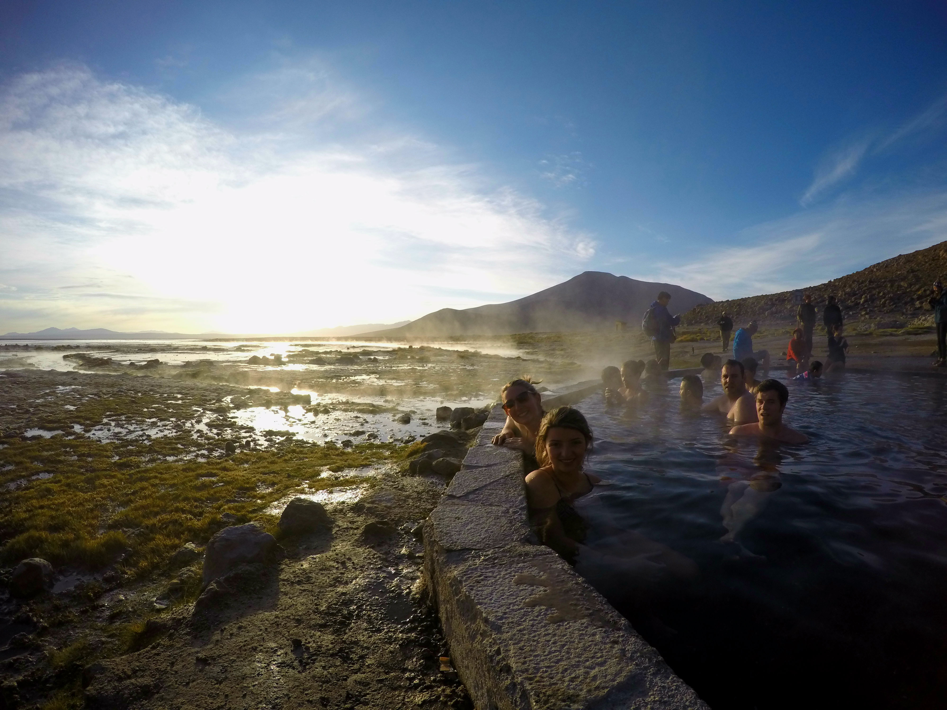 Seguimos para a segunda parada: Aguas Termales. Aqui a temperatura deu uma amenizada porque o sol estava forte, mas continuava frio ::essa:: Só eu, a minha irmã e o Connor arriscamos o banho. O momento mais difícil é quando você está se trocando e fica exposto àquela friaca, por isso eu recomendo já ir com a roupa de banho por baixo para quando chegar só tirar as roupas quentes de cima e entrar rapidinho na água haha ::otemo:: Só não esqueça de levar uma roupa de baixo para usar depois porque como eu já disse aqui, o guia não pega nada nas mochilas depois que elas estão em cima do carro e você não vai querer usar a roupa de banho molhada naquele frio, acredite em mim!