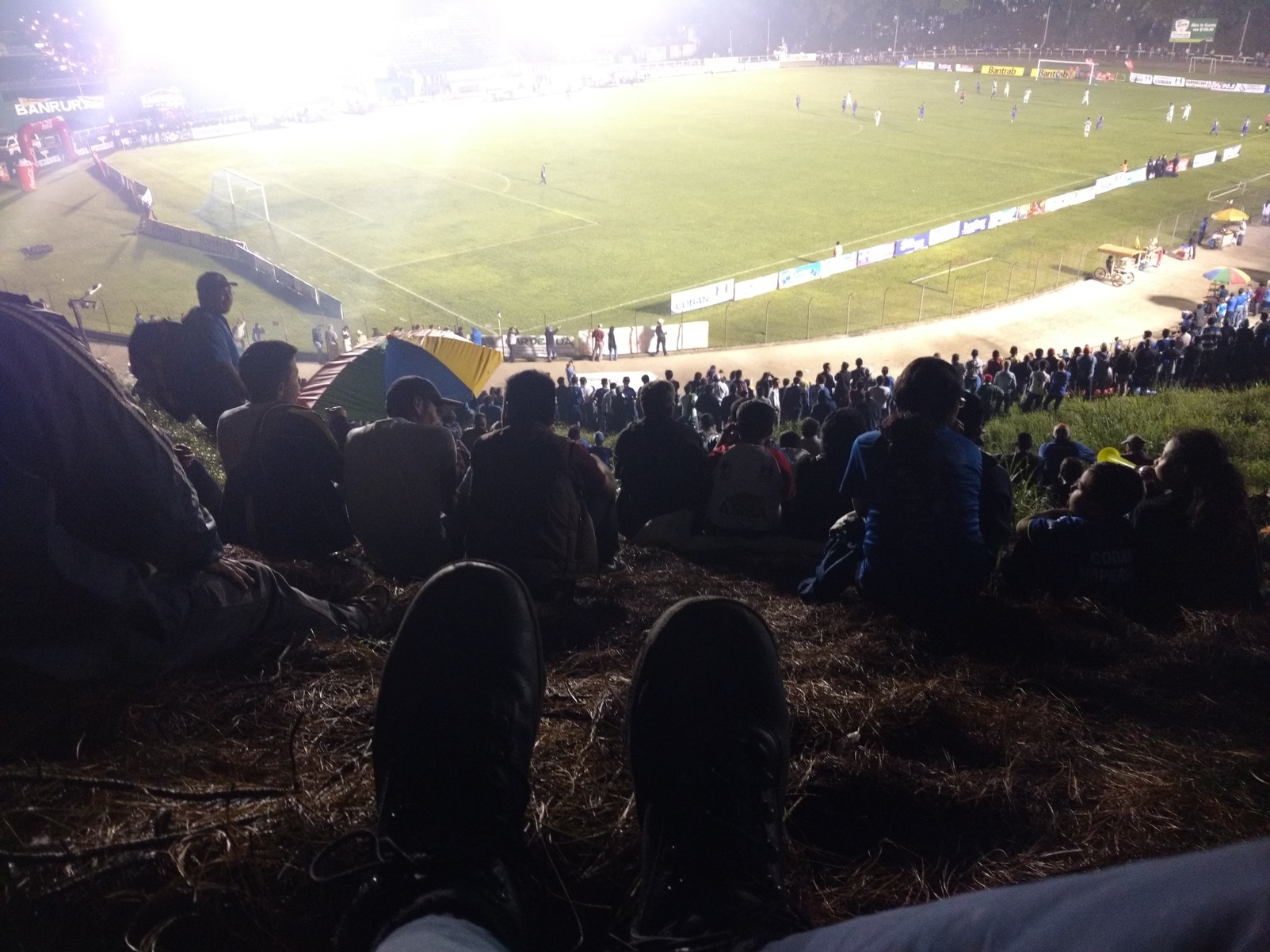 Já poderia até ir para a próxima cidade, mas o Sr. Adolfo havia me dito que o Cobán Imperial, equipe local, iria enfrentar o atual campeão guatemalteco, Antígua, as 19h no estádio de Cobán pela 1ª Divisão da Guatemala. Como sou apaixonado por esses jogos mais, digamos, alternativos fui! Segui a pé e fui logo comprando a camisa do time (45 quetzales no camelô) e pegando a disputada fila da bilheteria (ingresso geral a 40 quetzales). Dado a grandiosidade do foguetório na entrada do time vi que aquele jogo seria do Cobán Imperial, não sabia que aquele dia era o encerramento dos festejos na cidade. Já dentro do estádio vi que as poucas arquibancadas estavam cheias e o que restou? As colinas que ficam dentro do estádio, onde ao custo de 5 quetzales se adquire um pedaço de plástico para forrar o chão e sentar. Plástico comprado escolhi qual colina subir e me acomodei para torcer pro meu novo time - Avante Cobán!