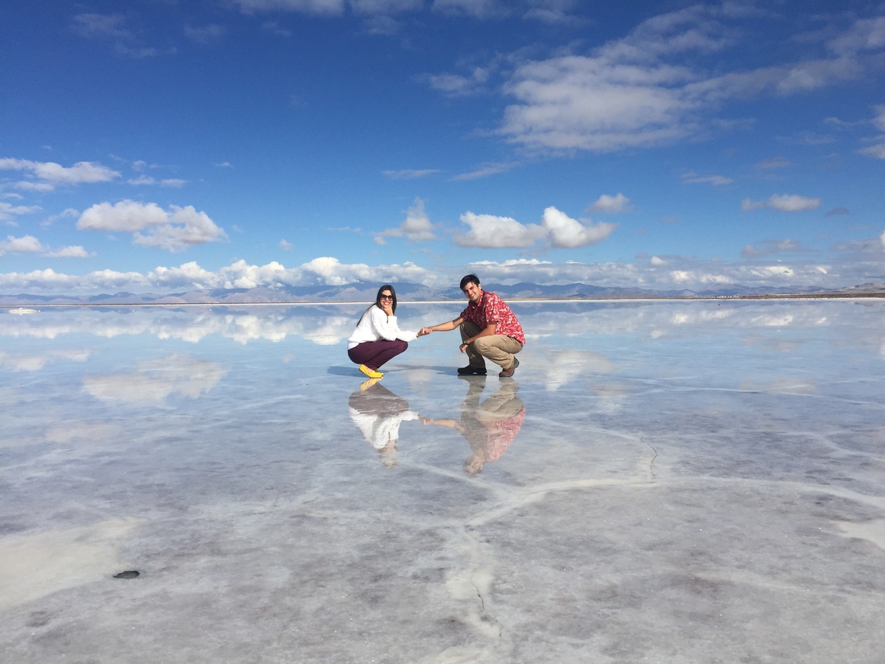 A rodovia passa por entre as Salinas Grandes. Logo no começo tem um ponto de parada a esquerda, com duas esculturas grandes feitas de sal e uma bandeira da Argentina e outra da Wiphalla hasteadas. Decidimos parar ali. Quando descemos e chegamos bem perto do salar, tivemos uma grata surpresa: o sal tinha derretido o suficiente para formar um lindo espelho da água, que refletia toda a paisagem! Como não poderia ser diferente, ficamos fascinados com aquela paisagem espetacular; um privilégio estar ali.