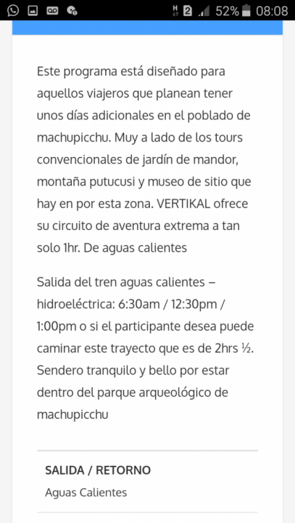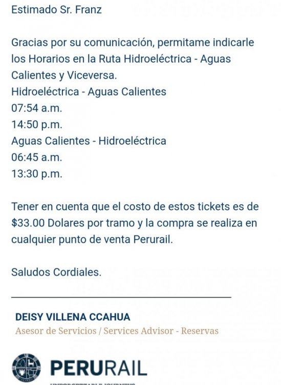 Membros muriloom Postado Maio 12, 2018 Membros Postado Maio 12, 2018 Boa noite pessoal Estou indo semana que vem pro Peru, mas estou com uma dúvida. Sobre ir de Cusco>Ollantaytambo>Santa Teresa (hidrelétrica) de van + trilha até Águas Calientes, pelo que li em relatos aqui e outros sites existem várias empresas que fazem esse trajeto. Pois bem, alguém teria o contato de alguma dessas empresas (whatsapp ou e-mail), pois preciso tirar uma dúvida, sobre os horários de retorno das vans desde Santa Teresa (hidrelétrica) para Cusco. Se alguém souber responder se as vans saem também pela manhã no retorno para Cusco, pois só encontrei relatos delas saindo na parte da tarde. 1 Citar