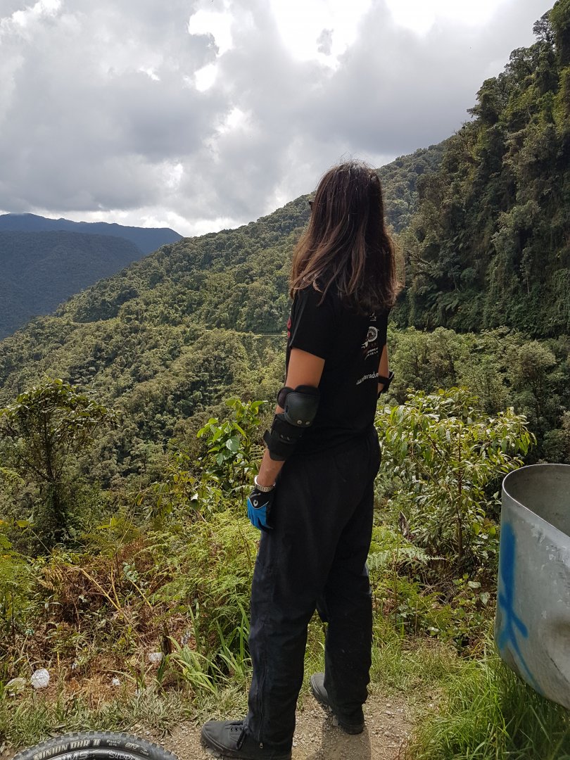 A estrada vai beirando os precipícios, as paisagens são incríveis, vamos descendo, até que numa parte paramos para tirar a foto clássica, o grupo devia ter umas 12 pessoas. Depois seguimos mais um monte, até que minha bicicleta estourou o pneu, o guia trocou ela por outra reserva que estava na van que segue a gente o caminho todo. Nesse meio tempo, enquanto eu esperava a troca, estava perto de uma curva fechada, aí só escutei o barulho de gente escorregando, um carinha levantou, e xingou em português, era brasileiro, estava descendo com outra agência, aí deve ter batido o pedal em alguma pedra, tombou e veio escorregando, felizmente não foi na direção do abismo, fomos ajudá-lo, mas não tinha se machucado por causa dos equipamentos, logo vieram mais dois do grupo dele e escorregaram também, do mesmo jeito, os três tinham feito a curva com o pedal na posição errada, meu guia tinha explicado isso para o meu grupo, o deles pelo jeito não, mas felizmente ninguém se machucou nessa brincadeira.