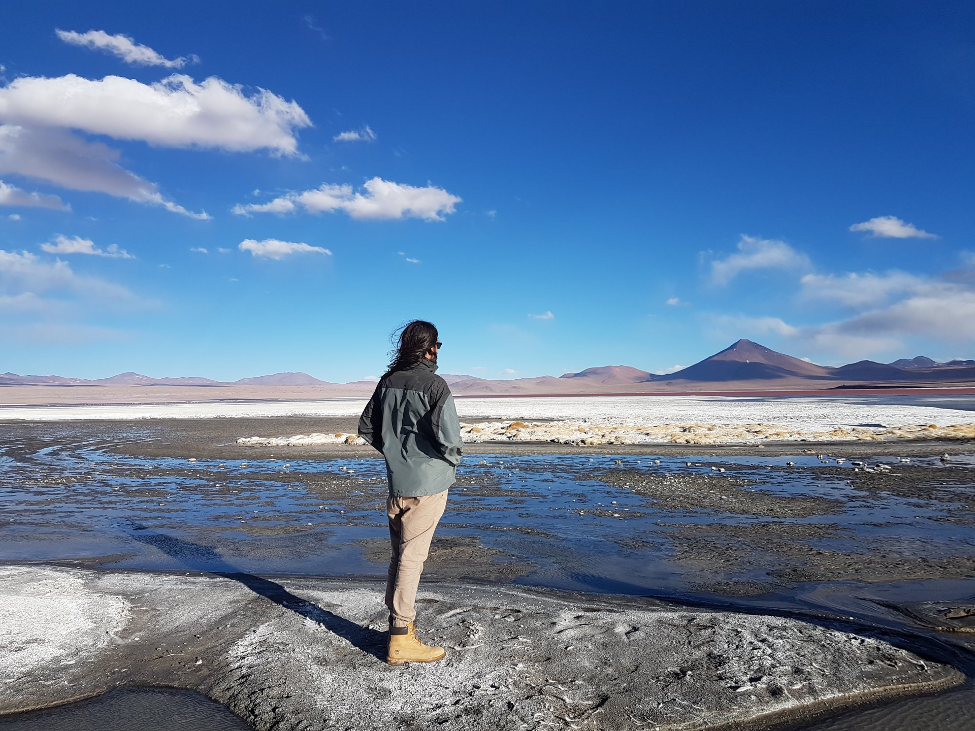 Depois, por volta das 11 horas da manhã, paramos para observar o Vulcão Ollague, e mais um perrengue acontece com nosso grupo: estava um fucking vento forte lá fora e o motorista parou o carro a favor do vento, quando ele disse que a gente podia descer para tirar fotos, o Óz que estava no banco da frente abriu a porta, ela foi igual uma vela de barco, o vento quase arrancou ela do carro, não chegou a arrancar porque as dobradiças eram boas, mas amassou elas a ponto da porta não fechar mais. O Juan, na maior calma do mundo, foi ver o estrago, pegou uma marretinha, um pedaço de metal e junto com o mexicano tentaram arrumar, deram umas marretadas lá, mas ficamos uns 40 minutos esperando pra ver o que ia ser, não teve jeito, eles conseguiram só fazer com que a porta fechasse, mas não daria mais para abrir ela, então toda parada que a gente ia fazer, o Óz tinha que pular os bancos e sair pela porta de trás ou pela do motorista. Depois disso fomos para as Lagunas Cañapa, Honda e Hedionda, lá pudemos ver os flamingos, também lá nós tivemos nosso almoço, simples, mas muito bom, isso já eram quase 3 da tarde.