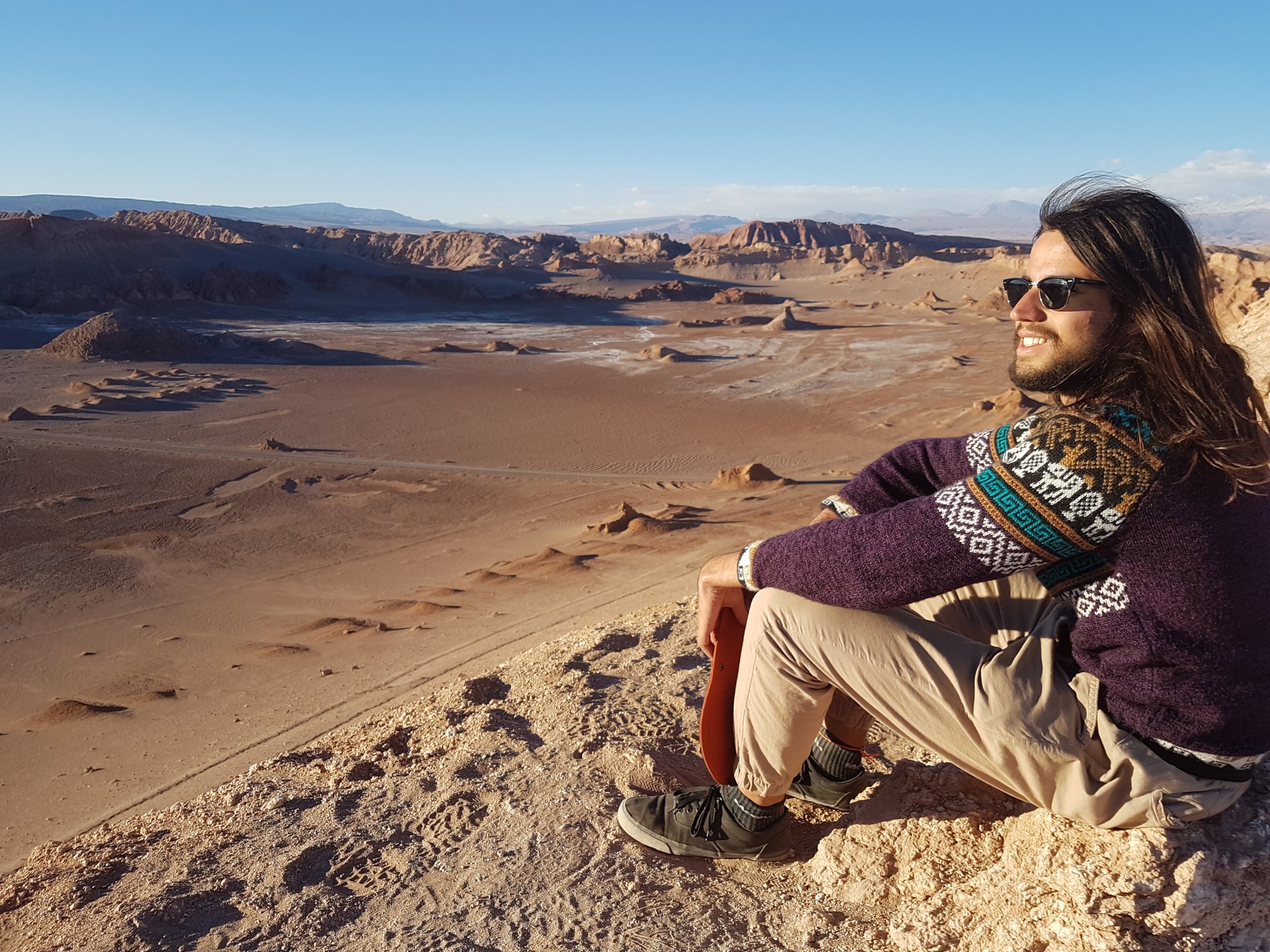 O guia nos levou na parte de cima primeiro, onde dava para ver tudo do mirante, depois descemos e fomos explorar algumas cavernas da Cordilheira do Sal e trilhas no meio das pedras, por fim, fomos caminhando para ver o Sol se pôr do alto de uma duna de areia. Incrível a vista, depois que escureceu, voltamos para a cidade.
