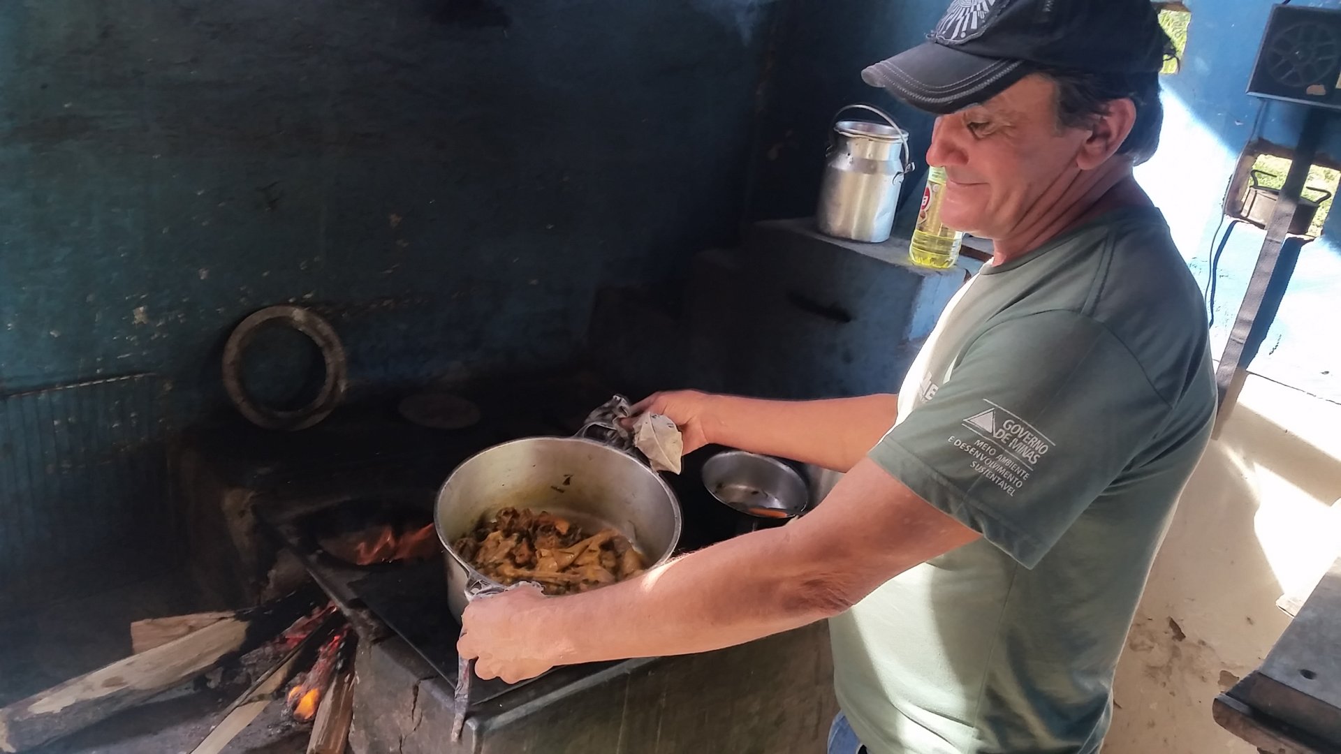 Esse é o Lucas fazendo o nosso rango delicioso, tá segurando a panela de frango. NÃO É TODO DIA QUE COMEMOS UMA COMIDA DESSA!  Ele teve muita paciência comigo,  pois perguntei tudo para ele,  o dia inteiro.