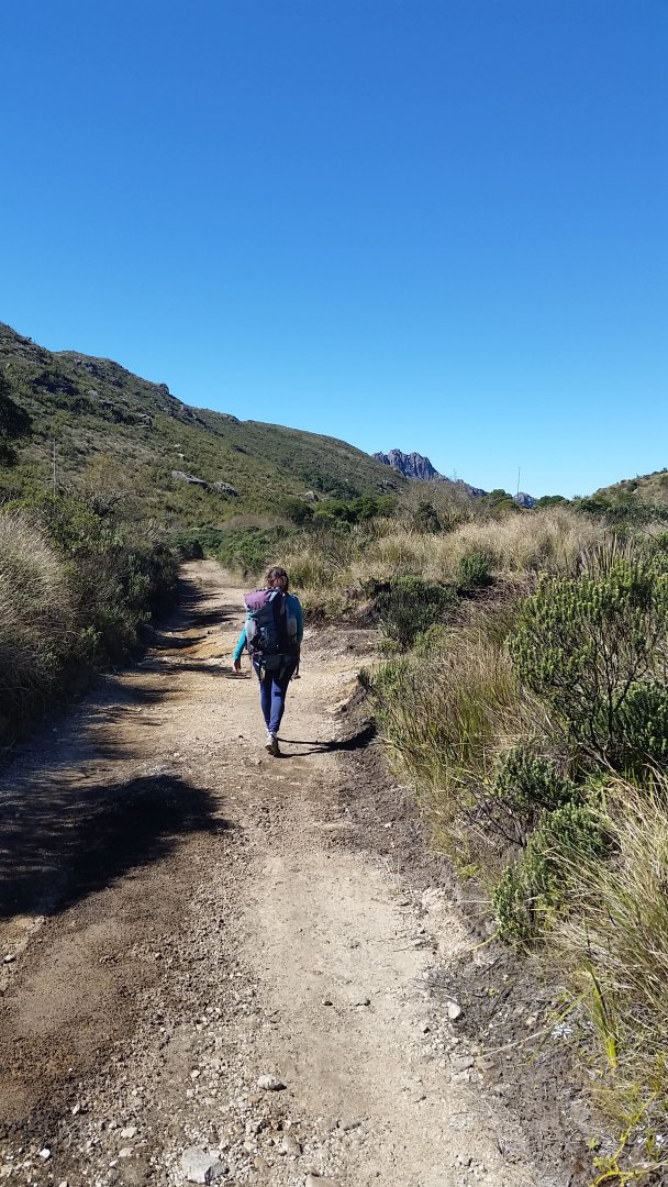 Depois da bifurcação vira na primeira trilha à direita,  chegamos na estrada da terra, do outro lado   entramos noutra trilha seguindo placa "tabuleiro"(erramos o caminho 2 dias antes), subida bem forte até estrada de terra. (1430msnm - 00:33hrs) viramos à esquerda, e continuamos subida leve até o topo com lindo visual de montanha, atravessamos porteira e já viramos à direita numa trilha(tem placa indicativa), continuamos subida leve, até container dos guardas, topo do caminho  (140 msnm - 00:45hrs).
