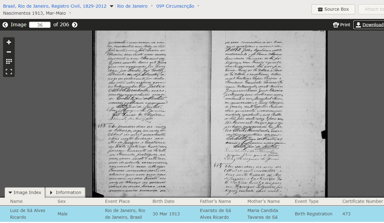 Colaboradores renata83 Postado Março 31, 2022 Colaboradores Postado Março 31, 2022 (editado) Em 30/03/2022 em 12:52, Gigizinha78 disse: Nome do meu avô: Luiz de Sá Alves (ou Luiz de Sá Alves Ricardo) Nascido em 30 de março de 1913 na cidade do Rio de janeiro Filho de: Evaristo de Sá Alves e Maria cândida de Sá Alves Cartórios no RJ tem que ter sorte... a maioria é ruim, alguns são ok (catete), outros se fosse possivel dar nota negativa, eu daria (pilares)! A mãe não seria "Maria Candida Tavares de Sá"? Todo o resto bate... se for tenta a sorte na 9ª Circunscrição - São Cristóvão. Tem foto do livro abaixo, registro 473 imagem 36. https://www.familysearch.org/ark:/61903/1:1:79DF-1LN2 Editado Março 31, 2022 por renata83 para adicionar fotos 1 Citar