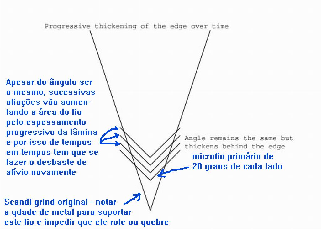 Membros cabraljr Postado Novembro 6, 2011 Membros Postado Novembro 6, 2011 Fenrir, Eu acredito que sim ( com uma exceção ), mas isto é algo de cunho pessoal, portanto outras pessoas podem ter visões diferentes e tão corretas quanto. A exceção seriam as lâminas com desbaste e por consequência fio convexos, pois este tipo de fio já é naturalmente mais robusto, infelizmente tal robustez também se traduz num dos piores fios em termos de habilidade de corte; isto é algo que algum dia teremos que esclarecer também: toda lâmina com boa habilidade de corte é uma lâmina afiada, mas nem toda lâmina afiada tem boa habilidade de corte! Vou tentar explicar um pouco mais detalhadamente. Vamos tomar o exemplo das Moras por você citadas. Normalmente elas vem com aquele scandi grind que geralmente é de 20 graus inclusos, ou seja, 10 graus de cada lado. Este é um fio excelente, extremamente agudo e que tem uma habilidade de corte muito grande ( o fio apenas ). Uma das melhores formas de se visualizar isto é fazendo um pequeno experimento. Com uma destas balanças digitais de cozinha ou mesmo estas de banheiro ( digitais ou mecânicas ), você posiciona uma armação em "U" e coloca uma borracha no fundo do "U" e uma cordinha de "seda" nas hastes do "U". Então posiciona a faca bem afiada nesta cordinha e fazendo o push cut, que é cortar sem movimentar a lâmina, apenas fazendo pressão para baixo medir o esforço/força ( KGF marcados pela balança ). Verá que obteve um número "x". Agora se você fizer um microfio primário neste scandi grind, digamos 20 graus de cada lado, ou seja 40 inclusos ( poderia ser também 15 graus de cada lado ou 30 inclusos ) e repetir o teste, verá que vai obter um número "y" maior, pois terá que fazer um pouco mais de força. Ora bolas então, por que diabos você iria querer um fio "pior" em desempenho que o que já vem de fábrica nas Moras? A resposta é muito simples: porque apesar de perder um pouco em habilidade de corte, ganha-se e muito em termos de durabilidade e retenção de fio, pelo simples fato de ter muito mais metal suportando o fio propriamente dito. Nas Moras particularmente eu acho importante fazer o microfio primário porque apesar do fio em sí ter uma grande habilidade de corte, a lâmina como um todo não tem esta mesma habilidade de corte devido ao seu perfil/desbaste, que apresenta uma boa parte desta lâmina com paredes paralelas que promoverão grande atrito no que estiver sendo cortado e com isso você terá que fazer mais força. Apesar de parecer que então se estaria somando duas caracteristicas "ruins", na verdade você não chega a perceber a "piora" do fio propriamente dito, porque ele fica mascarado pelo desempenho da lâmina como um todo. Lembrar que este princípio só se aplica se você estiver cortando algo que tenha espessura igual ou maior que a largura da lâmina da Mora, porque se a espessura for menor que o scandi grind propriamente dito, ai sim você conseguirá perceber a diferença. Traduzindo: no teste da balança com uma cordinha você perceberá a diferença. Se o mesmo teste for feito com uma corda de 1 polegada ( espessura igual ou maior que a largura da lâmina ) o efeito de arrasto/atrito da lâmina na corda mascarará a diferença do fio. Além de aumentar a robustez do fio, esta técnica ainda tem como vantagem adicional a facilidade no retoque do fio, pois se você imaginar a quantidade de aço que tem que ser removido no micro fio para retorná-lo a um estado de fatiar cabelo e a quantidade de aço que teria que remover de TODO o scandi grind ( deitar a lâmina "flat" com relação ao scandi na pedra ) para voltar a obter aquele fio de navalha. Como última vantagem adicional está a economia de lâmina/aço, já que a vida útil da lâmina será maior devido ao menor desgaste geral. Comprove por você mesmo. Use sua Mora em uma tarefa com madeira por exemplo, com o fio original. Depois confira se houve rolamento ou ocorrência de micro-dentes. Faça então um microfio primário de 15 ou 20 graus de cada lado, repita a tarefa de corte e verifique a ocorrência ou não de rolamento e micro-dentes. Você pode começar com 15 graus e ver como cada aço em cada faca se comporta. O Vg10 dos Spyderco por exemplo tende a formar micro-dentes com 15 graus, o que não ocorre com 20 ( desbaste padrão de alívio de 10 graus de cada lado em ambos os casos ). E assim com diversos aços. O ZDP-189 também da Spyderco suporta tranquilinho 15 graus de cada lado com desbaste de alívio de 10 graus de cada lado sem rolar e sem fraturar ( micro-dentes ). A decisão final envolve o tipo de lâmina, tipo de aço, tratamento térmico e utilização pretendida. Simples, só um pouquinho complicado! Citar